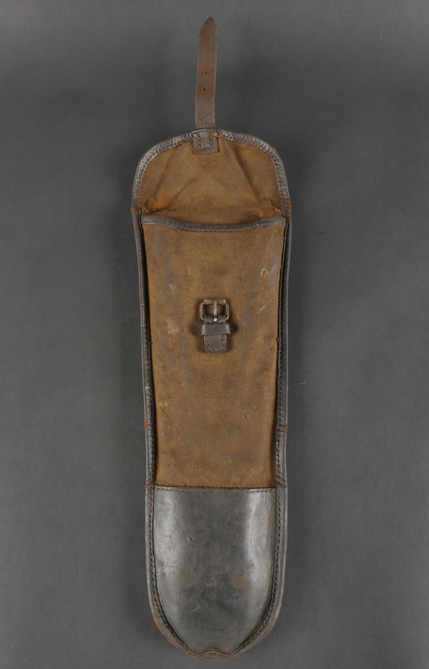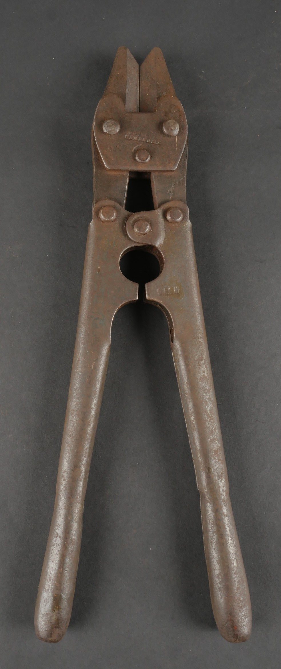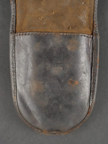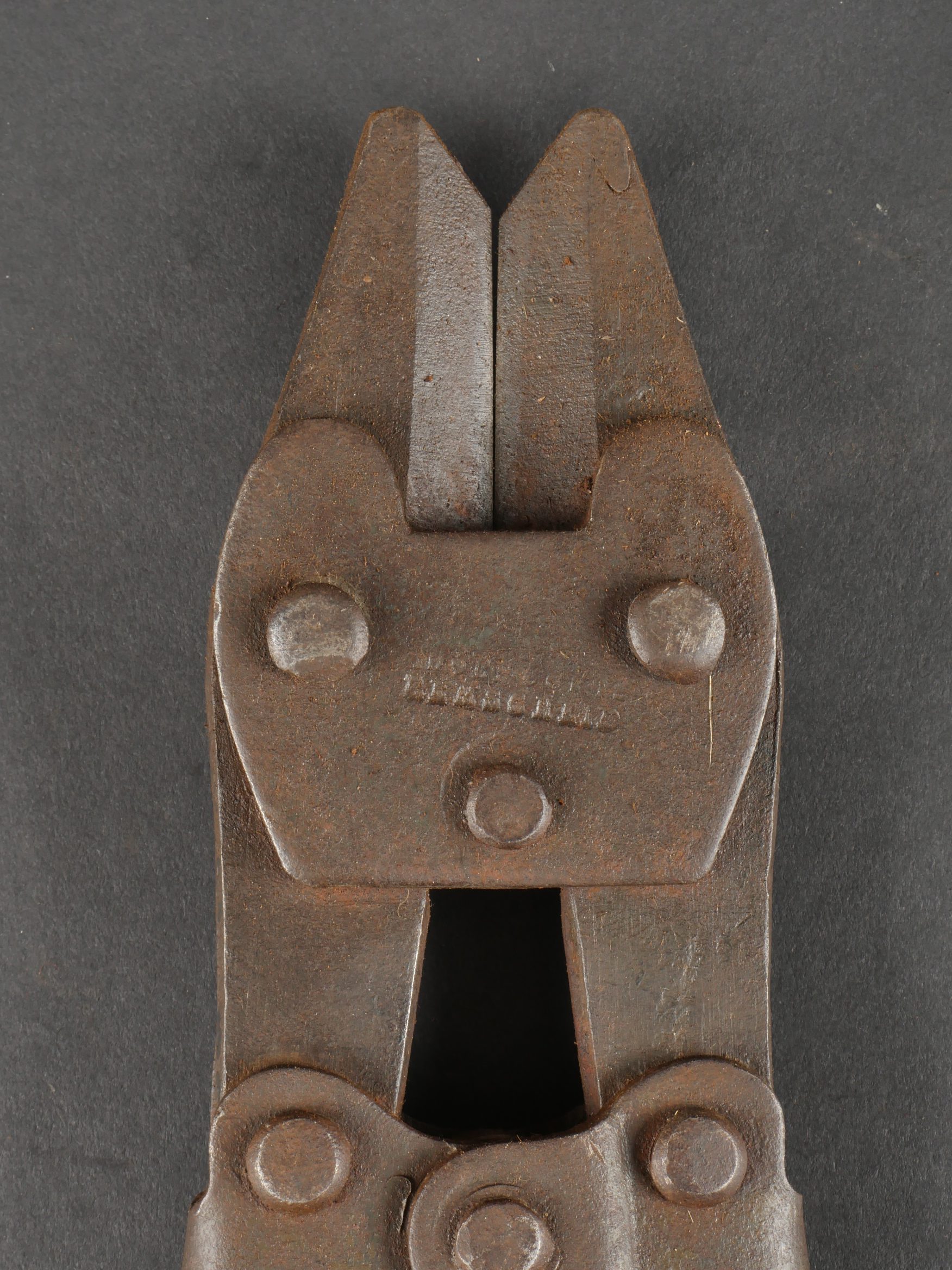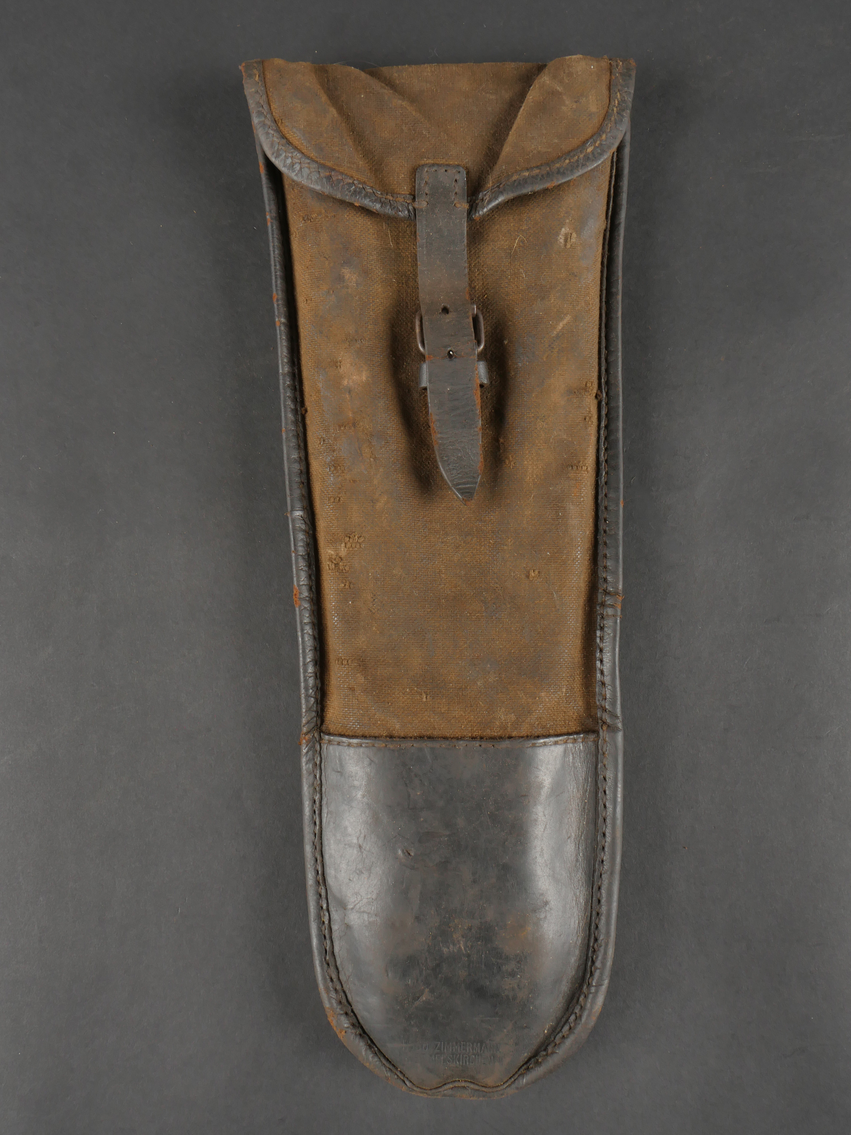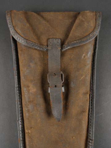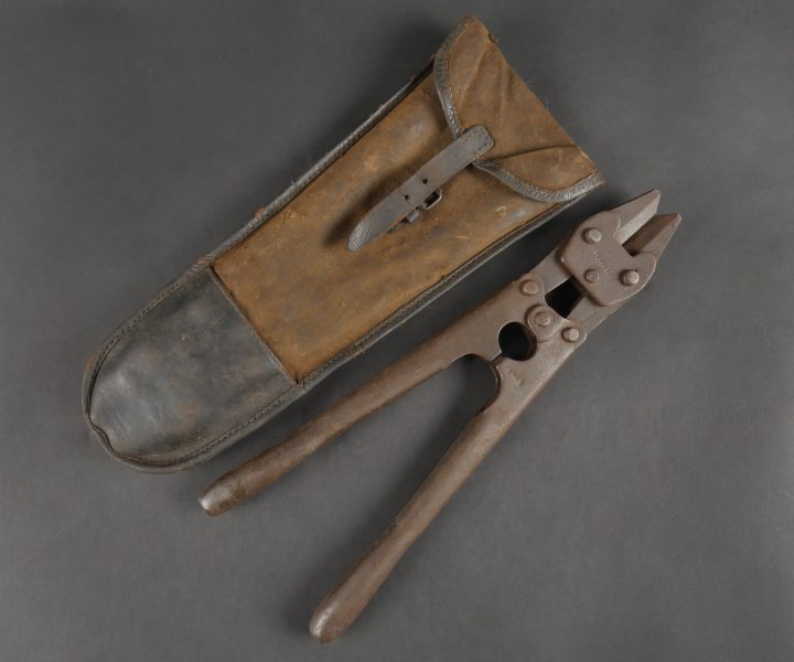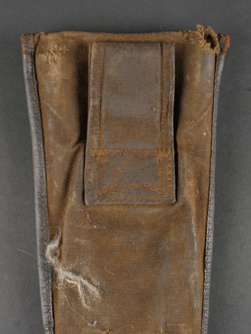 Pince coupante allemande dans son étui en toile. Pince modèle moyen, tout en métal, fonctionnelle, restes de peinture feldgrau. Marquage d’un fabricant de Remsheid, et marquage DRGM. Etui en toile renforcé de cuir. Sanglon de fermeture cuir. Passant de ceinturon en toile. Etui sale, graisse. German Wire Cutters with Canvas Pouch Medium-sized all-metal wire cutters, functional, with remnants of field-grey paint. Marked by a manufacturer in Remscheid and stamped DRGM. Reinforced canvas and leather case with closing strap and belt loop. Case dirty and greasy.