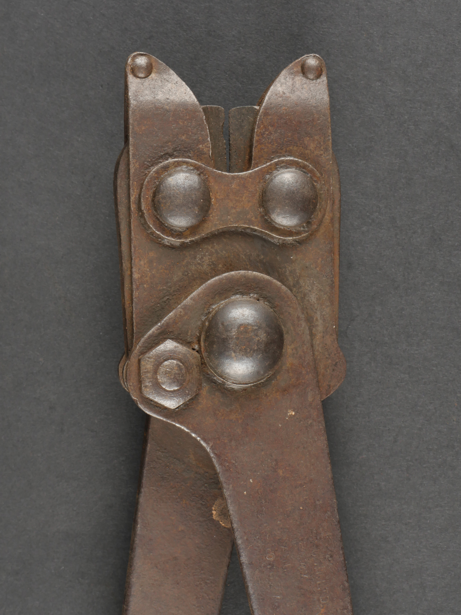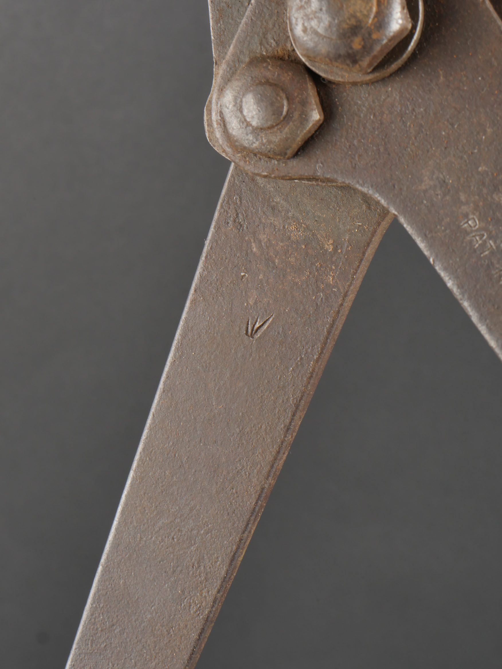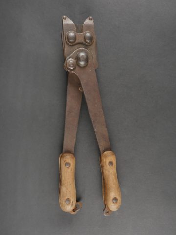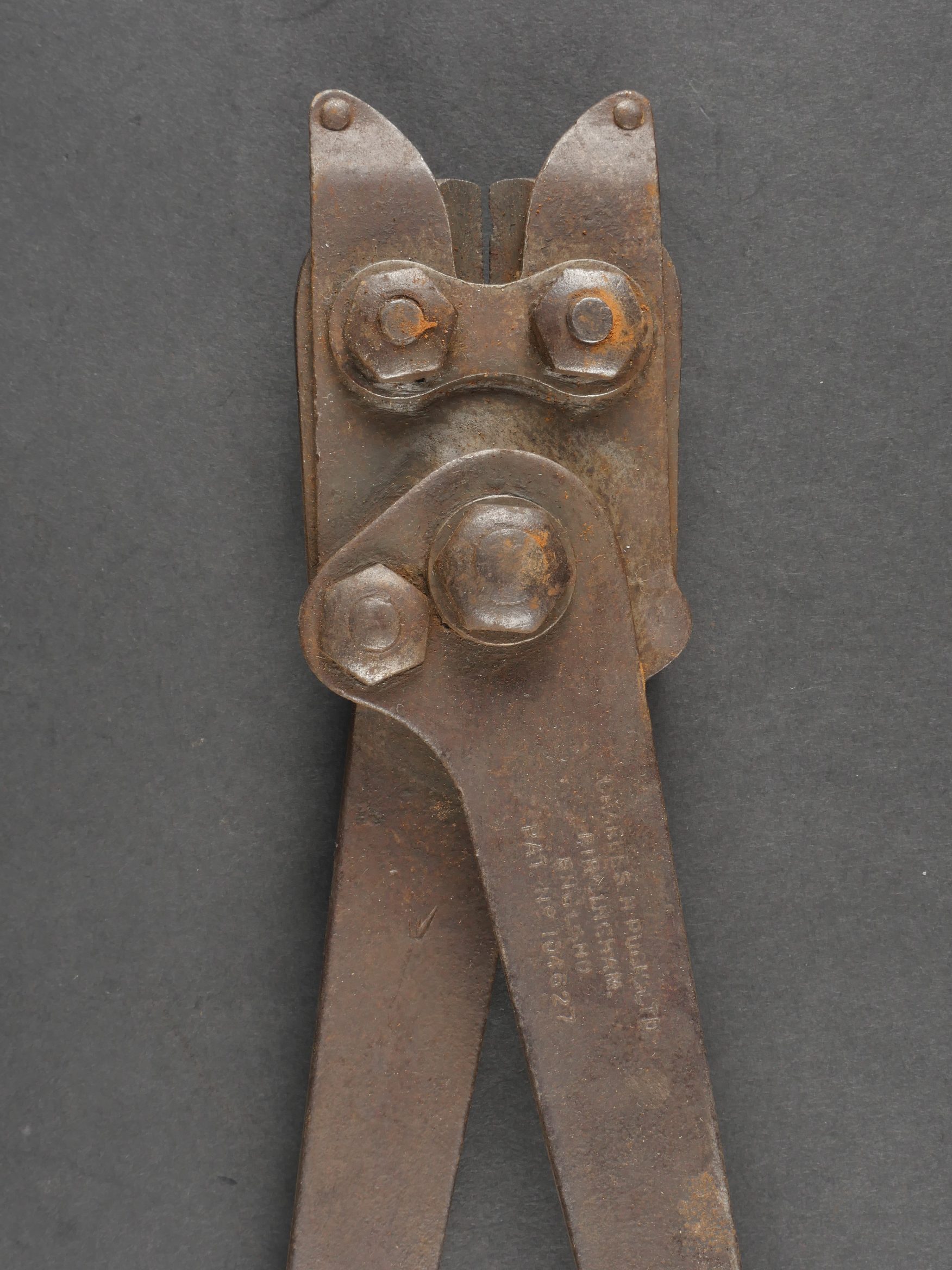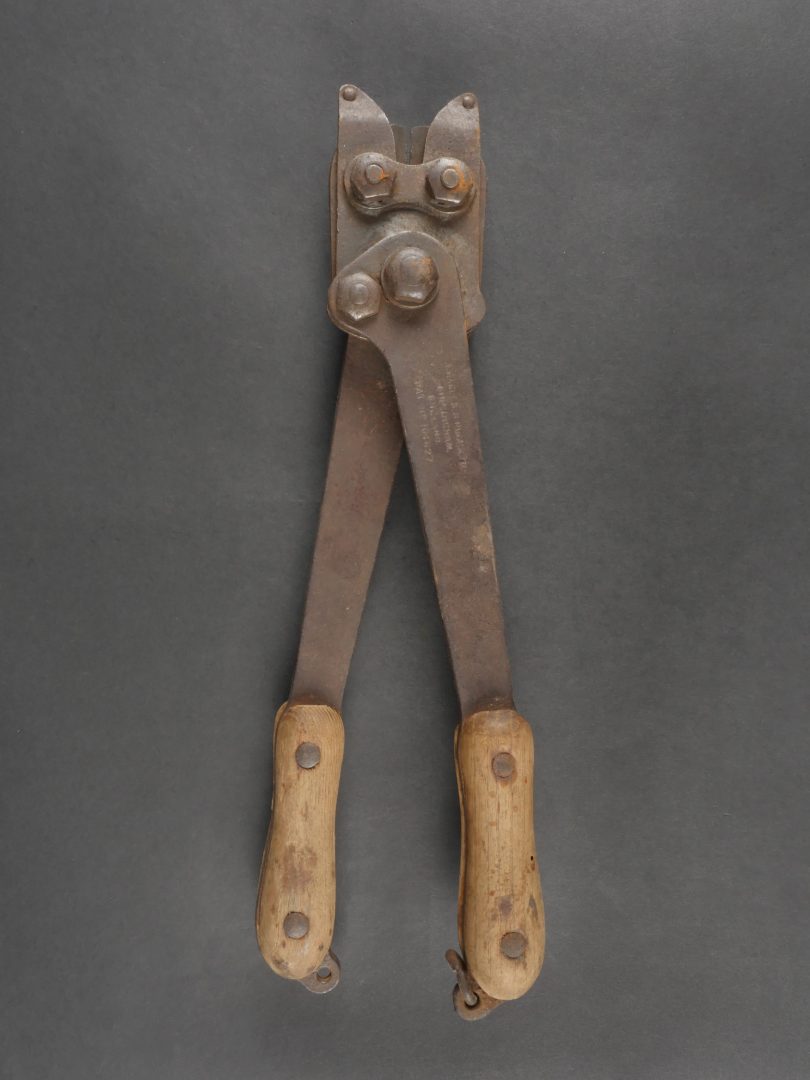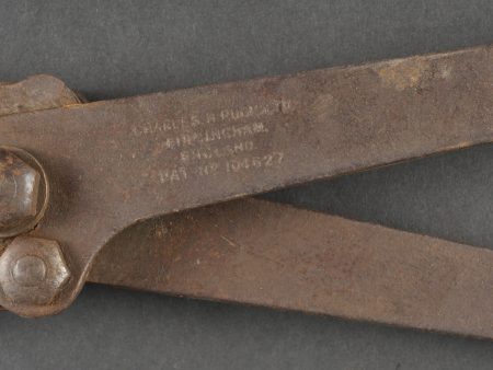 Pince coupante anglaise. Modèle moyen à poignées bois. Marquage fabricant sur un des bras CHARLES H. PUCH LTD BIRMINGHAM ENGLAND avec numéro de brevet. Relativement bon état. British Wire CuttersMedium model with wooden handles. Maker’s mark “CHARLES H. PUCH LTD BIRMINGHAM ENGLAND” with patent number. Overall good condition.