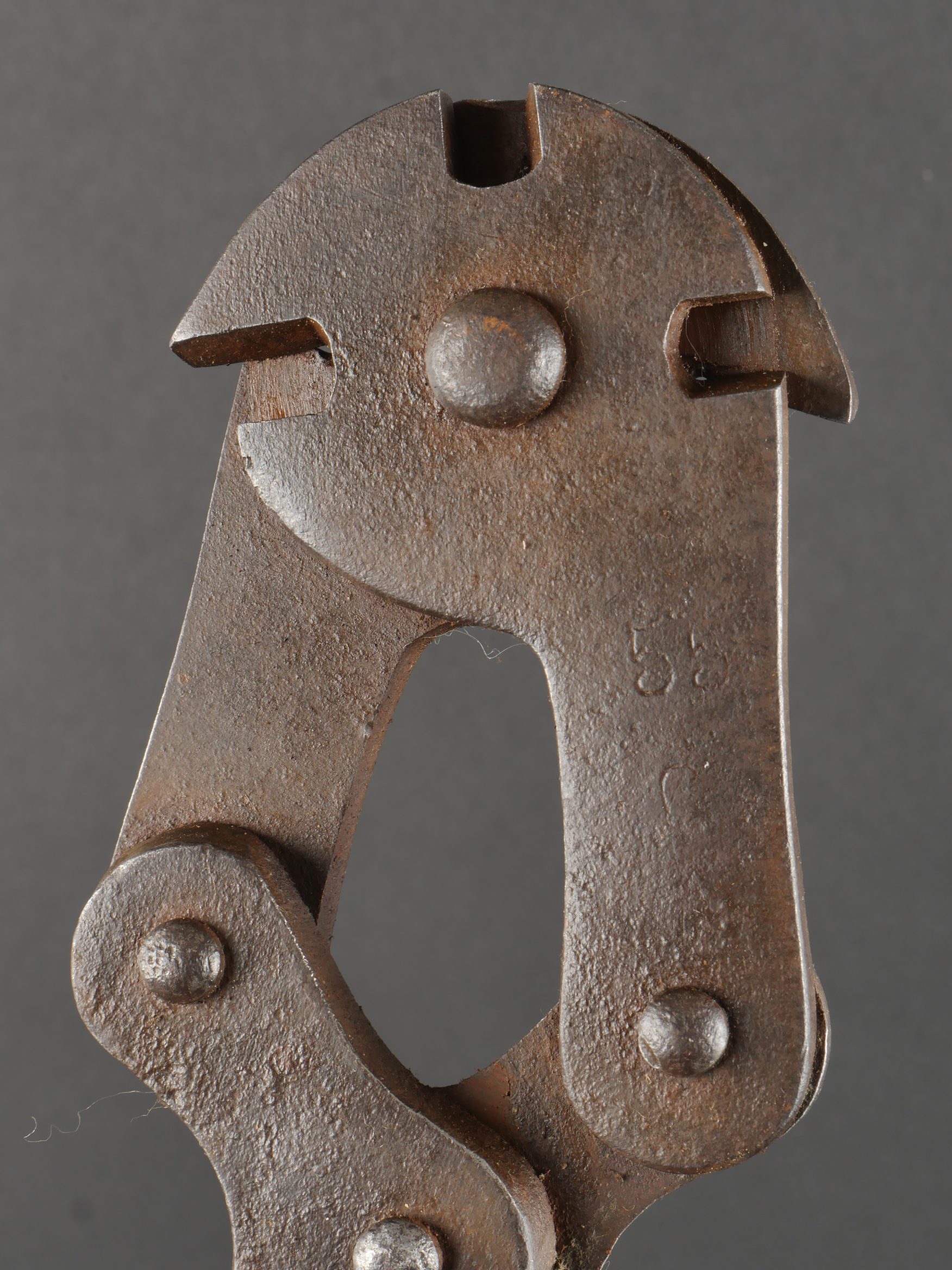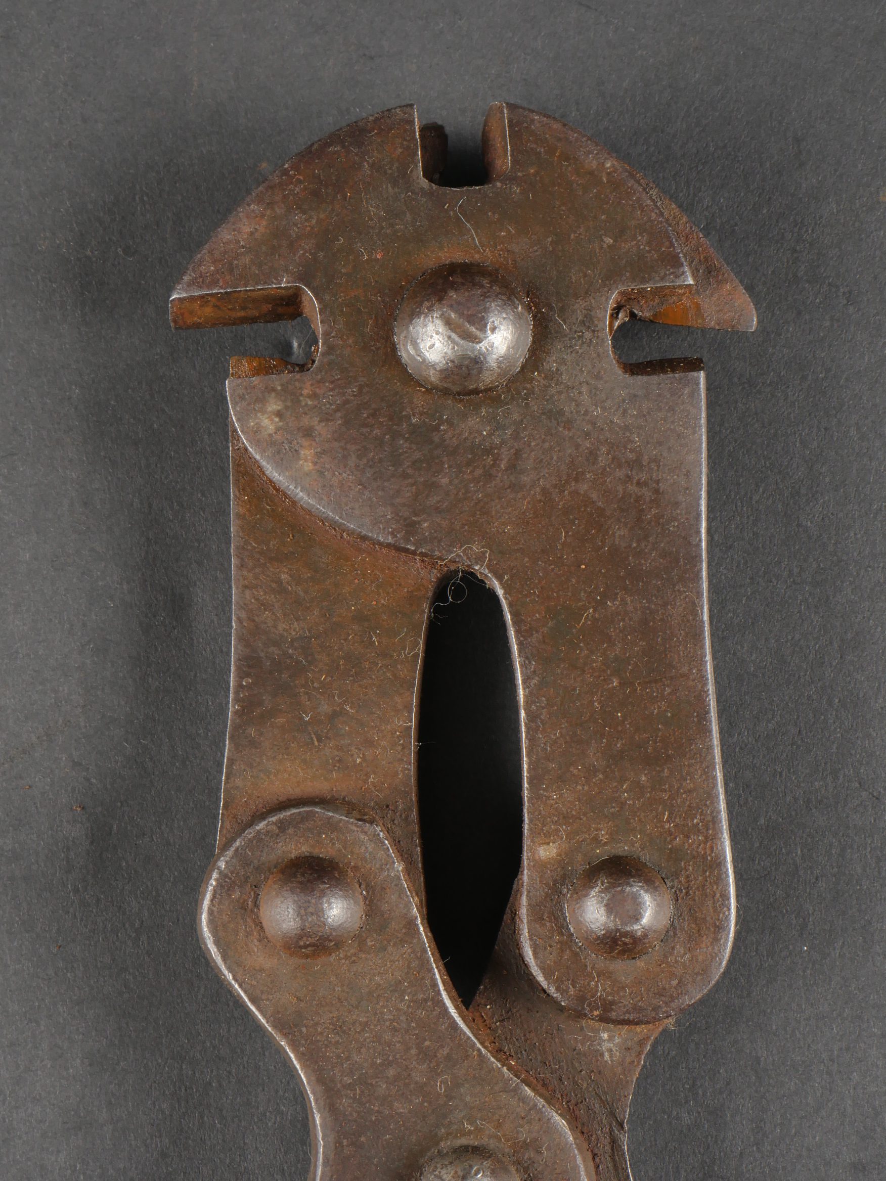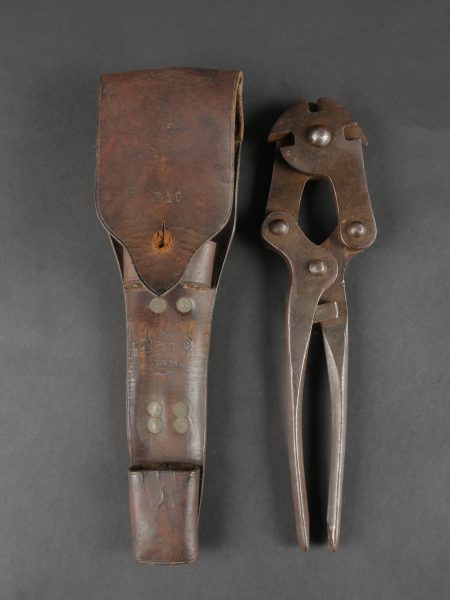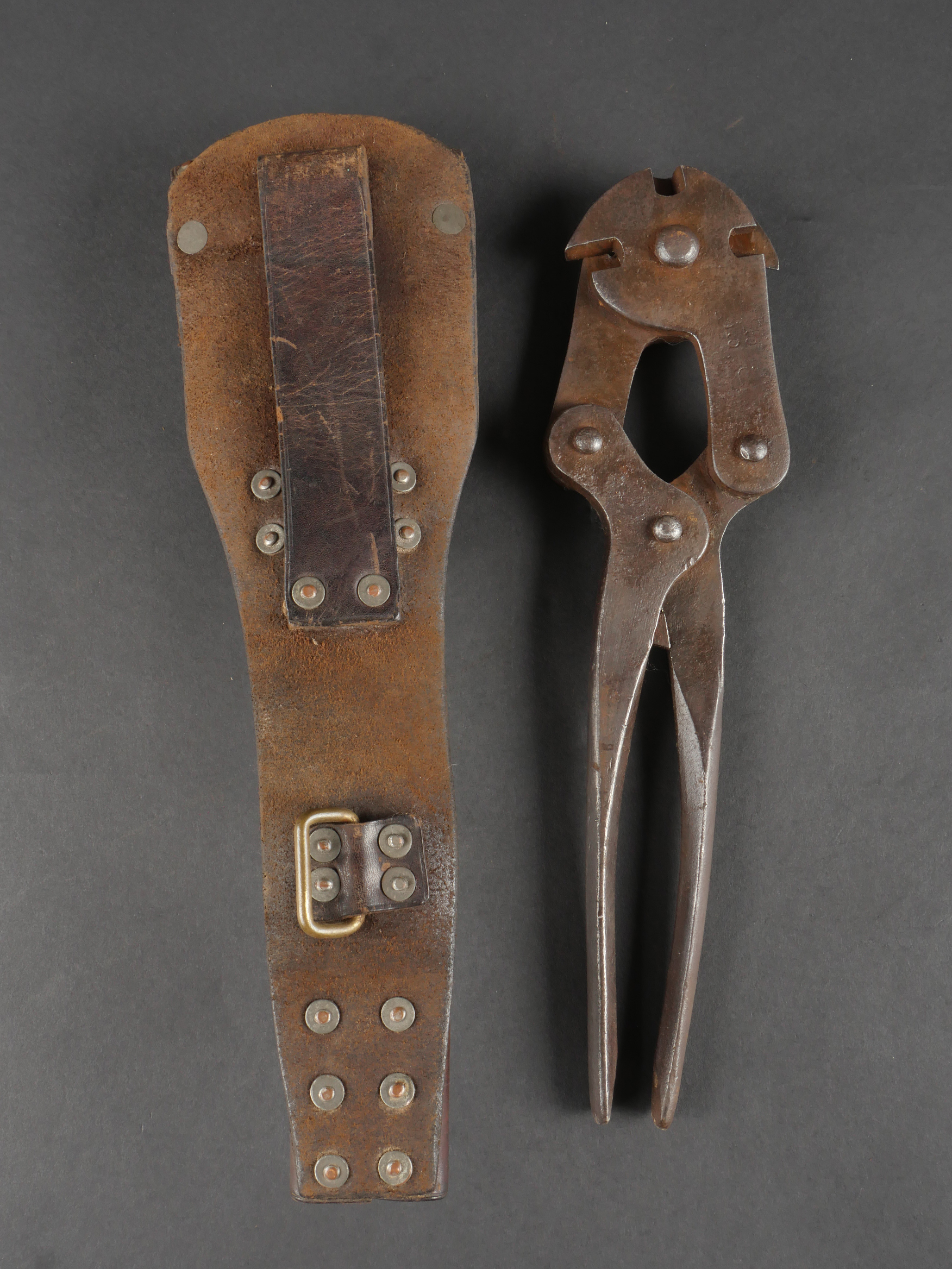 Pince coupante anglaise dans son étui cuir pattern 1914. pince en fer, fonctionnelle, un marquage 55 C. Etui en cuir marron riveté, marqué CGHF, Broad Arrow et daté 1914. Marquage sur le rabat I BAC. L’anneau arrière est bien présent, le cuir est encore souple et en bon état. British Wire Cutters in Leather Sheath, Pattern 1914Functional iron wire cutters marked “55 C.” Brown riveted leather sheath marked “CGHF,” Broad Arrow and dated 1914. Flap stamped “I BAC.” Rear belt ring intact, leather supple and in good condition.