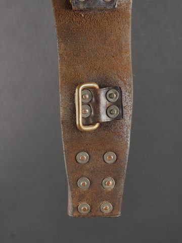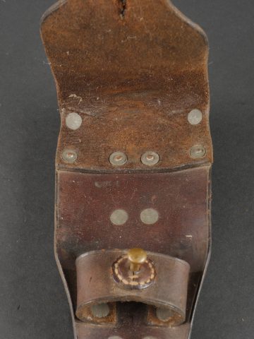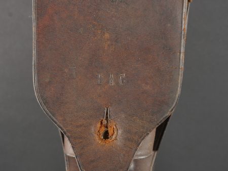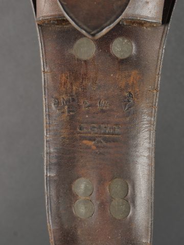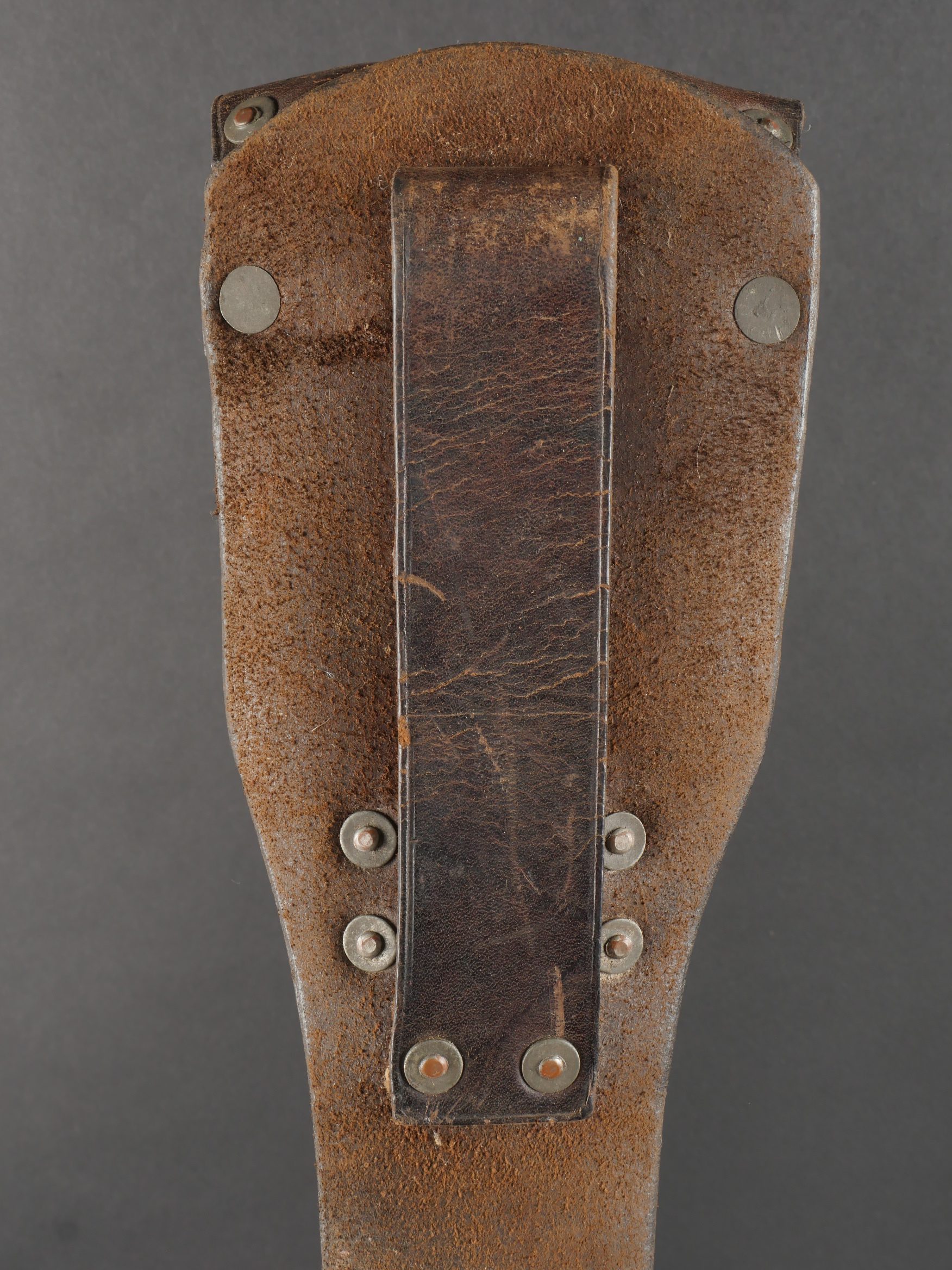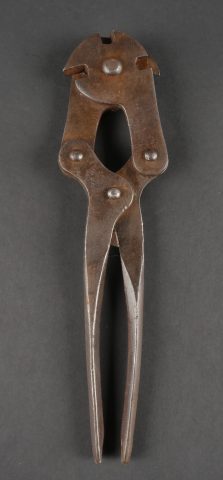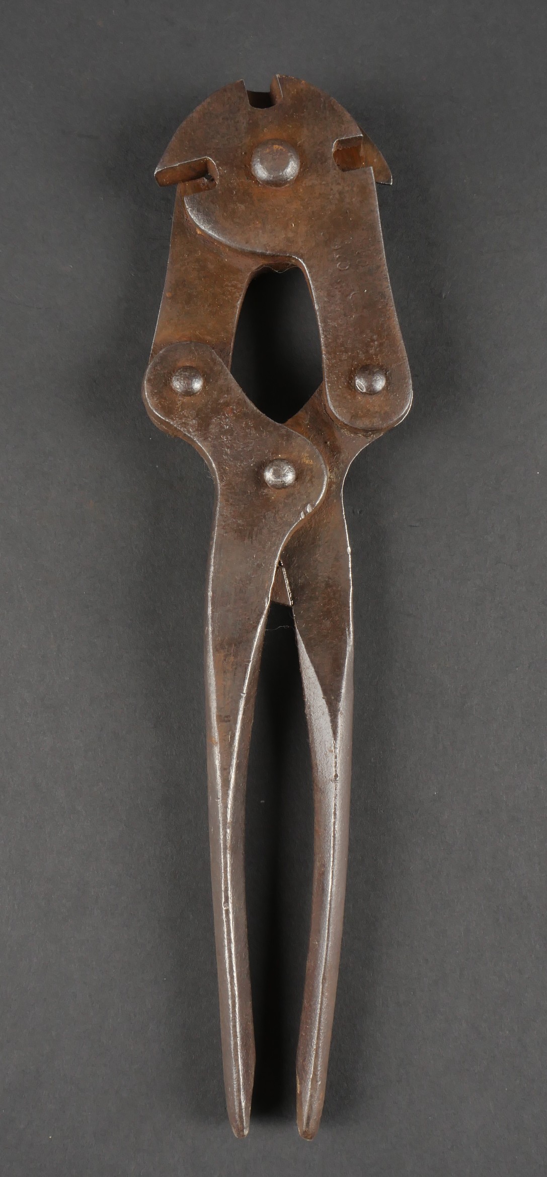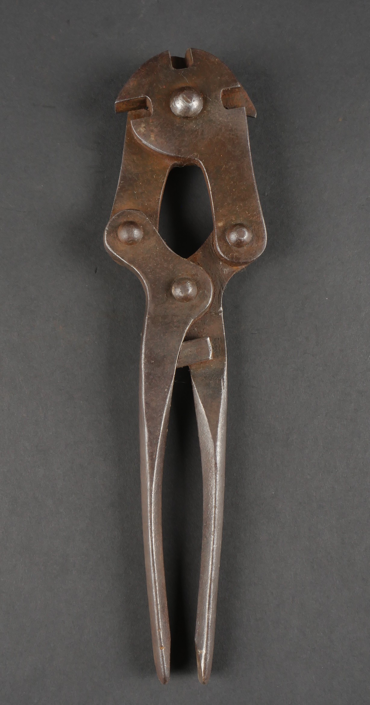 Pince coupante anglaise dans son étui cuir pattern 1914. pince en fer, fonctionnelle, un marquage 55 C. Etui en cuir marron riveté, marqué CGHF, Broad Arrow et daté 1914. Marquage sur le rabat I BAC. L’anneau arrière est bien présent, le cuir est encore souple et en bon état. British Wire Cutters in Leather Sheath, Pattern 1914Functional iron wire cutters marked “55 C.” Brown riveted leather sheath marked “CGHF,” Broad Arrow and dated 1914. Flap stamped “I BAC.” Rear belt ring intact, leather supple and in good condition.