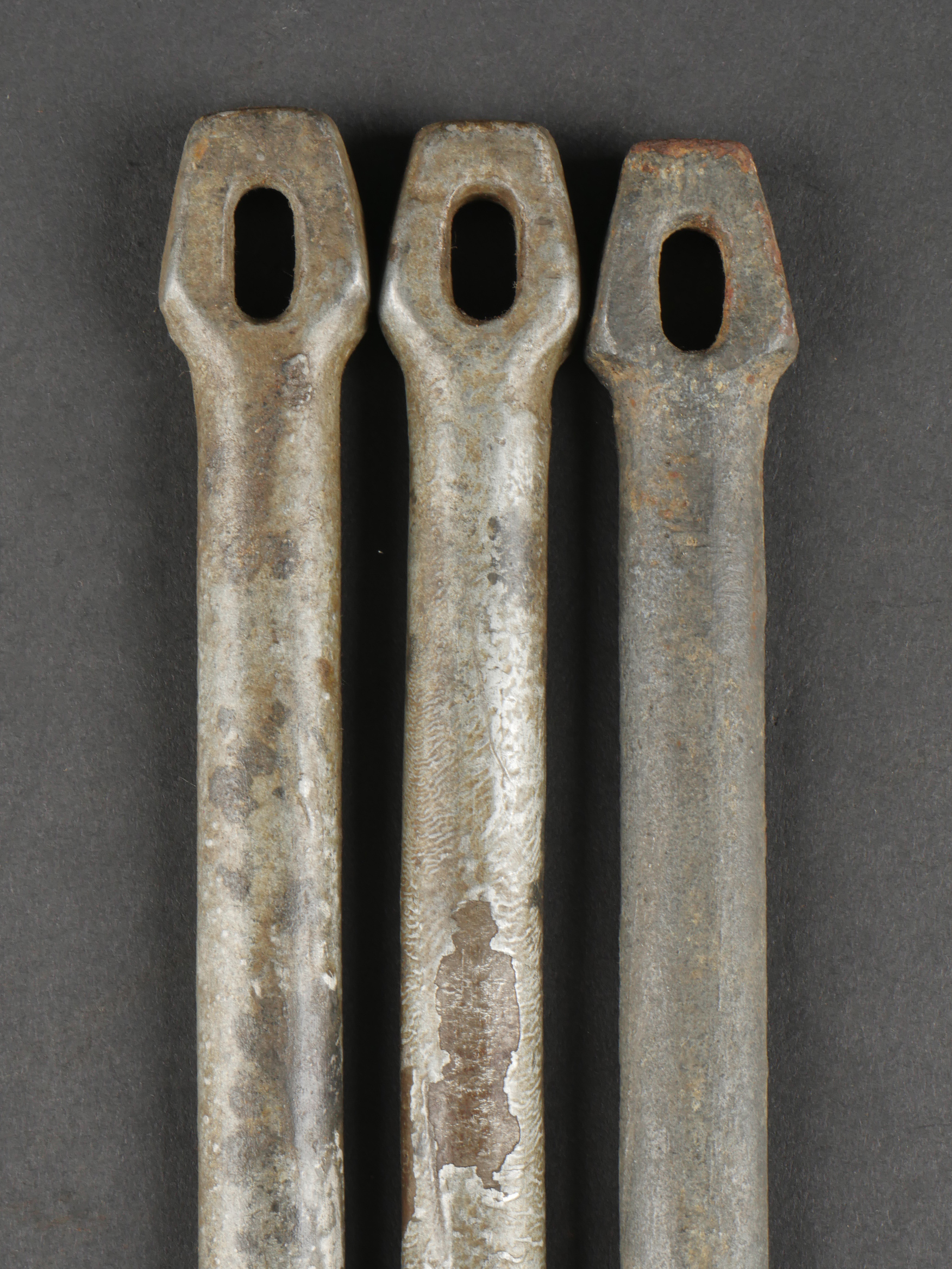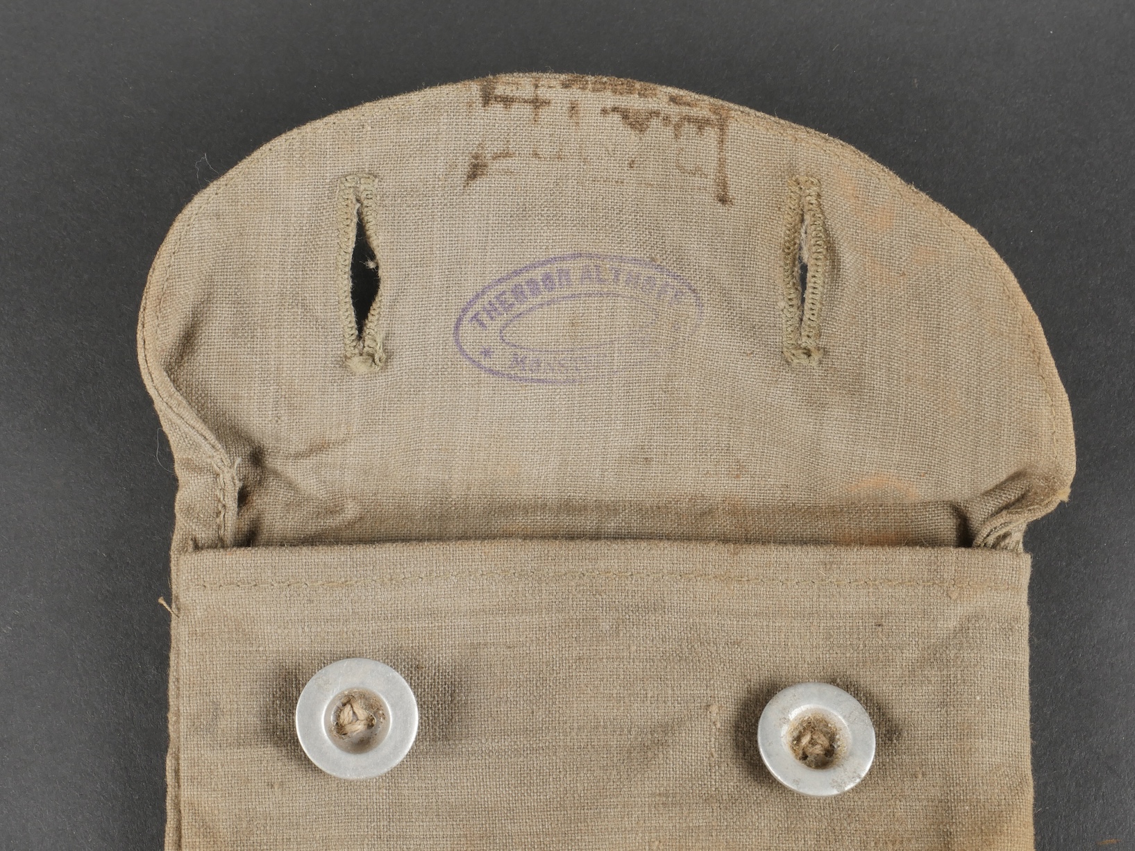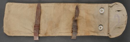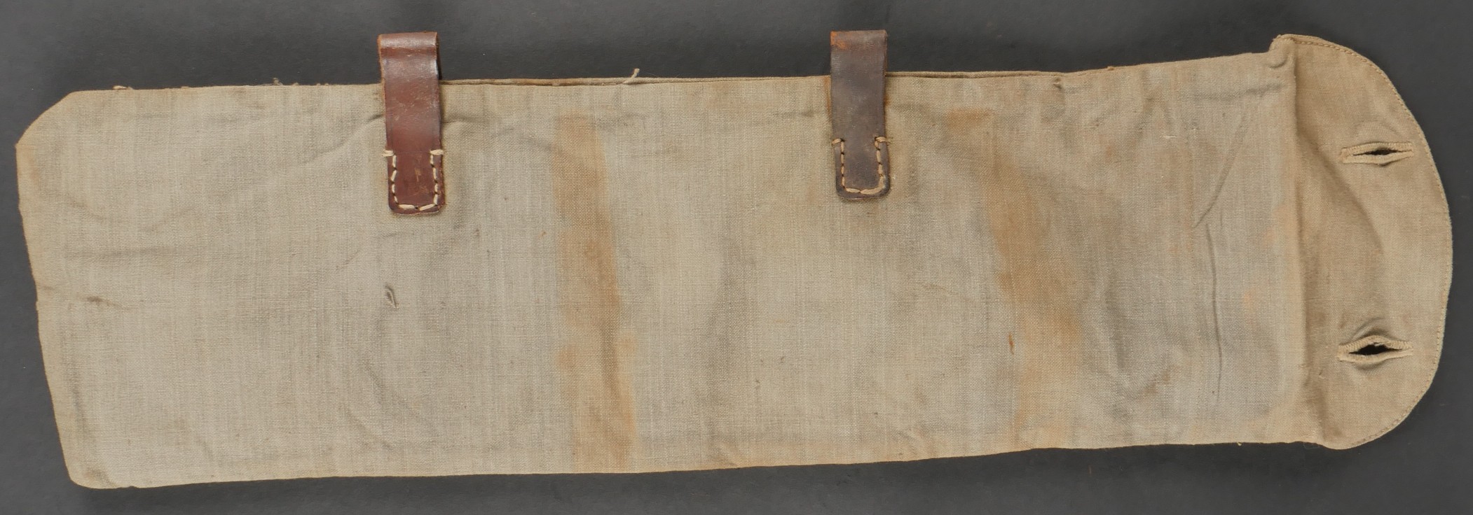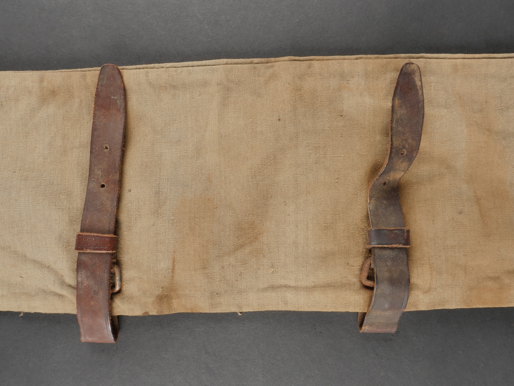 Piquets de tente avec leur housse en toile feldgrau. Housse en toile verte, avec ses sangles en cuir marron, ses boutons aluminium, réceptionnée au BA VII et marquage fabricant. Contenant 2 éléments de mât en bois, sans marquage visible, parties métalliques oxydées, et 3 piquets métalliques, tous datés 1ère guerre, 1916 et 1918. Usure d’usage, bon état. Tent Poles and Pegs with Field-Grey Canvas Case Green canvas case with brown leather straps, aluminum buttons, accepted at BA VII and maker marked. Contains two unmarked wooden pole sections with oxidized metal fittings and three metal pegs dated 1916 and 1918. Signs of use, good condition.