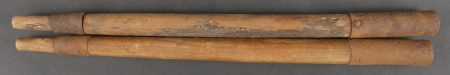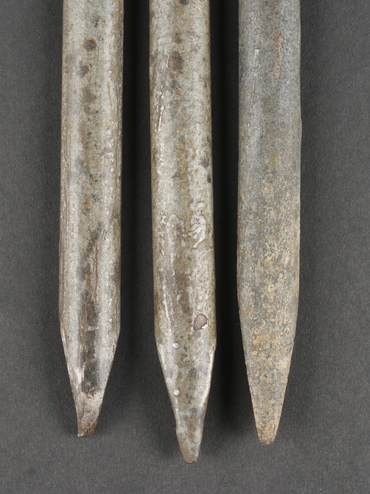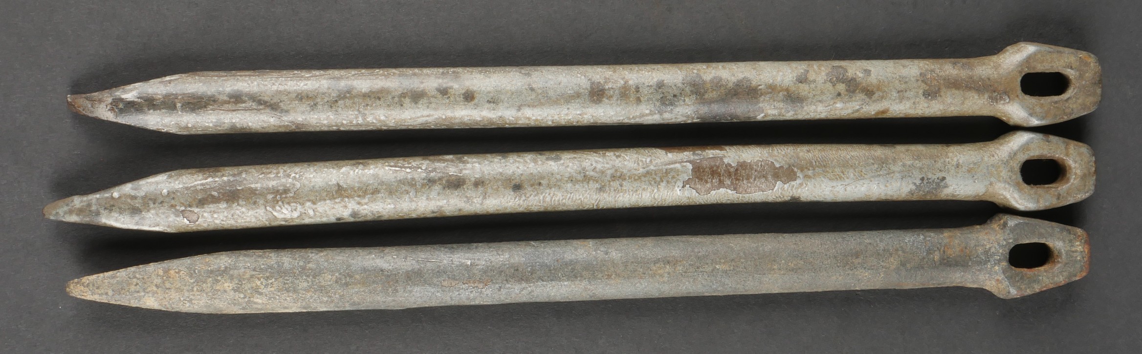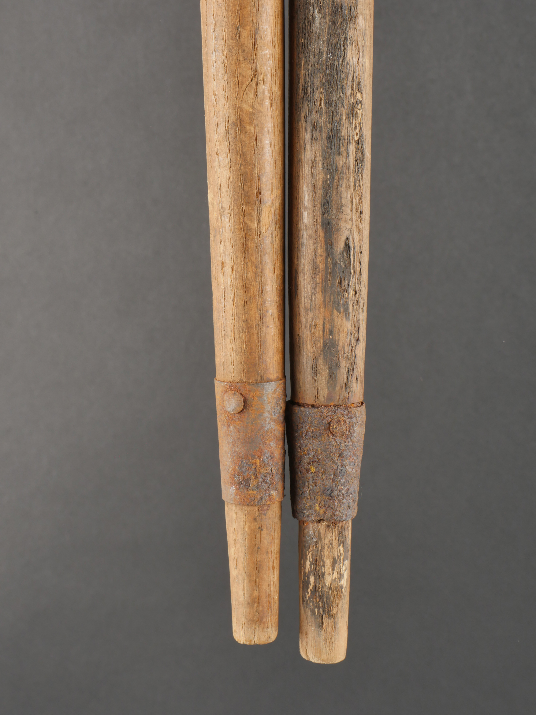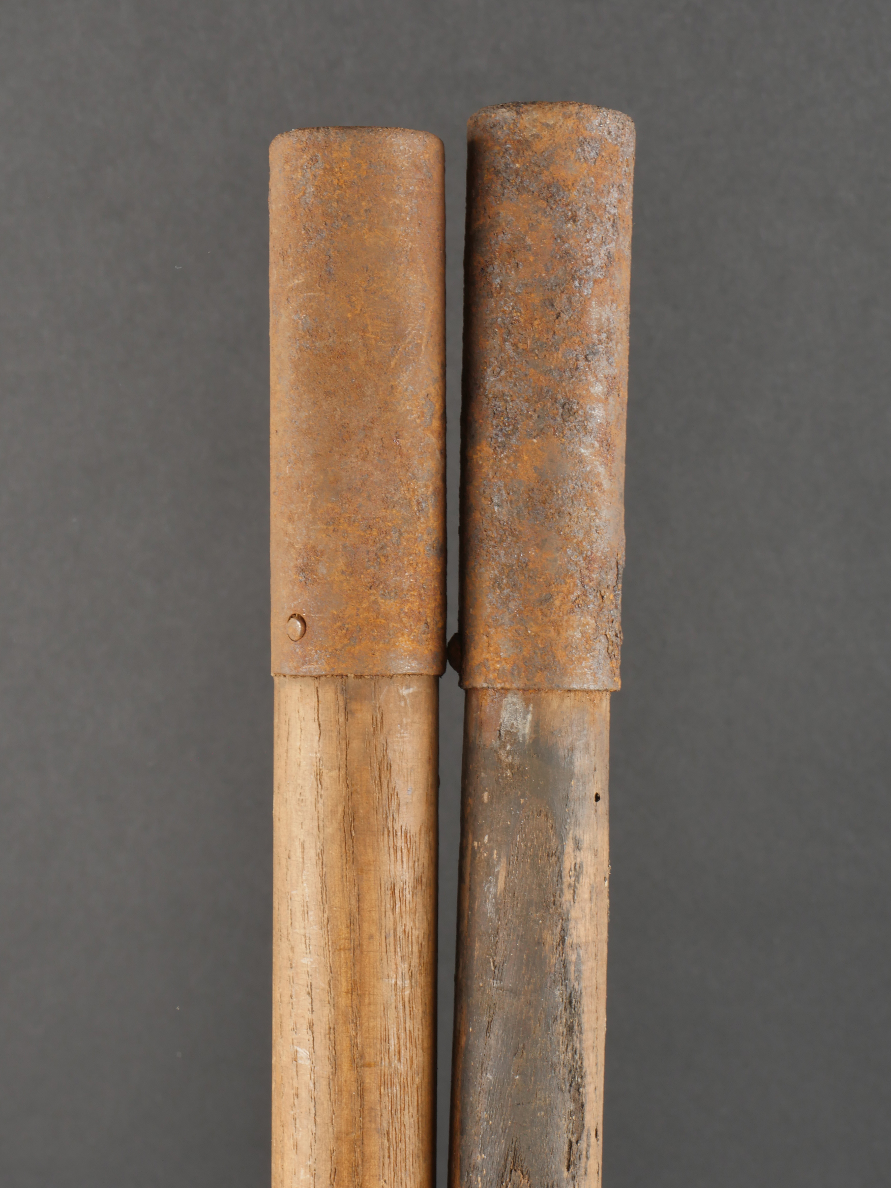 Piquets de tente avec leur housse en toile feldgrau. Housse en toile verte, avec ses sangles en cuir marron, ses boutons aluminium, réceptionnée au BA VII et marquage fabricant. Contenant 2 éléments de mât en bois, sans marquage visible, parties métalliques oxydées, et 3 piquets métalliques, tous datés 1ère guerre, 1916 et 1918. Usure d’usage, bon état. Tent Poles and Pegs with Field-Grey Canvas Case Green canvas case with brown leather straps, aluminum buttons, accepted at BA VII and maker marked. Contains two unmarked wooden pole sections with oxidized metal fittings and three metal pegs dated 1916 and 1918. Signs of use, good condition.