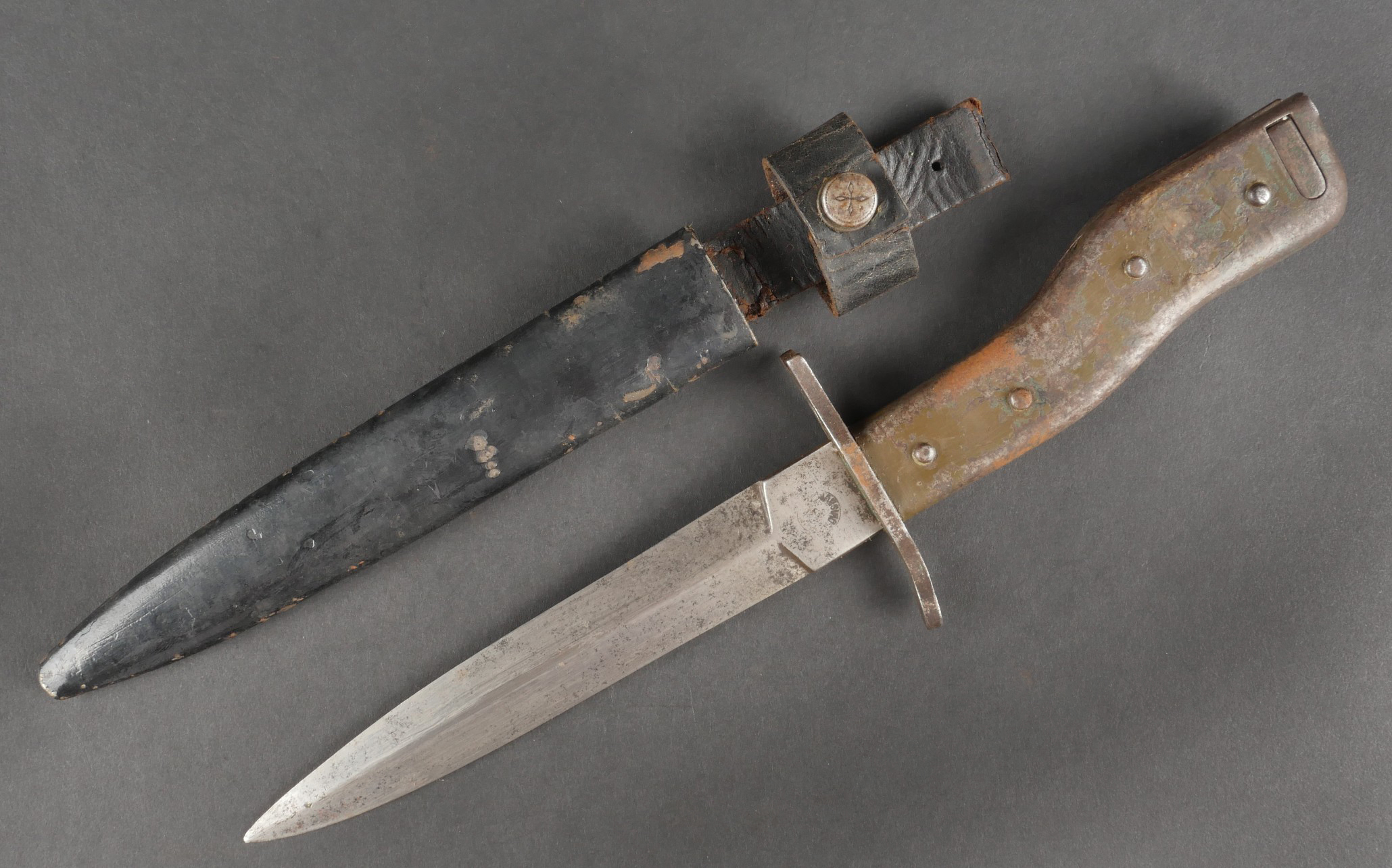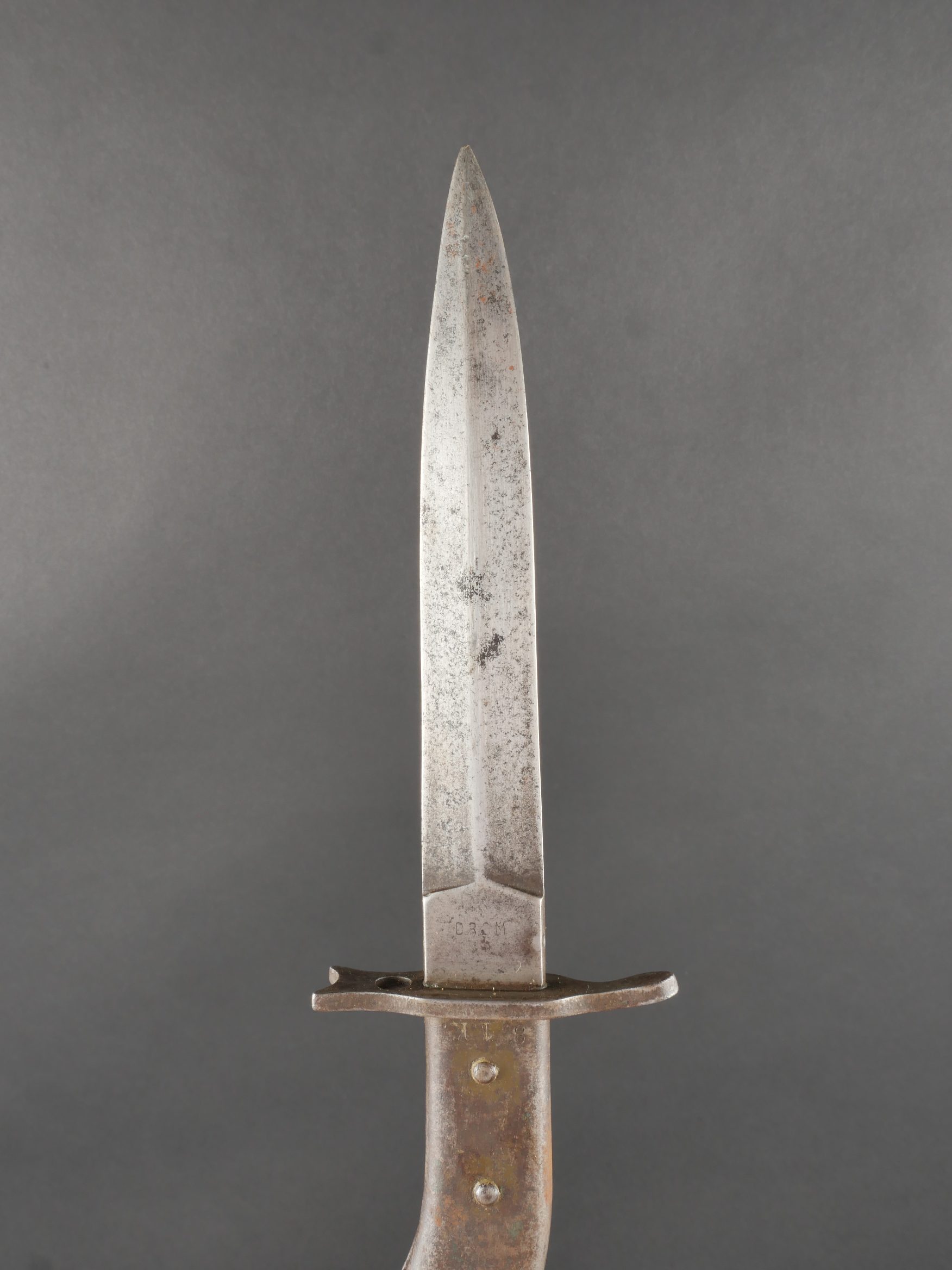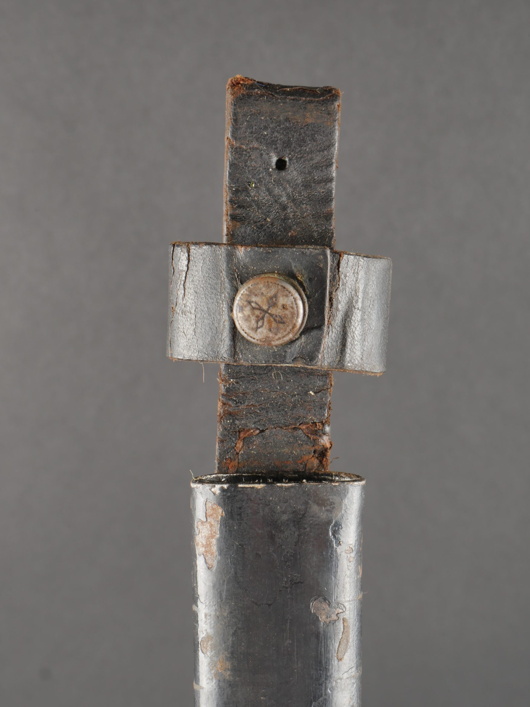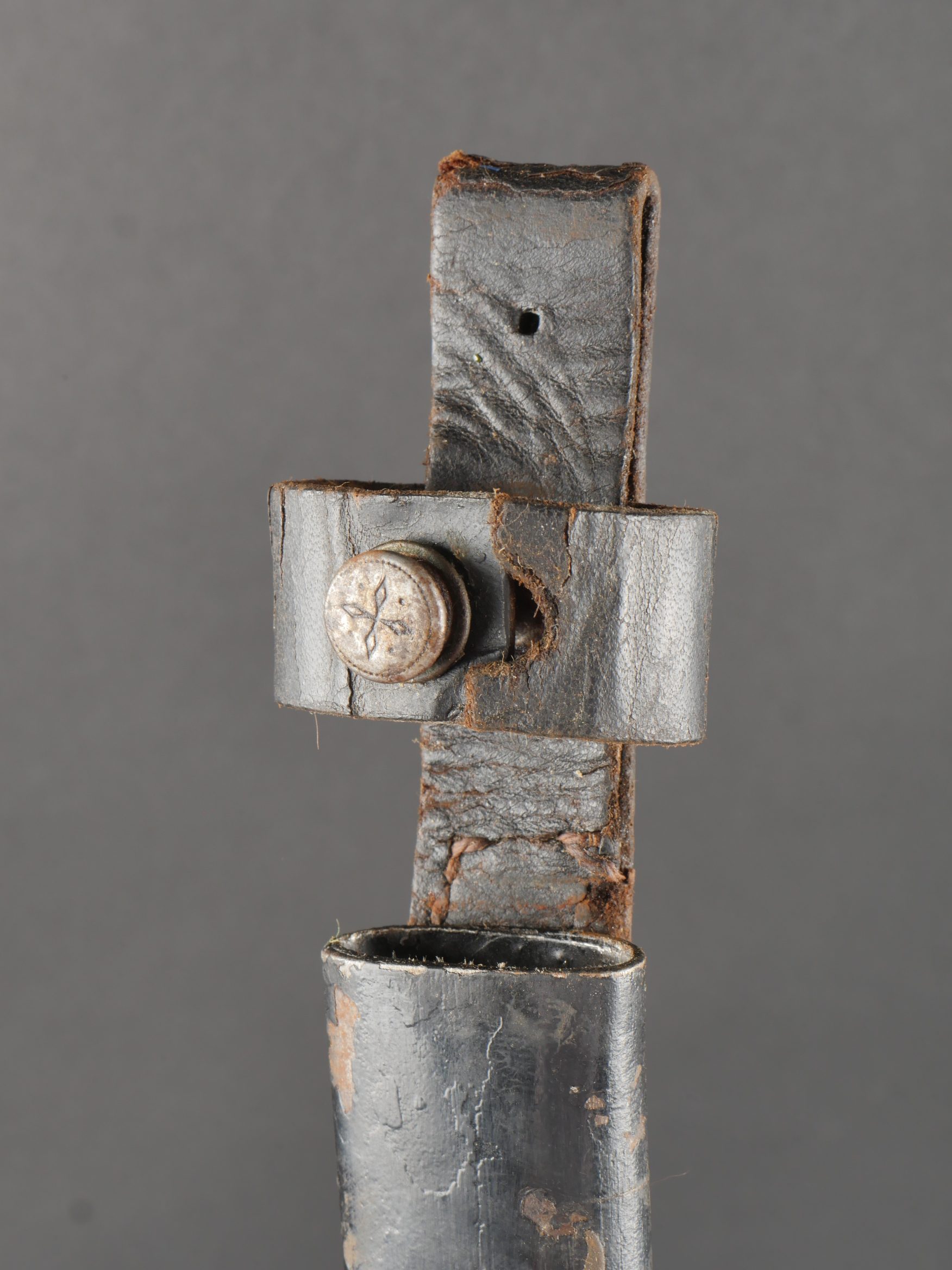 Poignard baïonnette DEMAG régimenté. Lame en relativement bon état, marquage DRGM d’un côté, DEMAG Duisburg de l’autre, usure. Poignée moulée en fer avec de bons restes de peinture feldgrau. Régimentée d’un côté près de la croisière 8. 1. K.1ère compagnie du 8ème ? peut-être 8ème d’infanterie bavarois? Poussoir fonctionnel. Avec son fourreau laqué noir avec son passant de ceinturon riveté, sangle de maintien présente mais bouton pression détaché d’un côté. Usure d’usage. Regimental DEMAG Trench Knife/Bayonet Blade in fairly good condition, marked “DRGM” on one side and “DEMAG Duisburg” on the other. Cast iron handle with good remnants of field-grey paint. Regimental marking near crossguard “8. 1. K.” possibly for 1st Company, 8th Bavarian Infantry Regiment. Functional catch. Black lacquered scabbard with riveted belt loop, retaining strap present but snap fastener detached on one side. Signs of use.