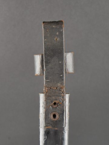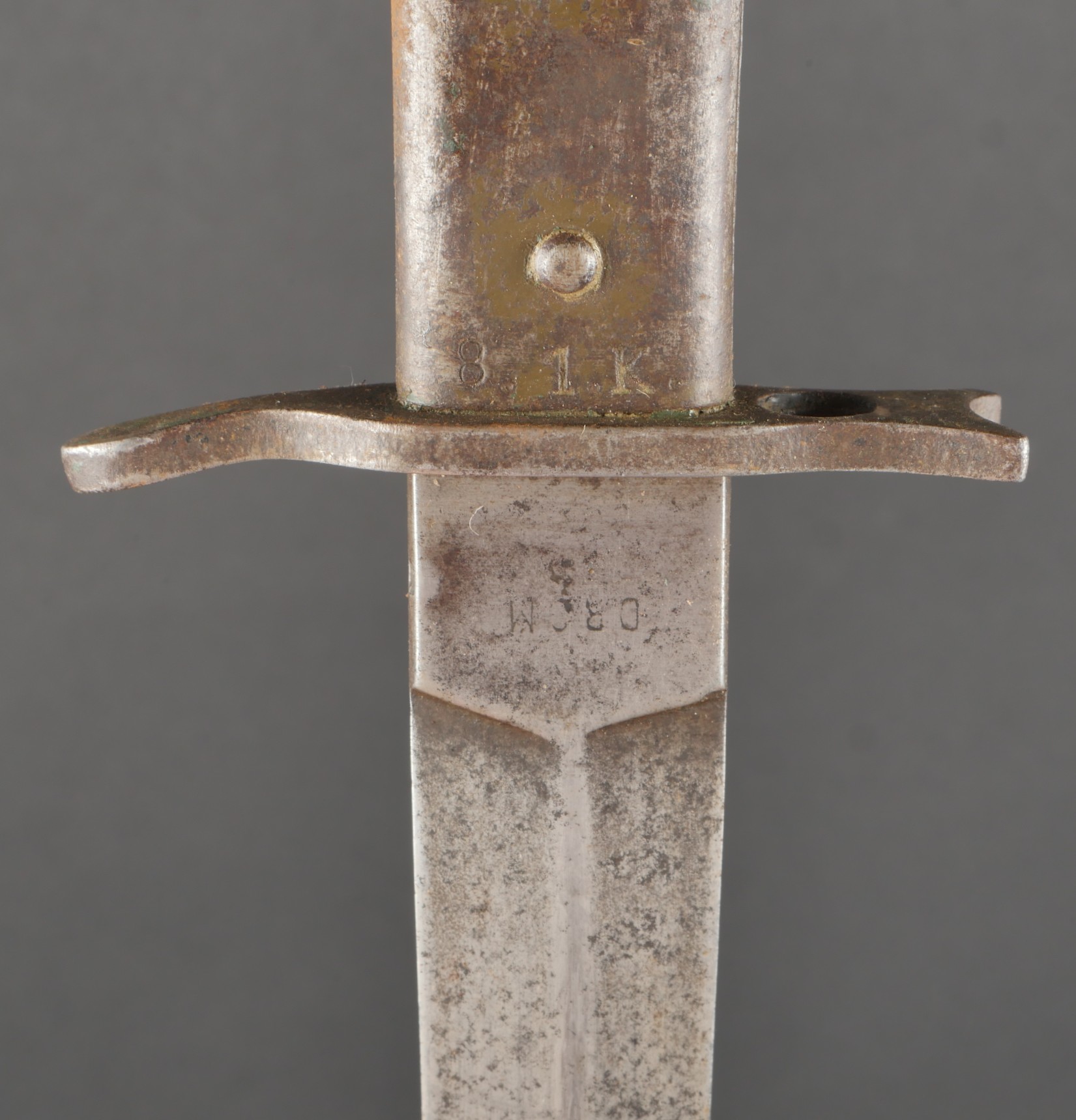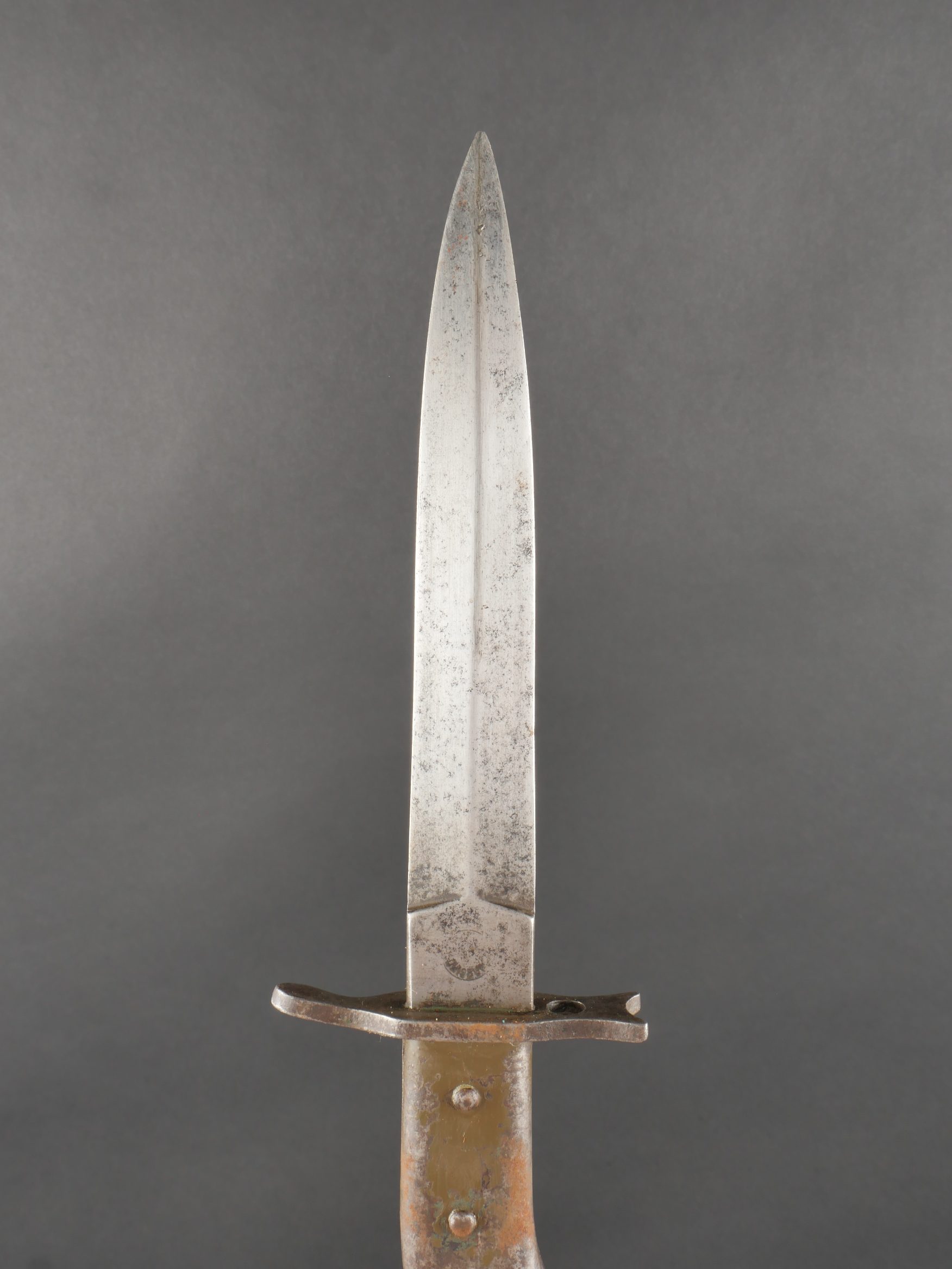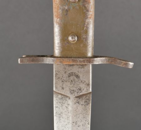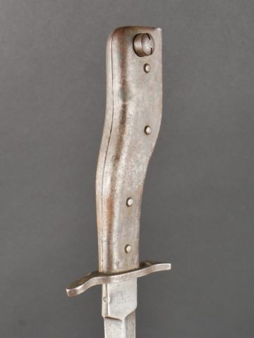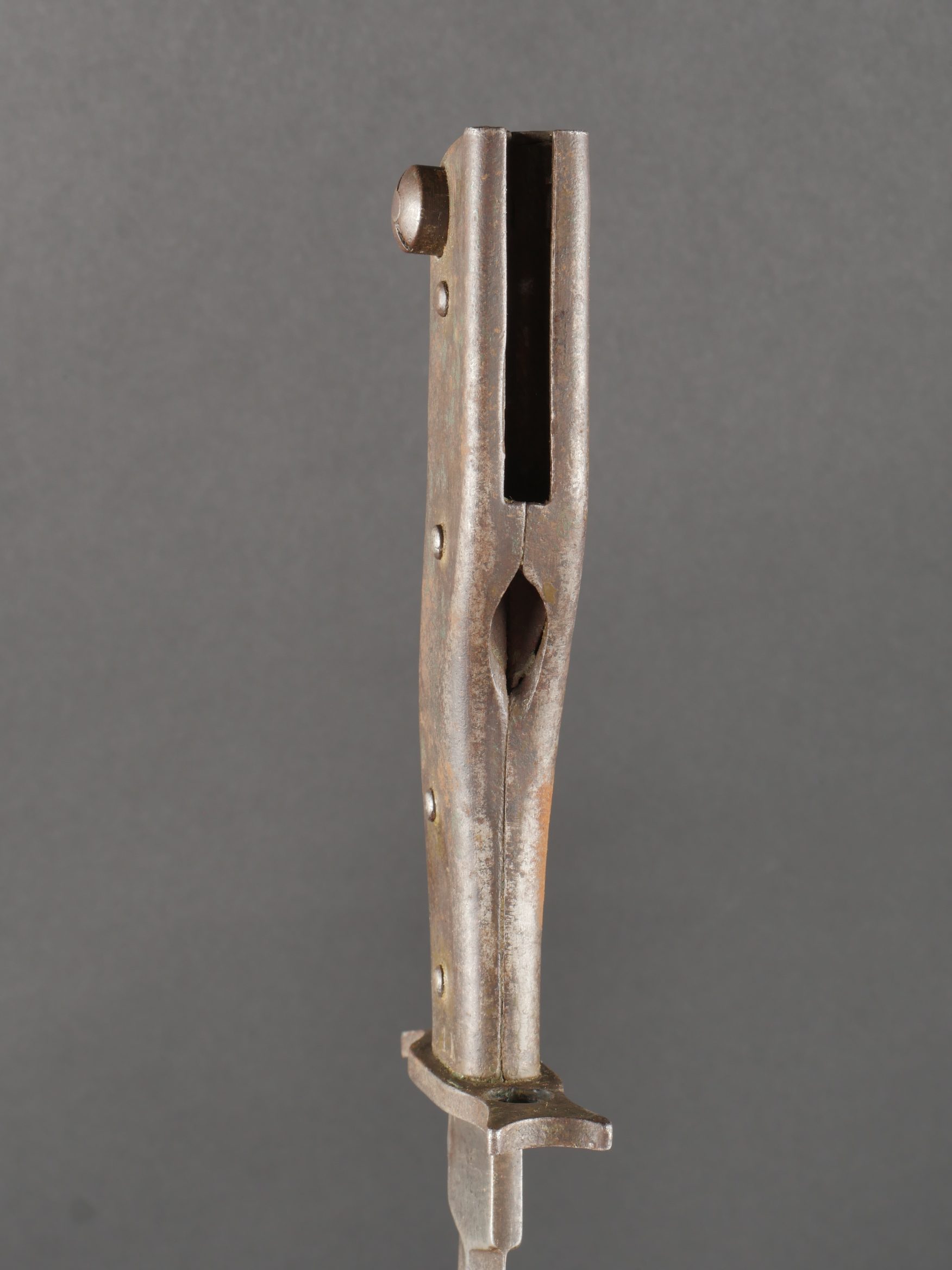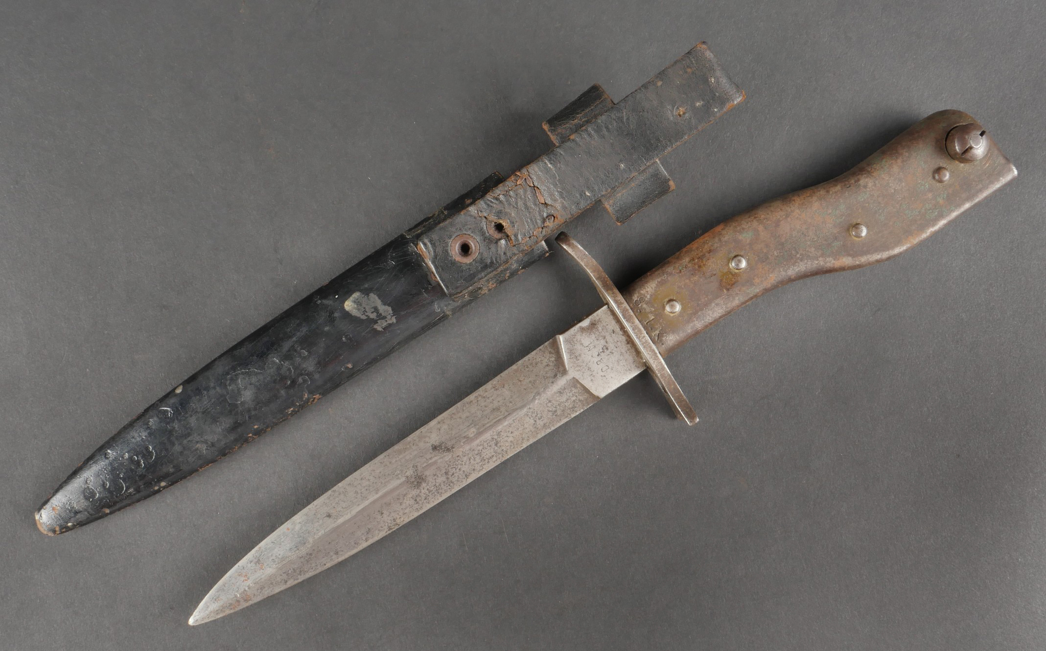 Poignard baïonnette DEMAG régimenté. Lame en relativement bon état, marquage DRGM d’un côté, DEMAG Duisburg de l’autre, usure. Poignée moulée en fer avec de bons restes de peinture feldgrau. Régimentée d’un côté près de la croisière 8. 1. K.1ère compagnie du 8ème ? peut-être 8ème d’infanterie bavarois? Poussoir fonctionnel. Avec son fourreau laqué noir avec son passant de ceinturon riveté, sangle de maintien présente mais bouton pression détaché d’un côté. Usure d’usage. Regimental DEMAG Trench Knife/Bayonet Blade in fairly good condition, marked “DRGM” on one side and “DEMAG Duisburg” on the other. Cast iron handle with good remnants of field-grey paint. Regimental marking near crossguard “8. 1. K.” possibly for 1st Company, 8th Bavarian Infantry Regiment. Functional catch. Black lacquered scabbard with riveted belt loop, retaining strap present but snap fastener detached on one side. Signs of use.