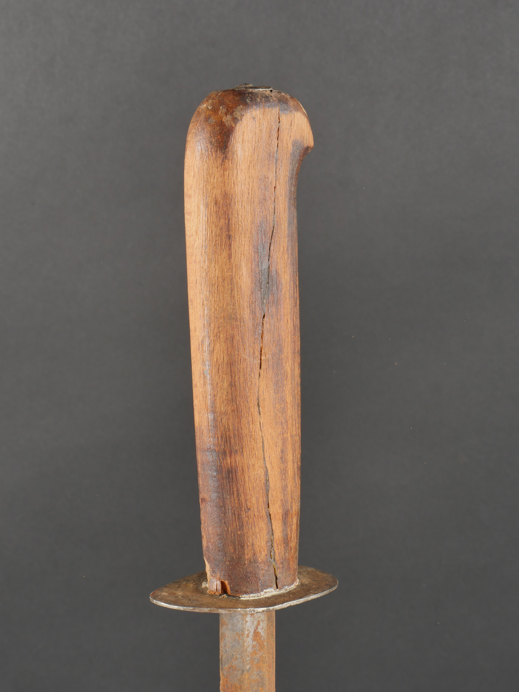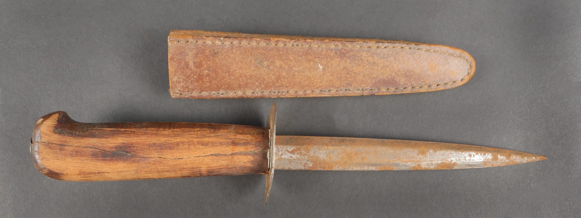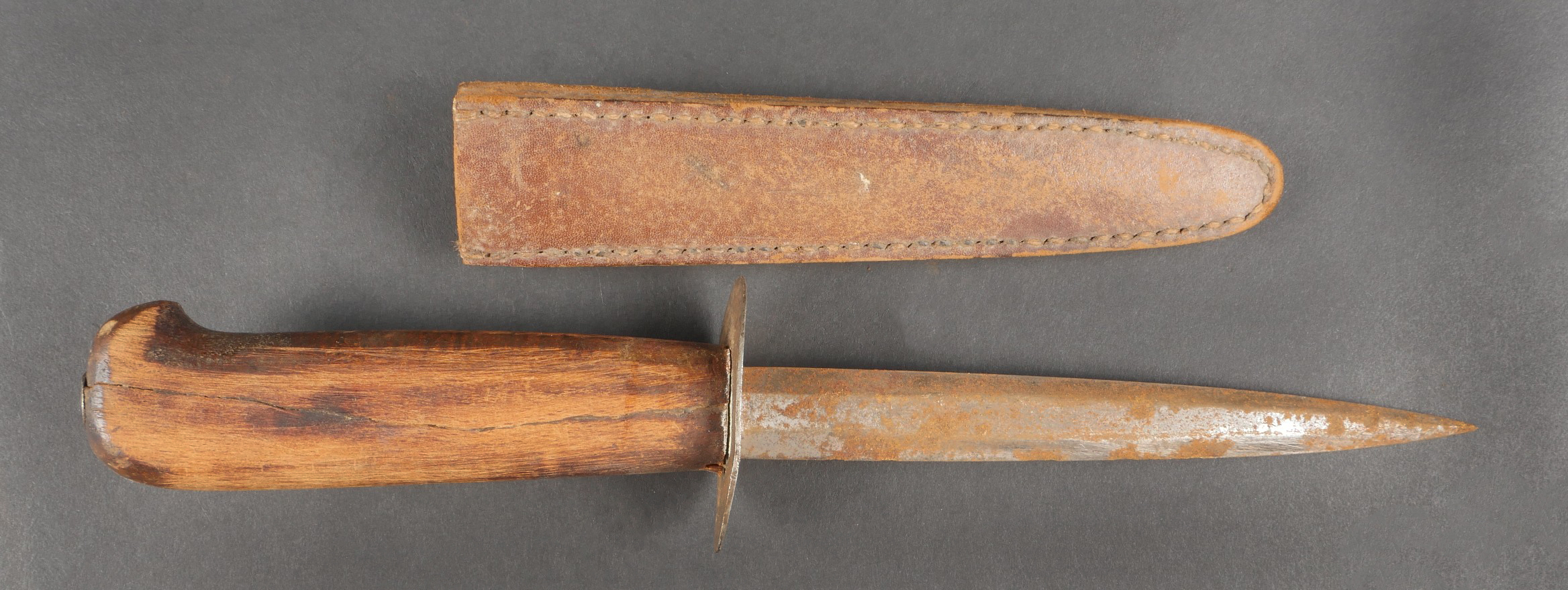 Poignard de tranchée français Coutrot numéro 6. Lame à double tranchant, oxydation, rivetée sur la poignée. Poignée bois monobloc à pommeau en bec. Garde ovale en fer. Marquage CV dans un ovale sur le dessous de la Garde correspondant à l’usine CHERON VOGT et CIE. Fourreau cuir, la patte de ceinturon est manquante. Usure d’usage, patine. French Trench Knife Coutrot No. 6 Double-edged blade with oxidation, riveted to the handle. One-piece wooden handle with beak-shaped pommel, oval iron guard. Marked “CV” in an oval under the guard, indicating manufacture by Cheron Vogt & Cie. Leather scabbard, belt loop missing. Signs of use, patina.