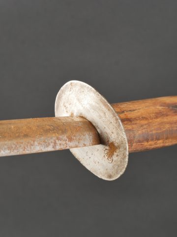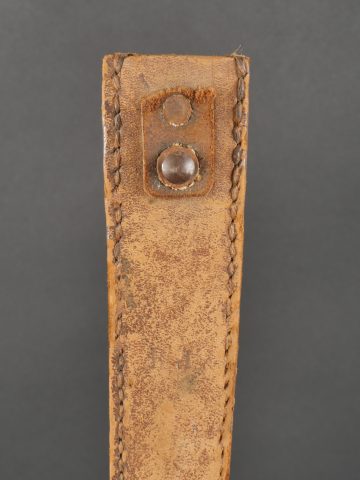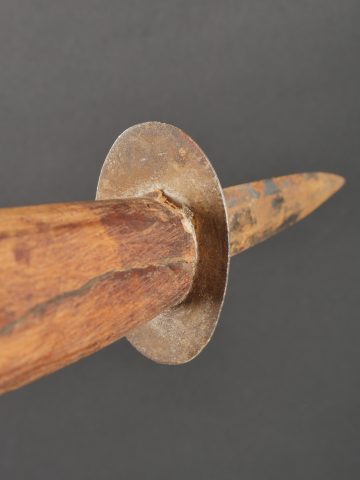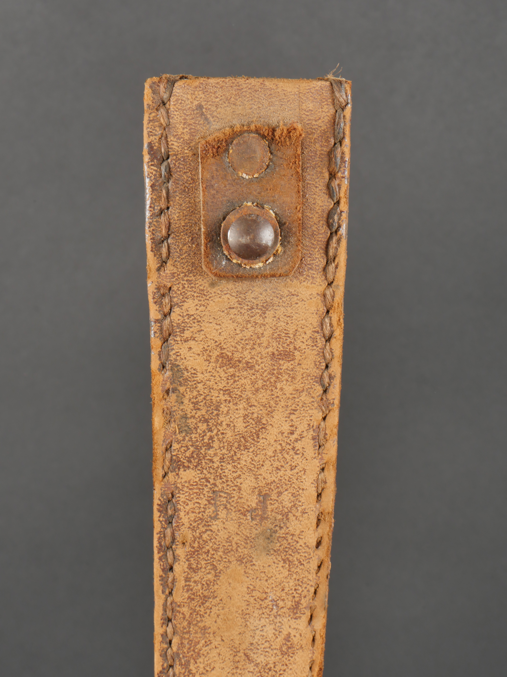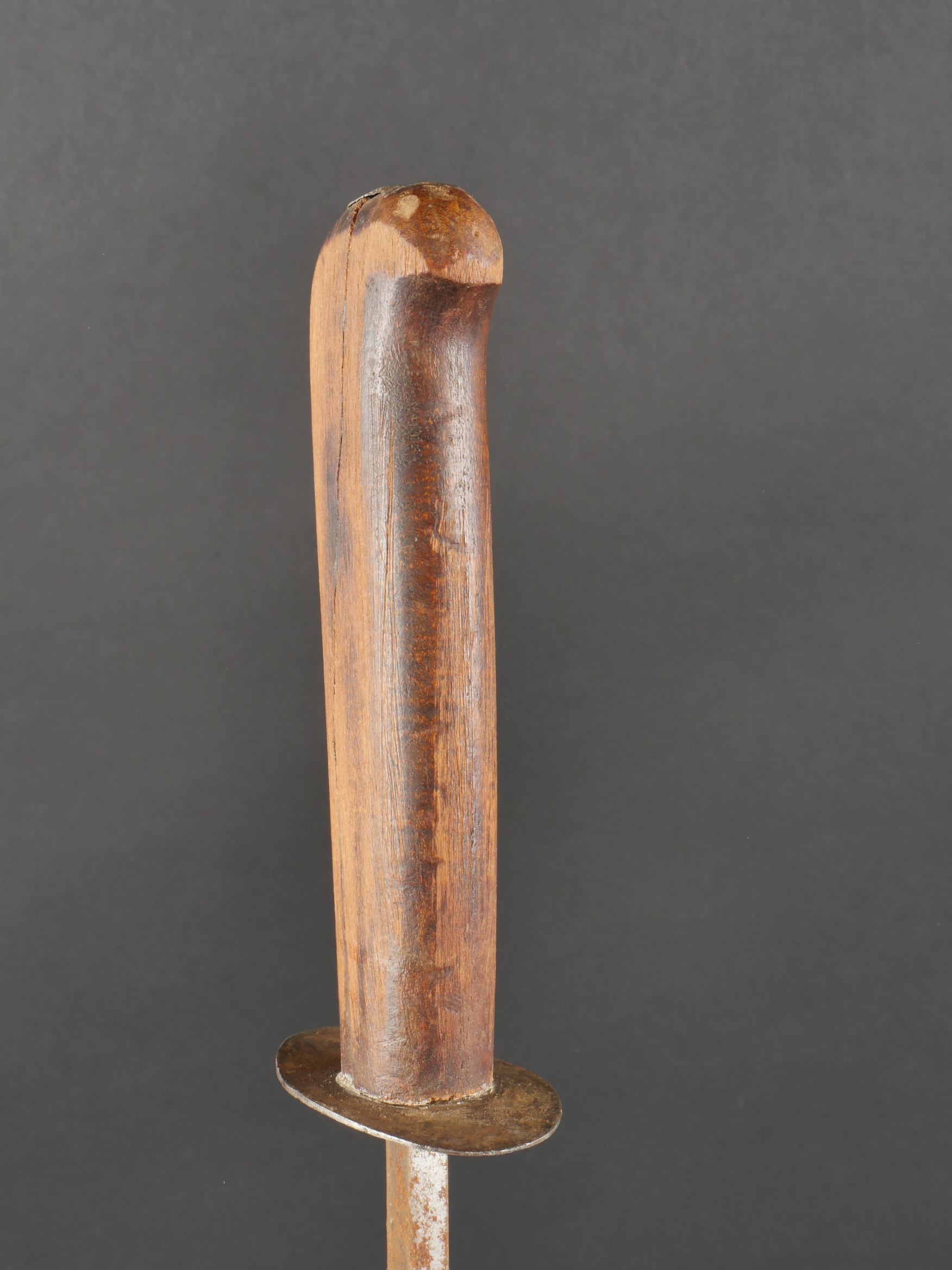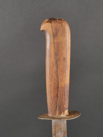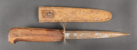 Poignard de tranchée français Coutrot numéro 6. Lame à double tranchant, oxydation, rivetée sur la poignée. Poignée bois monobloc à pommeau en bec. Garde ovale en fer. Marquage CV dans un ovale sur le dessous de la Garde correspondant à l’usine CHERON VOGT et CIE. Fourreau cuir, la patte de ceinturon est manquante. Usure d’usage, patine. French Trench Knife Coutrot No. 6 Double-edged blade with oxidation, riveted to the handle. One-piece wooden handle with beak-shaped pommel, oval iron guard. Marked “CV” in an oval under the guard, indicating manufacture by Cheron Vogt & Cie. Leather scabbard, belt loop missing. Signs of use, patina.