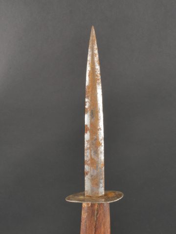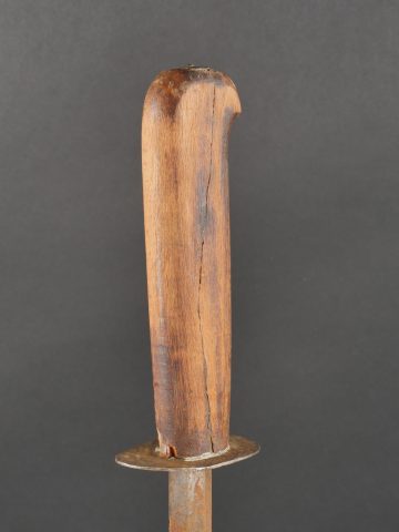 Détails de la vente >Poignard de tranchée français Coutrot numéro 6. Lame à double tranchant, oxydation, rivetée sur la poignée. Poignée bois monobloc à pommeau en bec. Garde ovale en fer. Marquage CV dans un... en savoir plus