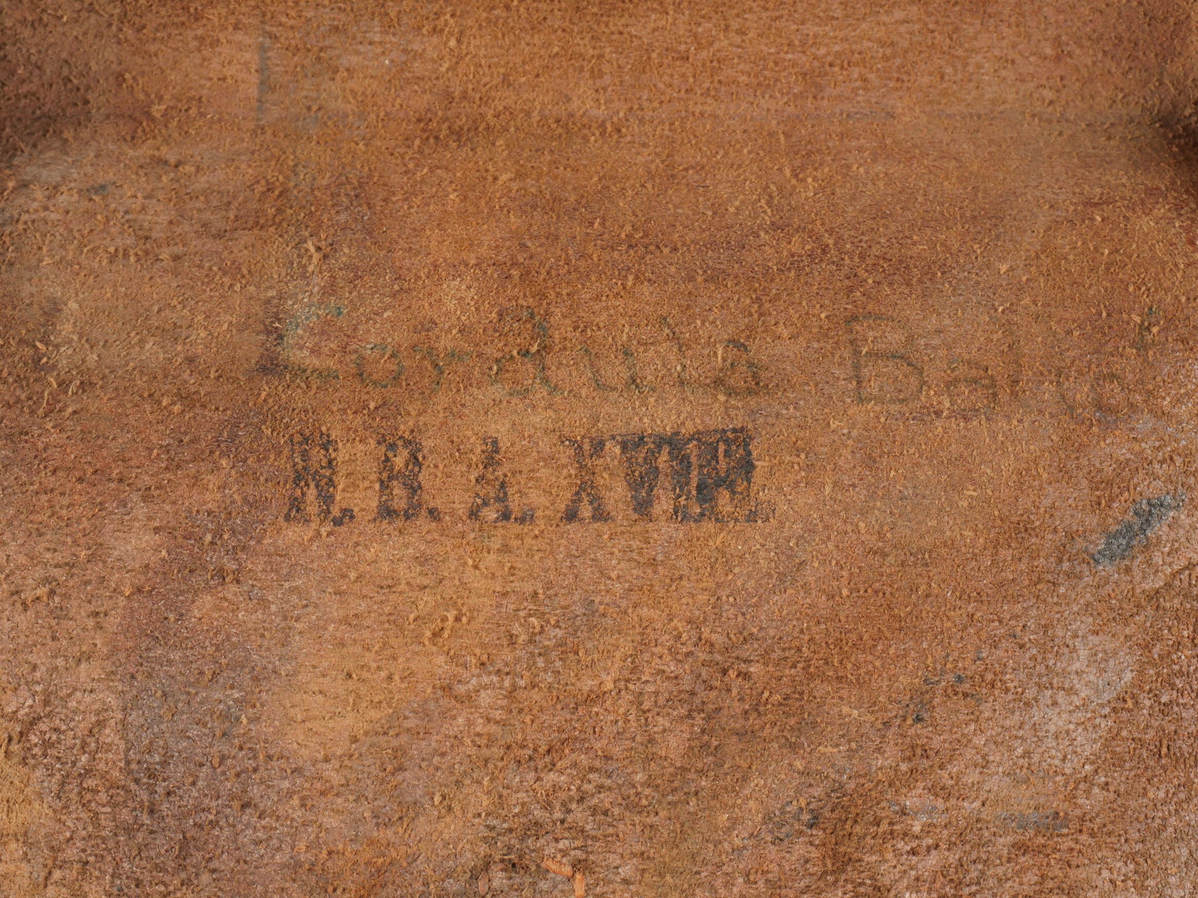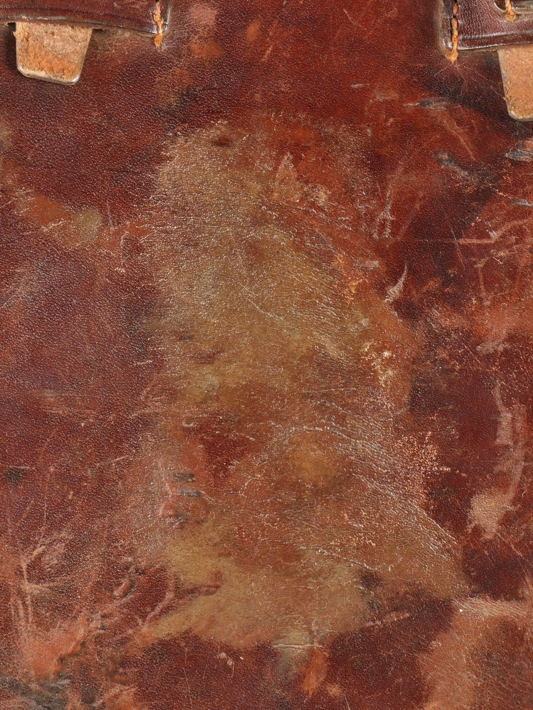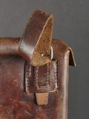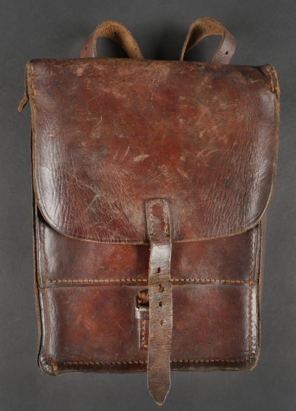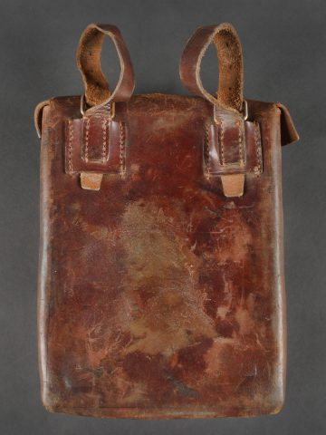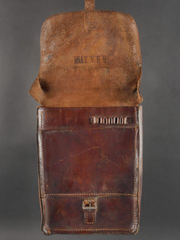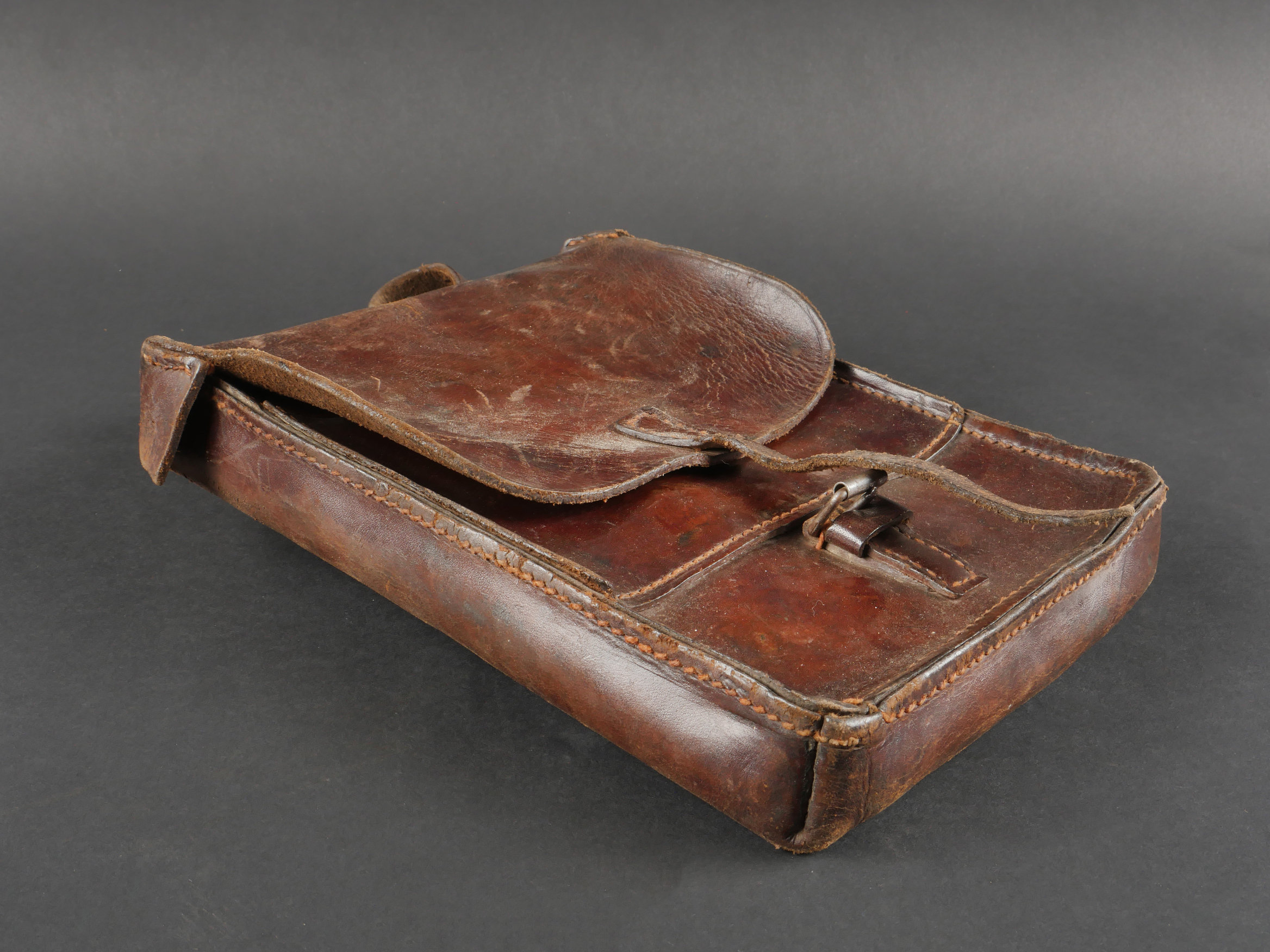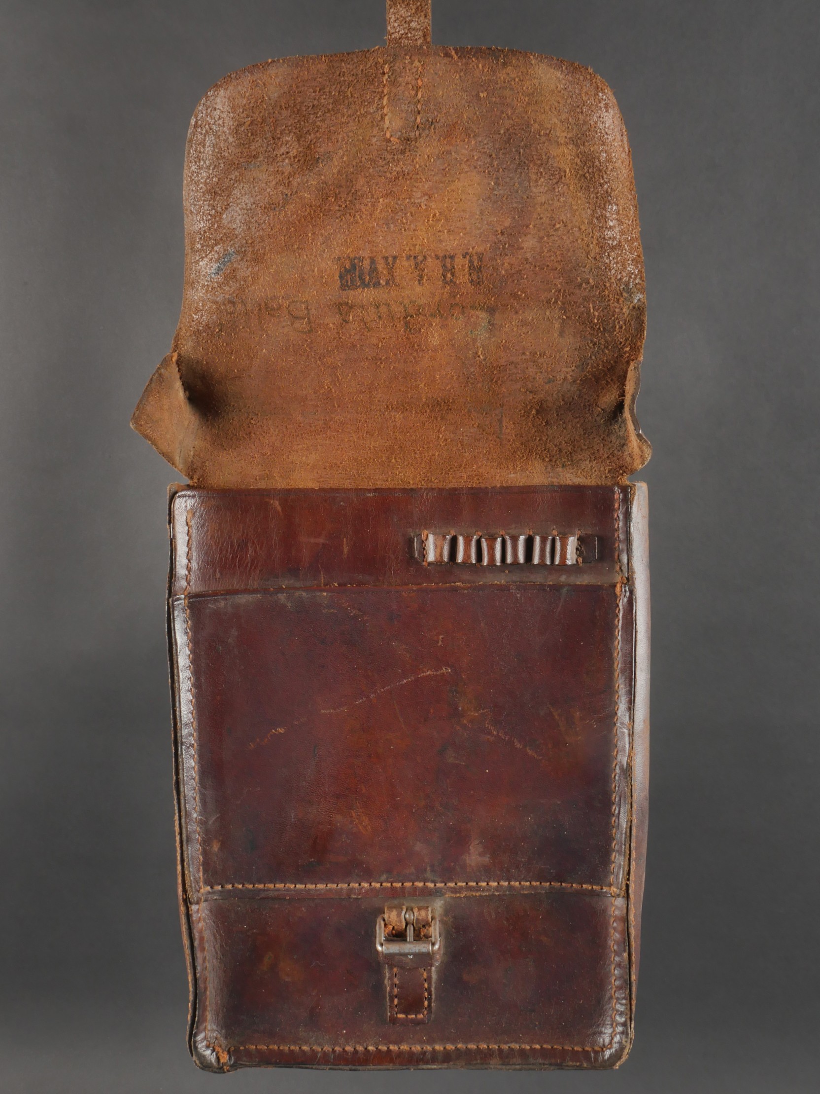 Porte carte allemand RBAXVIII. En cuir vernis de teinte chocolat, complet avec sa sangle de fermeture, et ses sangles arrières. Receptionné au RBAXVIII, magasin d’habillement de réserve du 18e Corps Hessois qui équipa également des unités prussiennes dont certaines de la Garde. Un nom manuscrit sous le rabat. Usure d’usage, bon état. German Map Case RBAXVIII Chocolate-brown varnished leather map case complete with closing strap and rear loops. Acceptance stamp of RBAXVIII, Reserve Clothing Depot of the 18th Hessian Army Corps, which also supplied certain Prussian Guard units. Handwritten name under the flap. Signs of use, good condition.