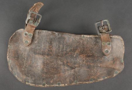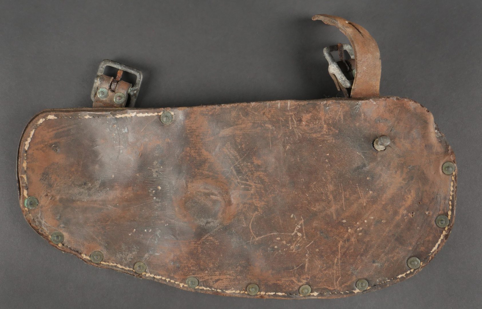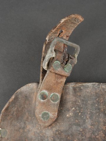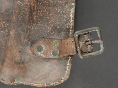 Porte outil individuel anglais pattern 1914 en cuir. Entrenching tool holder, banane en cuir modèle 1914. Pièce de terrain, cuir sec, coups et griffes. Le bouton de fermeture est présent mais fragile, cuir cassant au niveau des boucleries, oxydées. Reste de marquage fabricant près de la sangle de suspension mais illisible, lettres ..YLE.. . Peu courant de nos jours. British Leather Individual Tool Carrier Pattern 1914Field-recovered “banana” entrenching-tool holder, dry leather with knocks and scuffs. Closure stud present but fragile, leather cracked around oxidised fittings. Maker’s mark remnants near suspension strap, partly illegible (“..YLE..”). Scarce today.