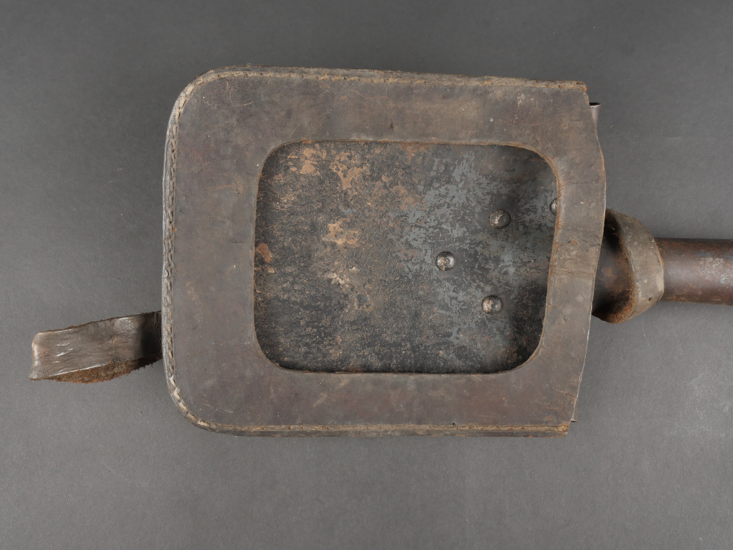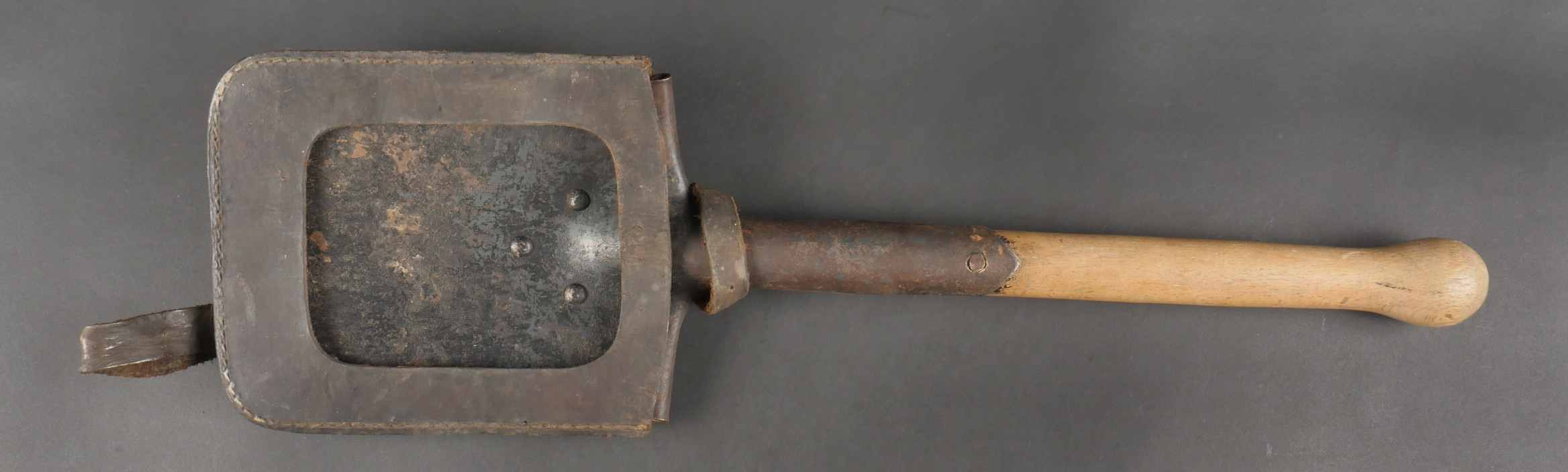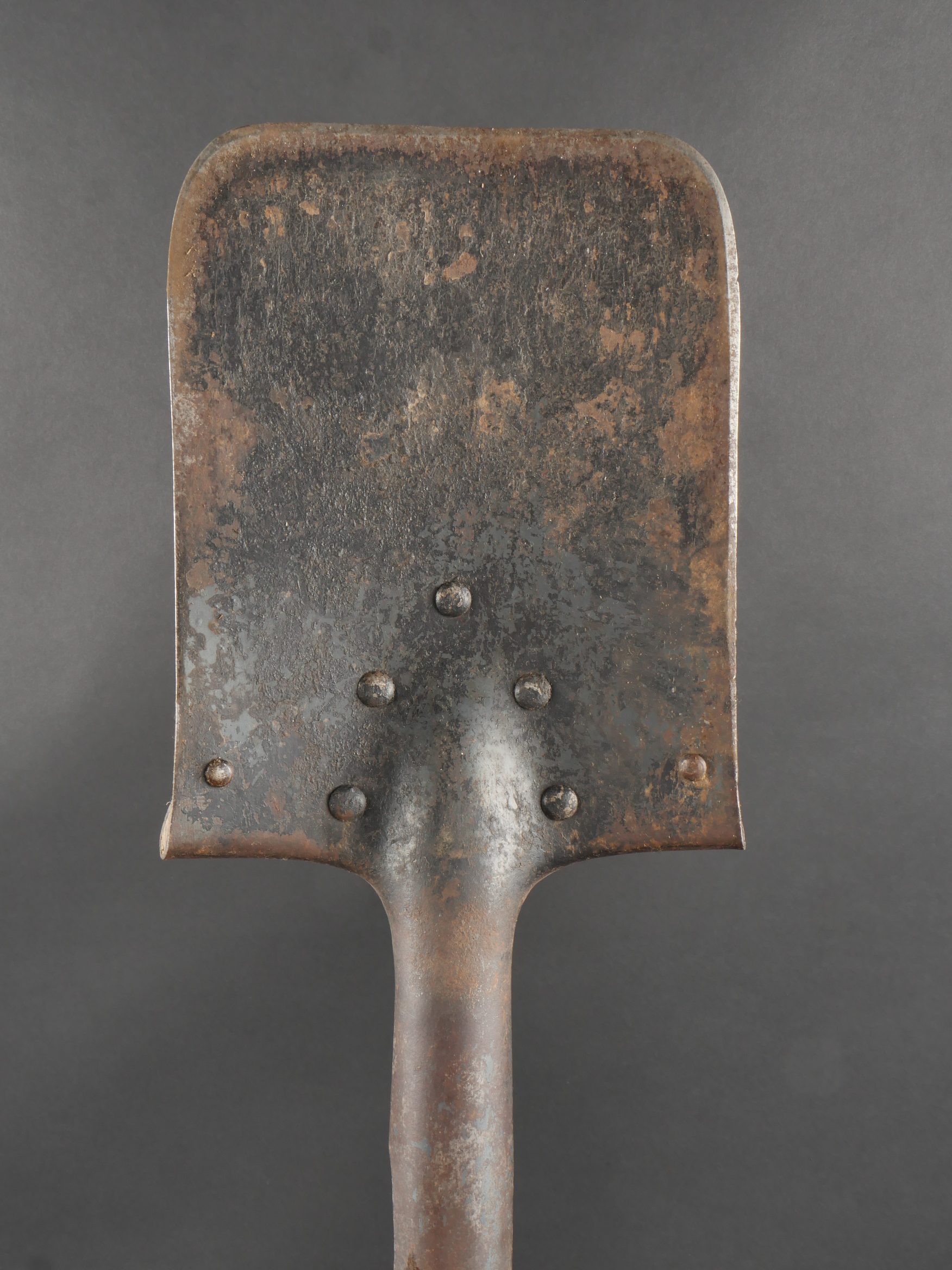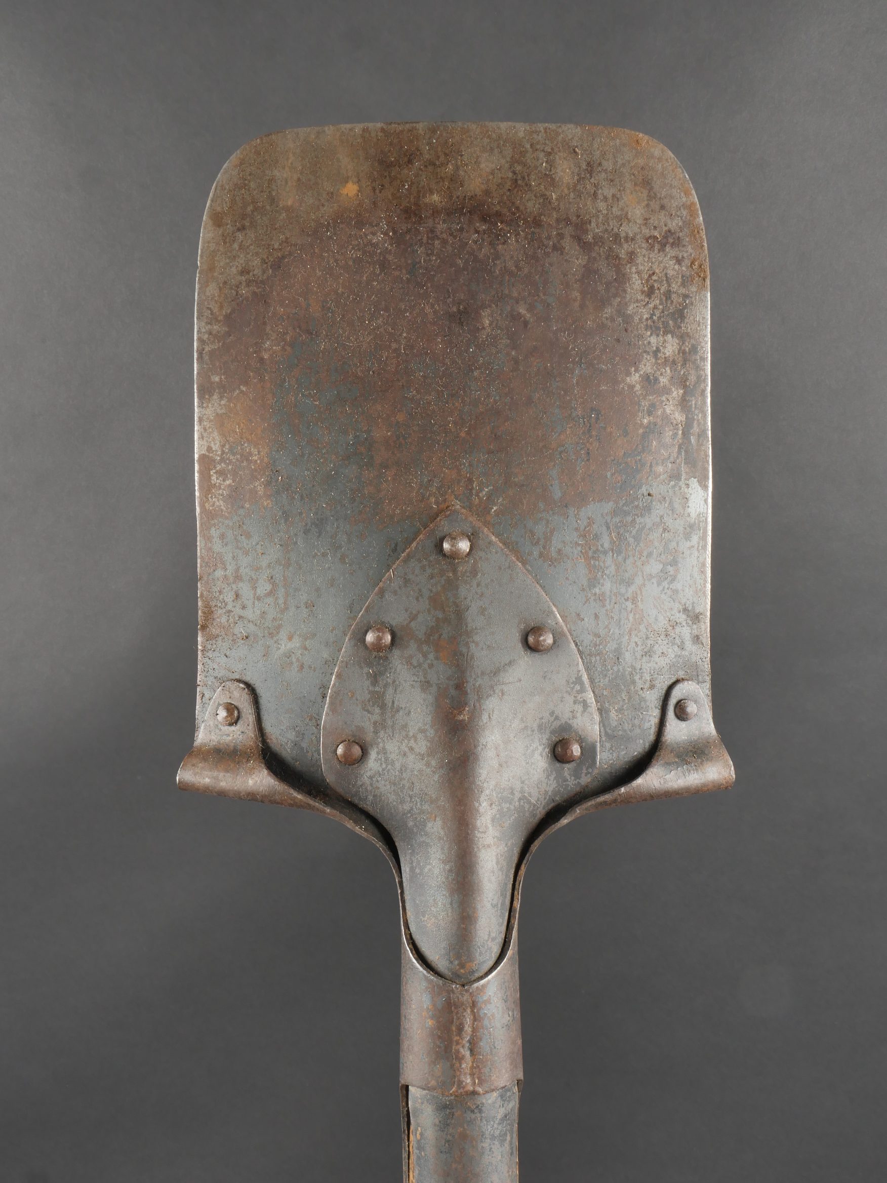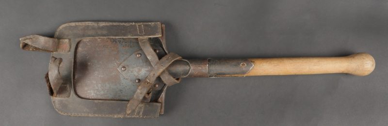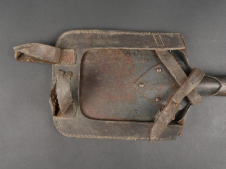 Porte pelle allemand avec pelle droite. Porte pelle en cuir foncé avec ses passants de ceinturon et sa sangle de maintien de la pelle. Marquage d’un fabricant allemand, difficilement lisible. Pelle droite avec restes de peinture. Usure d’usage, patine. German Entrenching Tool Carrier with Shovel Dark leather shovel holder complete with belt loops and retaining strap. Maker’s mark faintly visible. Straight shovel with remnants of paint. Signs of wear and patina.