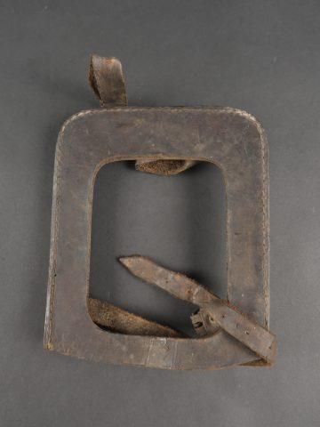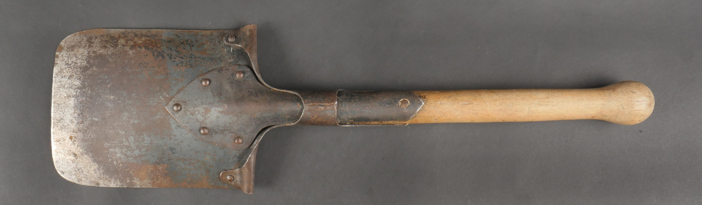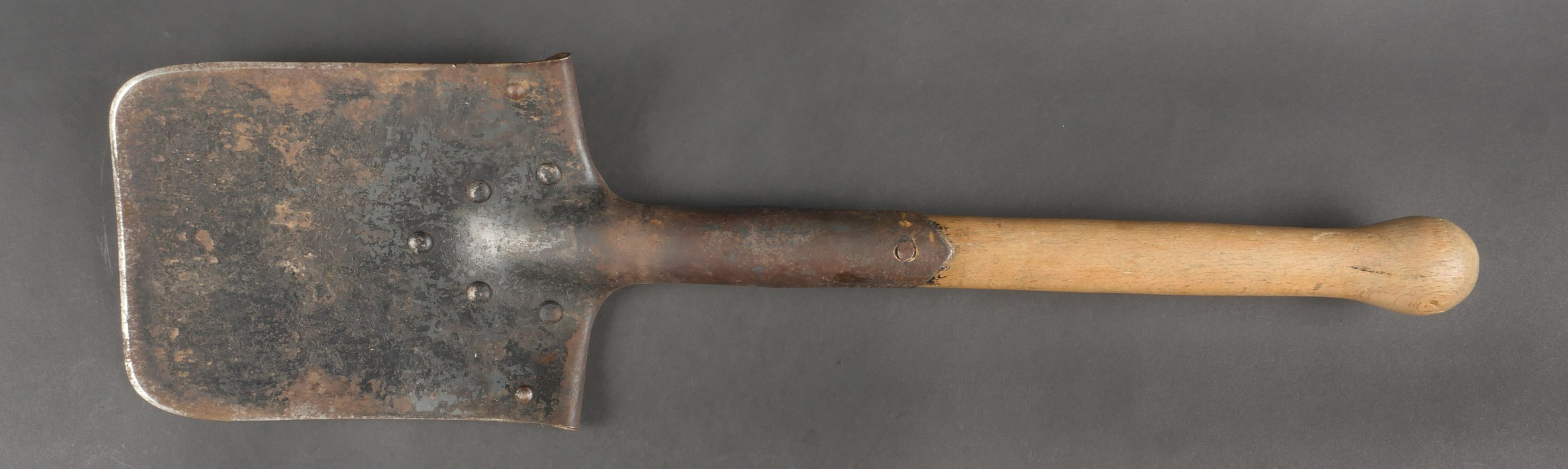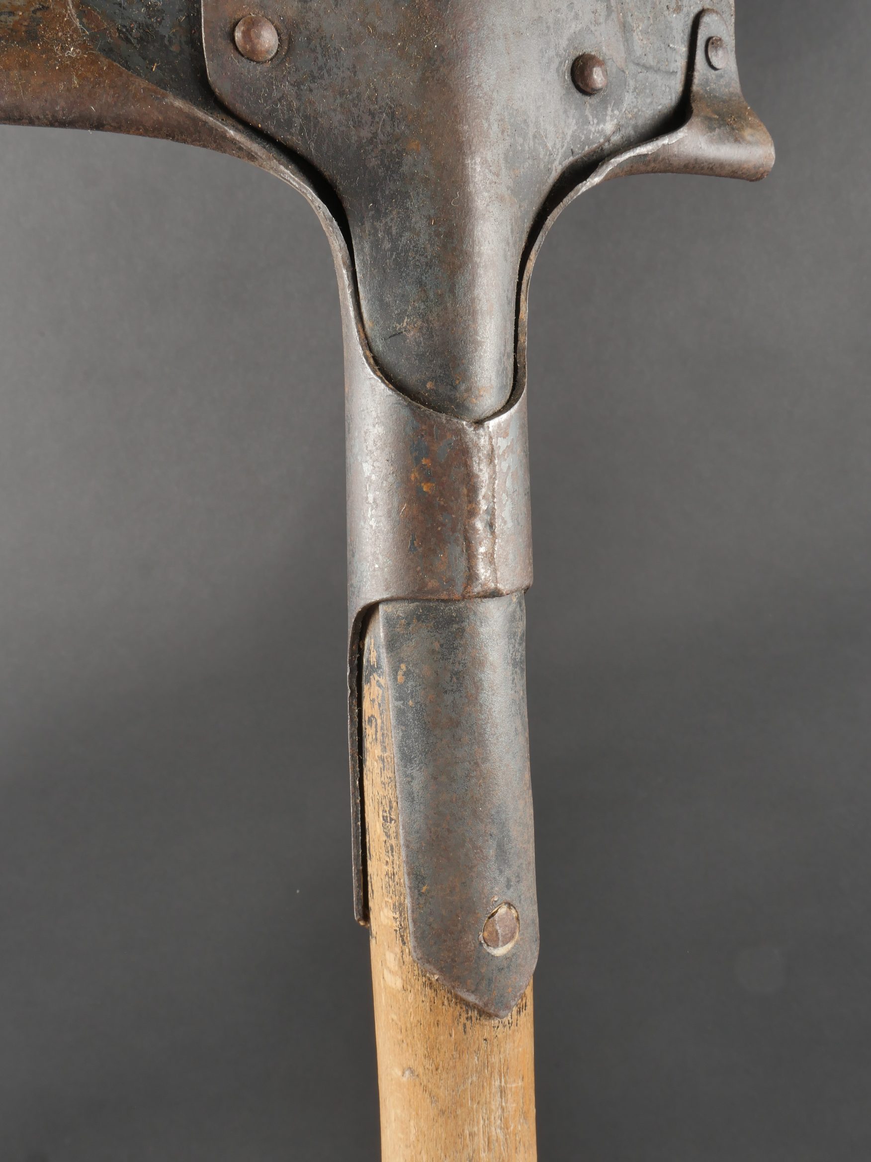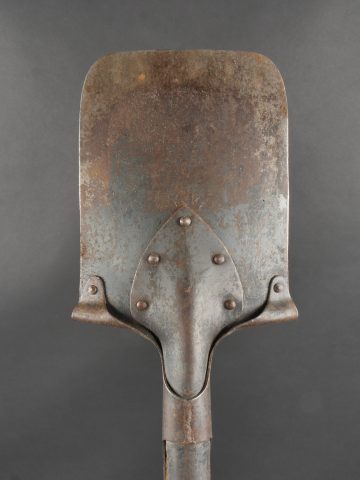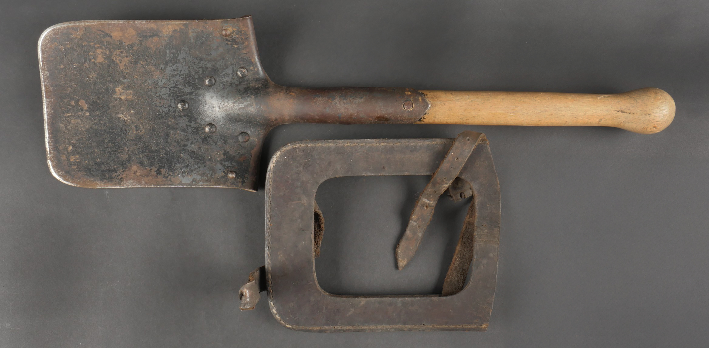 Porte pelle allemand avec pelle droite. Porte pelle en cuir foncé avec ses passants de ceinturon et sa sangle de maintien de la pelle. Marquage d’un fabricant allemand, difficilement lisible. Pelle droite avec restes de peinture. Usure d’usage, patine. German Entrenching Tool Carrier with Shovel Dark leather shovel holder complete with belt loops and retaining strap. Maker’s mark faintly visible. Straight shovel with remnants of paint. Signs of wear and patina.