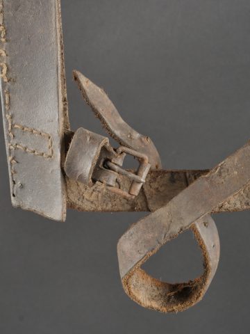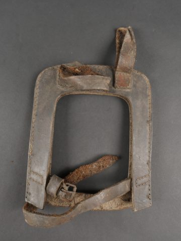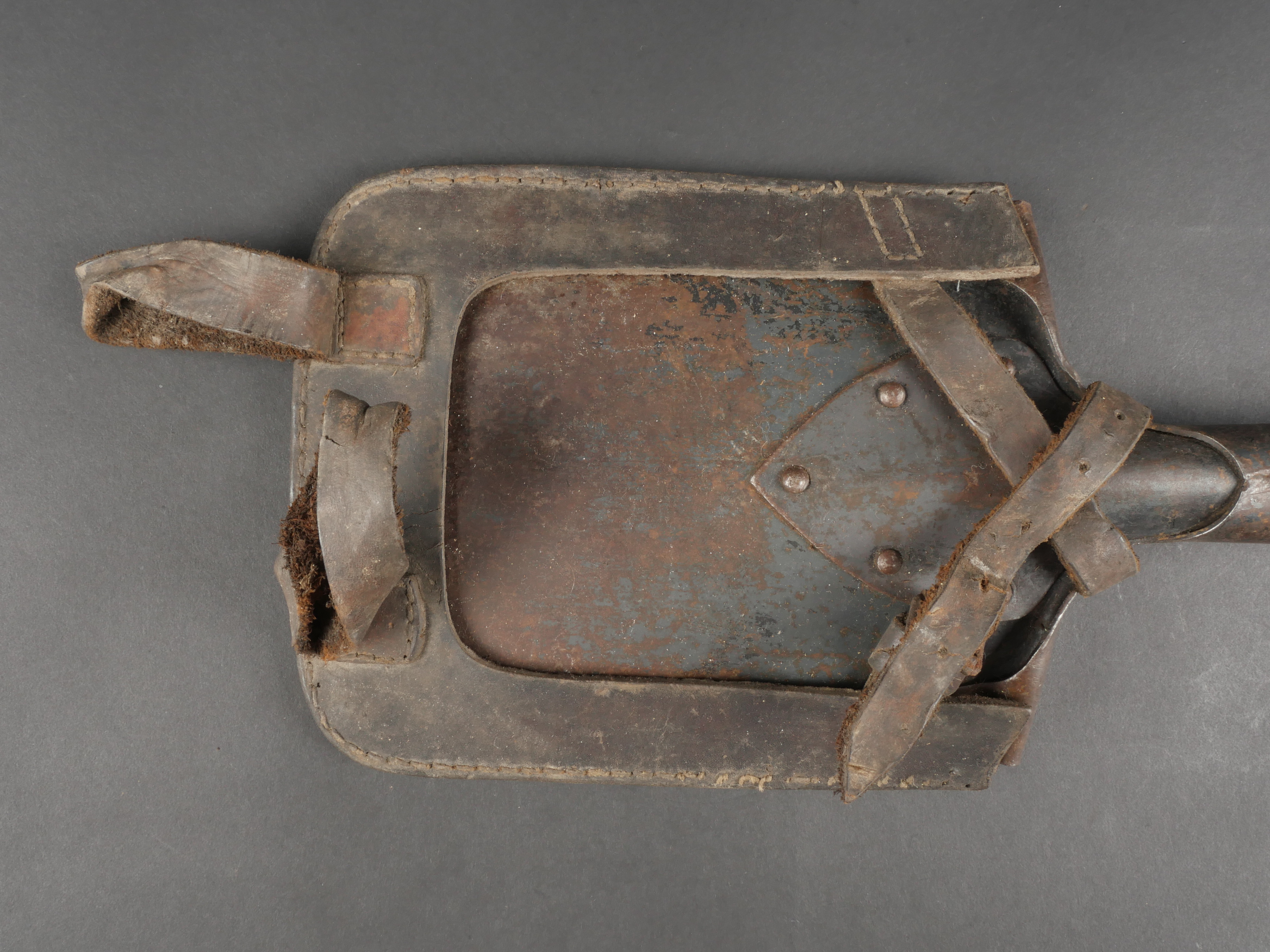 Détails de la vente >Porte pelle allemand avec pelle droite. Porte pelle en cuir foncé avec ses passants de ceinturon et sa sangle de maintien de la pelle. Marquage d’un fabricant allemand, difficilement... en savoir plus