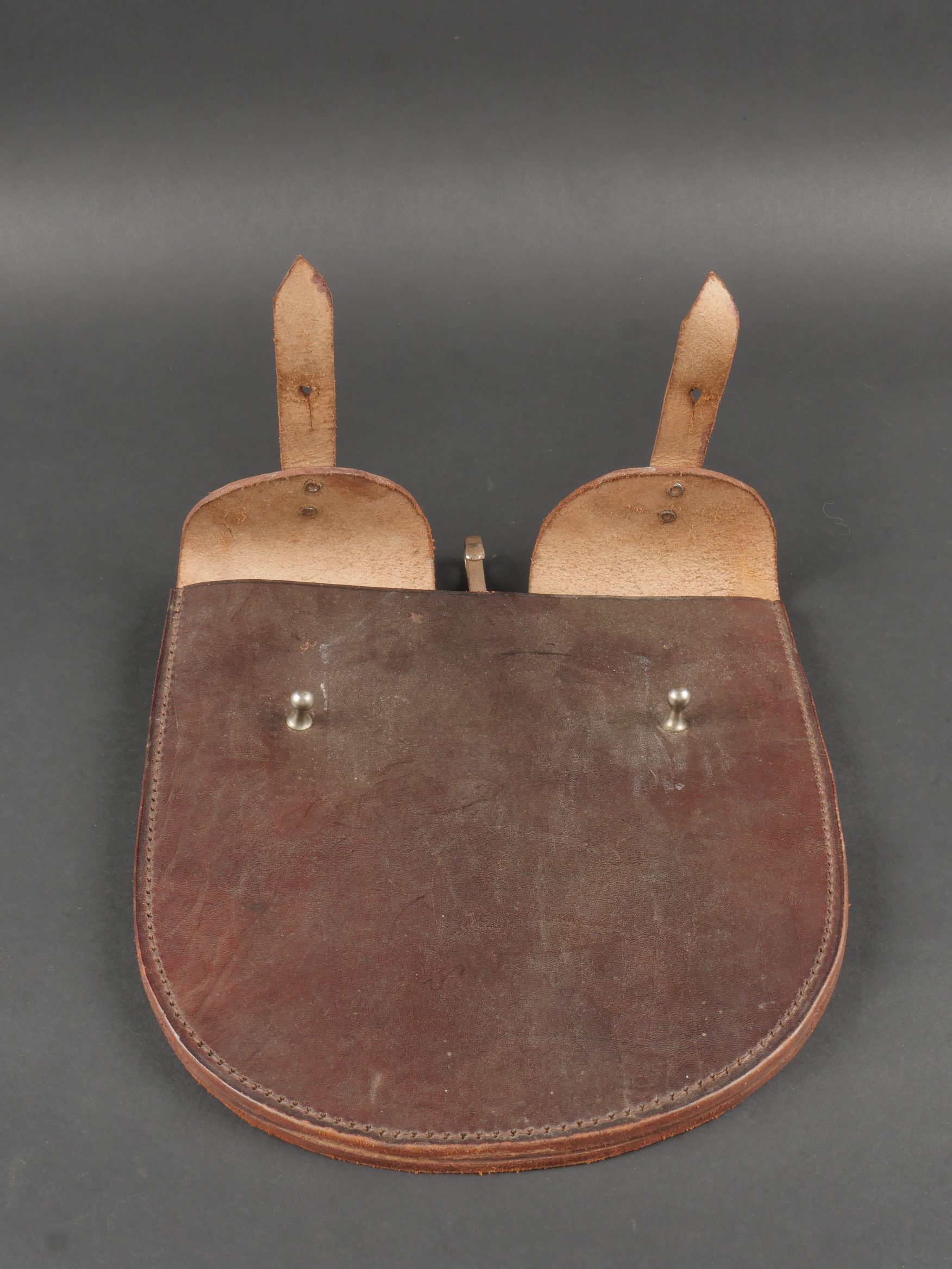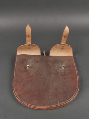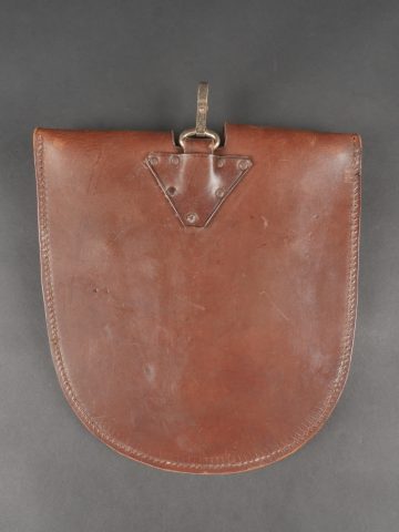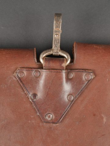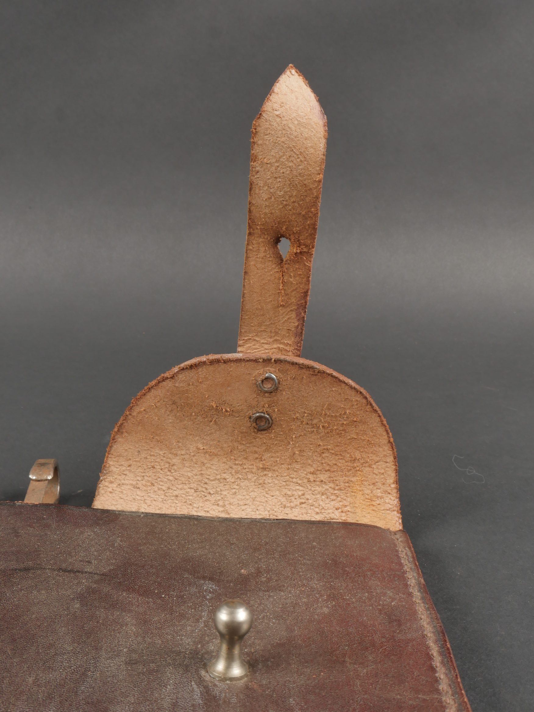 Porte pelle de Pionier en cuir. Cuir couleur chocolat, patte de supension et pattes de fermeture rivetées, petits rivets à tête marron. Crochet de suspension nickelé. Aucun marquage visible, fabrication de qualité. Assez typique des productions de guerre par des entreprises privées mobilisées pour leffort de guerre, notamment bavaroises. Bon état, usure d’usage. Pioneer Shovel Carrier in LeatherChocolate-brown leather carrier with riveted suspension strap and closing tabs, fitted with small brown-headed rivets. Nickel-plated suspension hook. No visible markings, quality wartime production. Typical of items made by private firms mobilized for the war effort, especially Bavarian ones. Good condition, showing normal service wear.