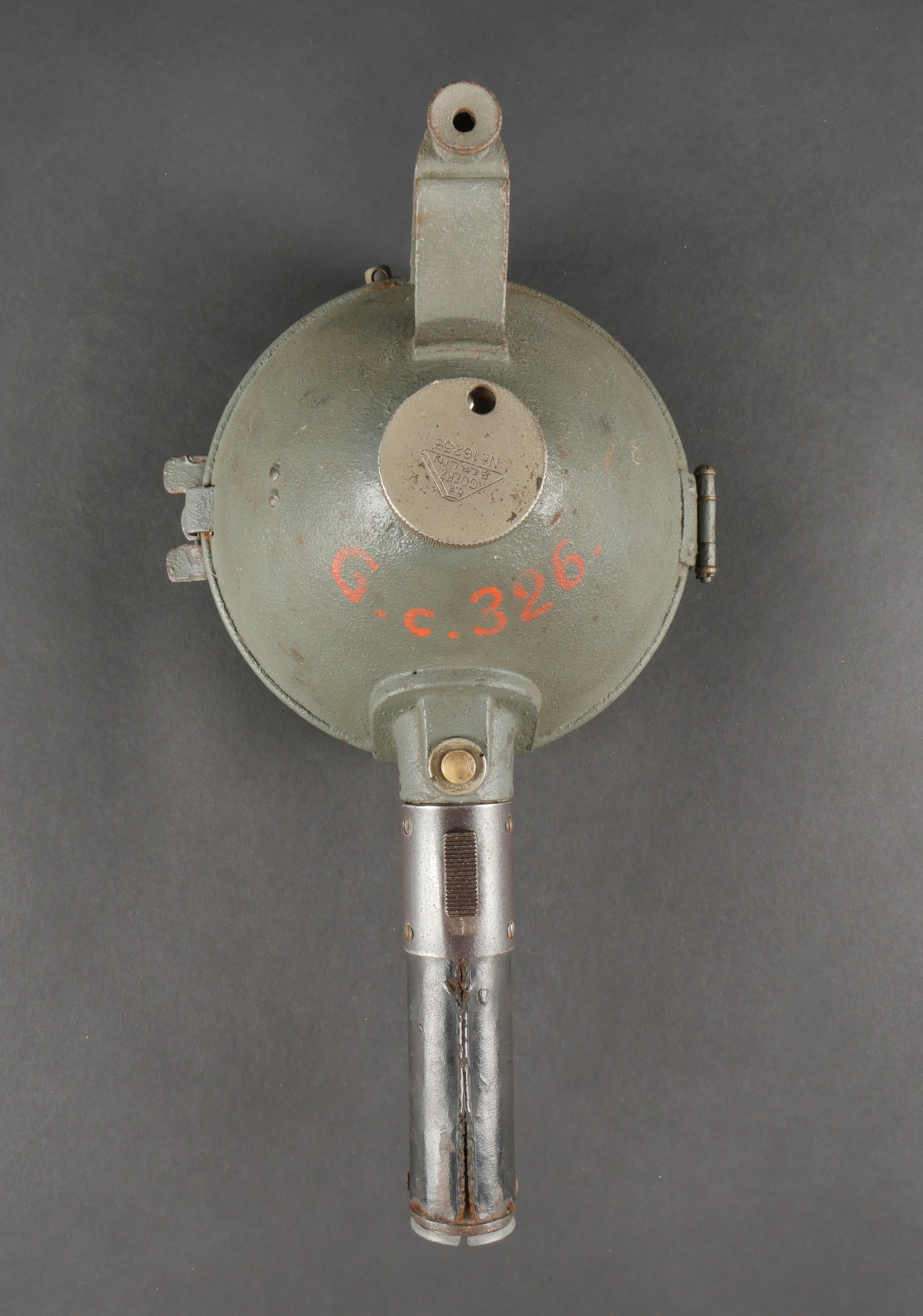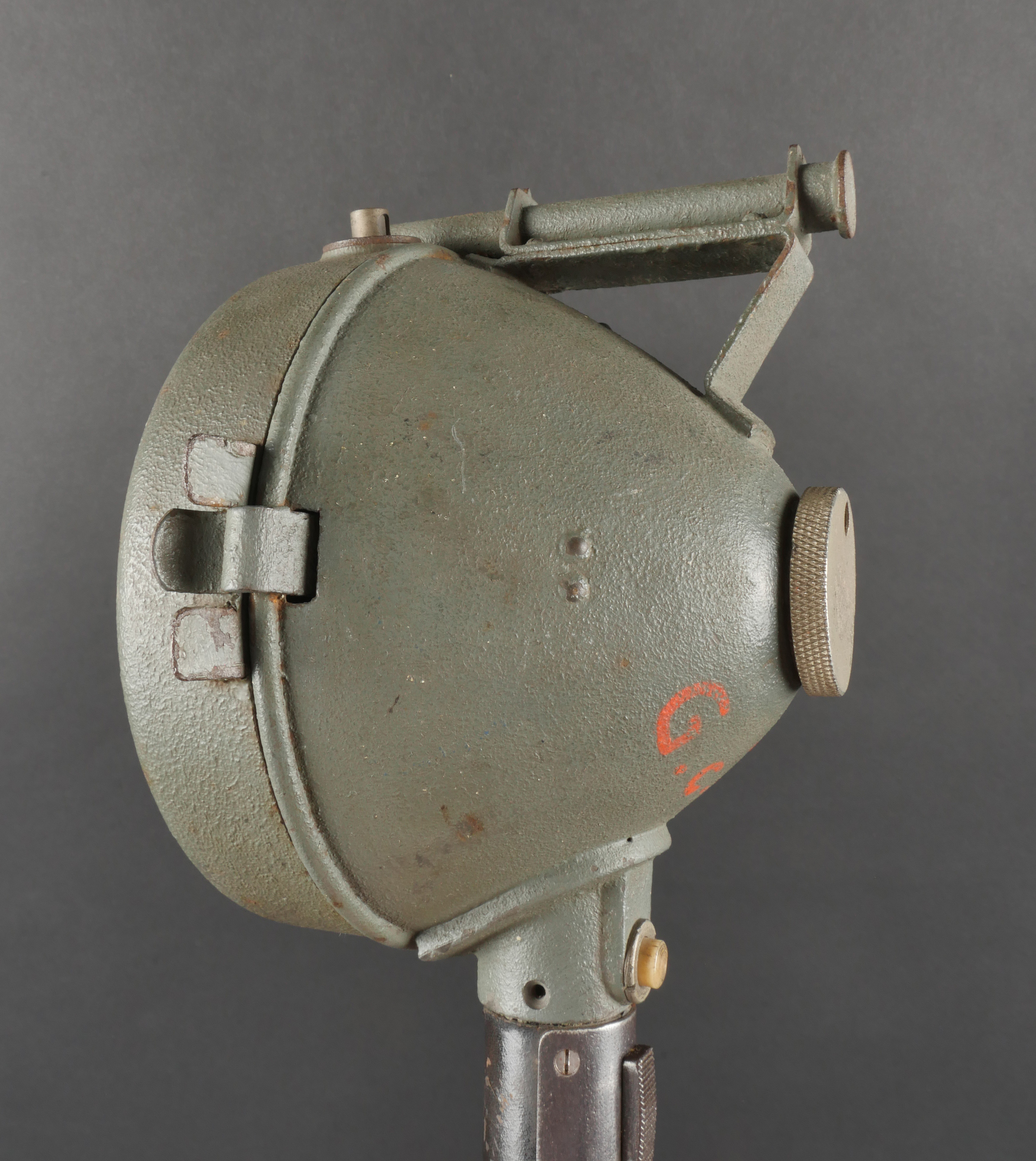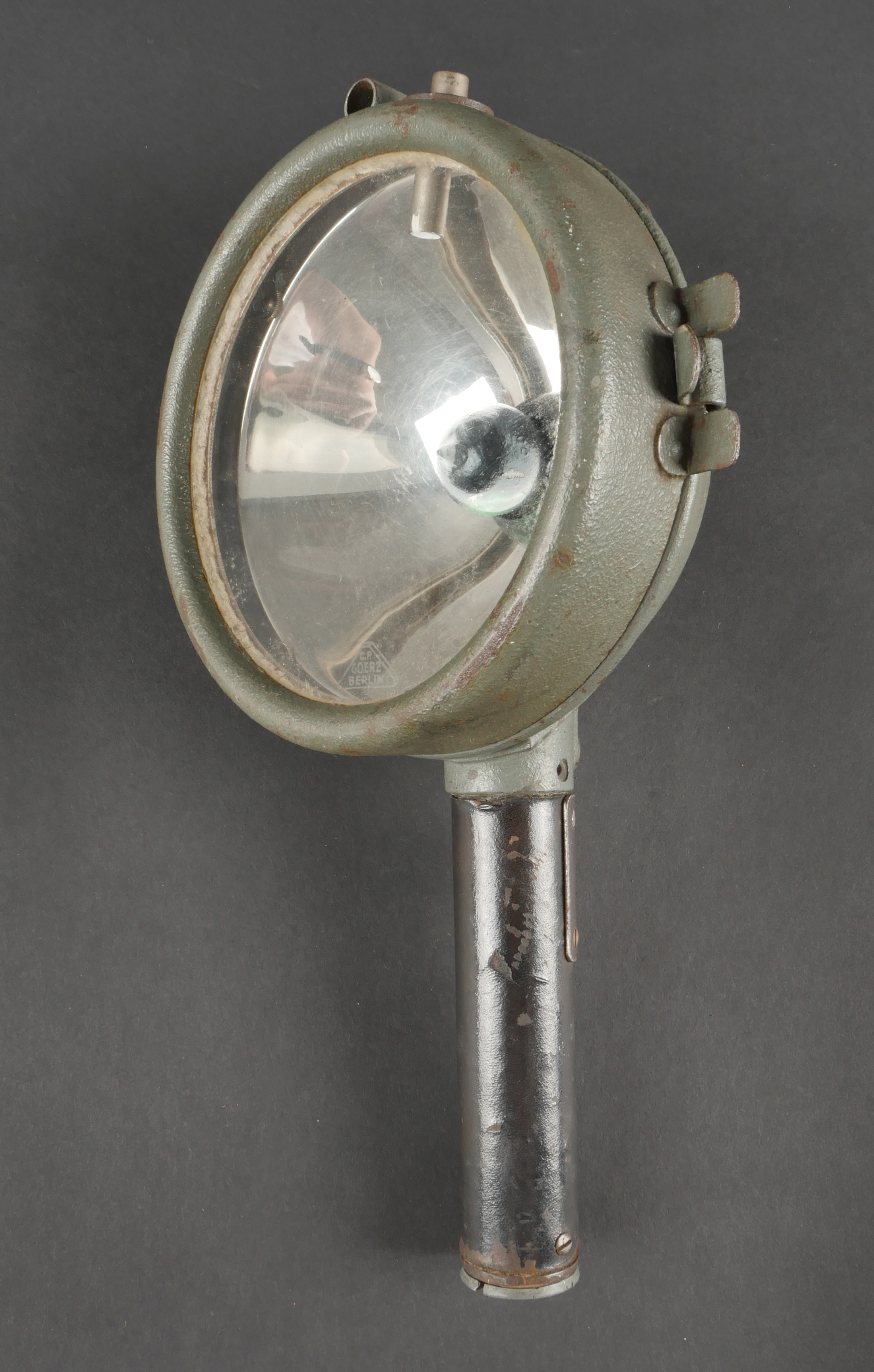 Projecteur de signalisation allemand Signalscheinwerfer 12 cm. Du fabricant Goerz, projecteur électrique de 12 cm, utilisable à la main ou sur trépied pour communication par signaux lumineux. Belle peinture granitée feldgrau, avec sa visée, son verre bien marqué Goerz, ampoule en place. Peu courant. Fonctionnement non testé. German Signal Projector, Signalscheinwerfer 12 cmManufactured by Goerz, 12 cm electric signaling projector, handheld or tripod-mounted for communication via light signals. Fine field-grey textured paint, complete with sight, glass lens marked “Goerz,” and bulb in place. Scarce model. Function not tested.