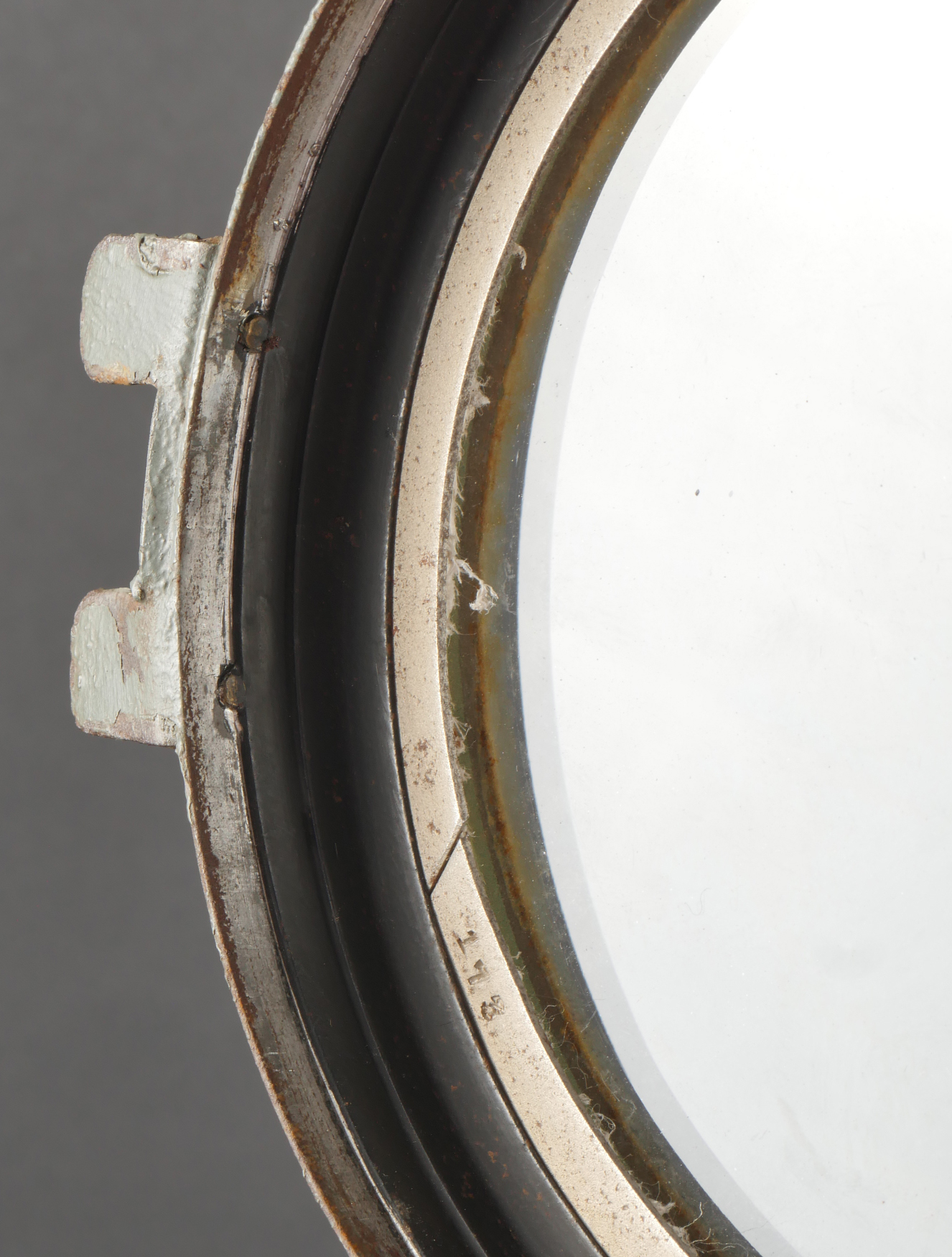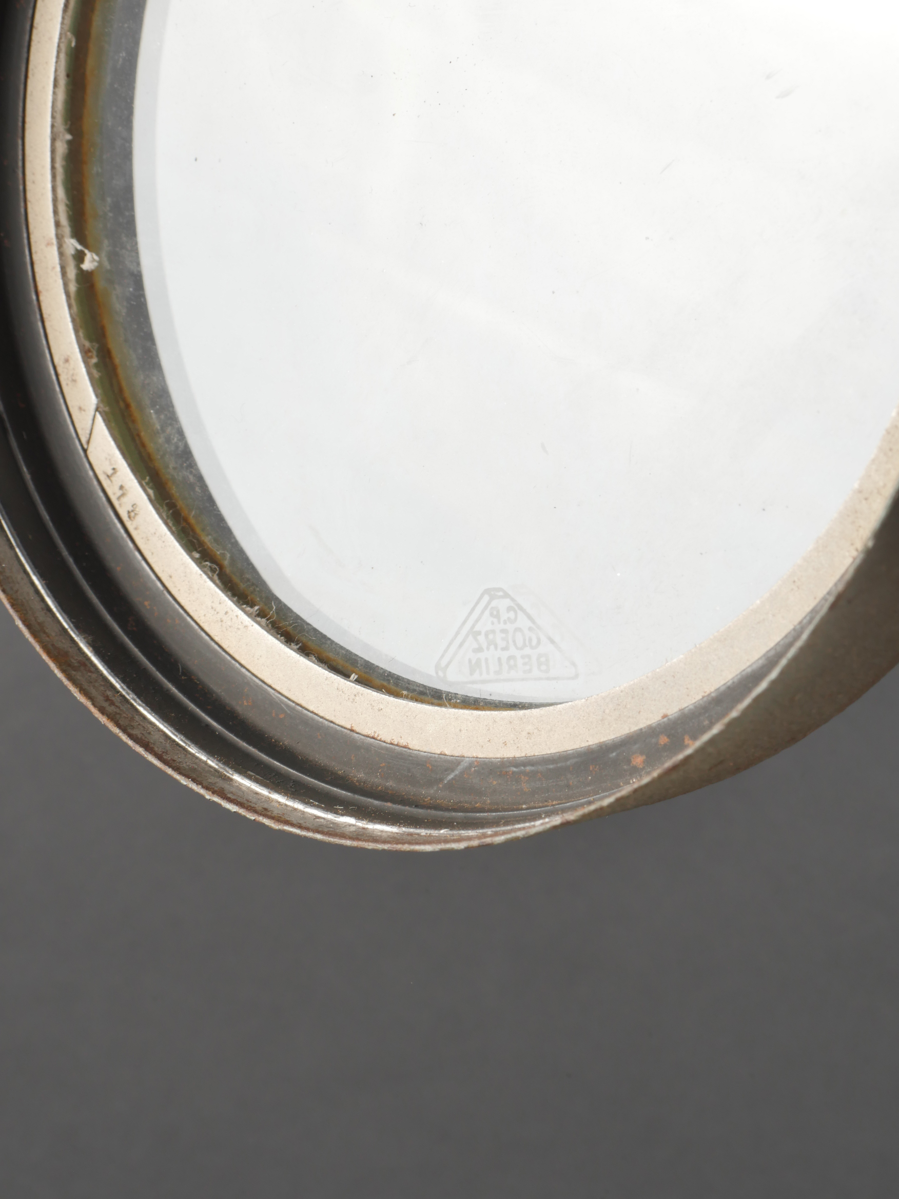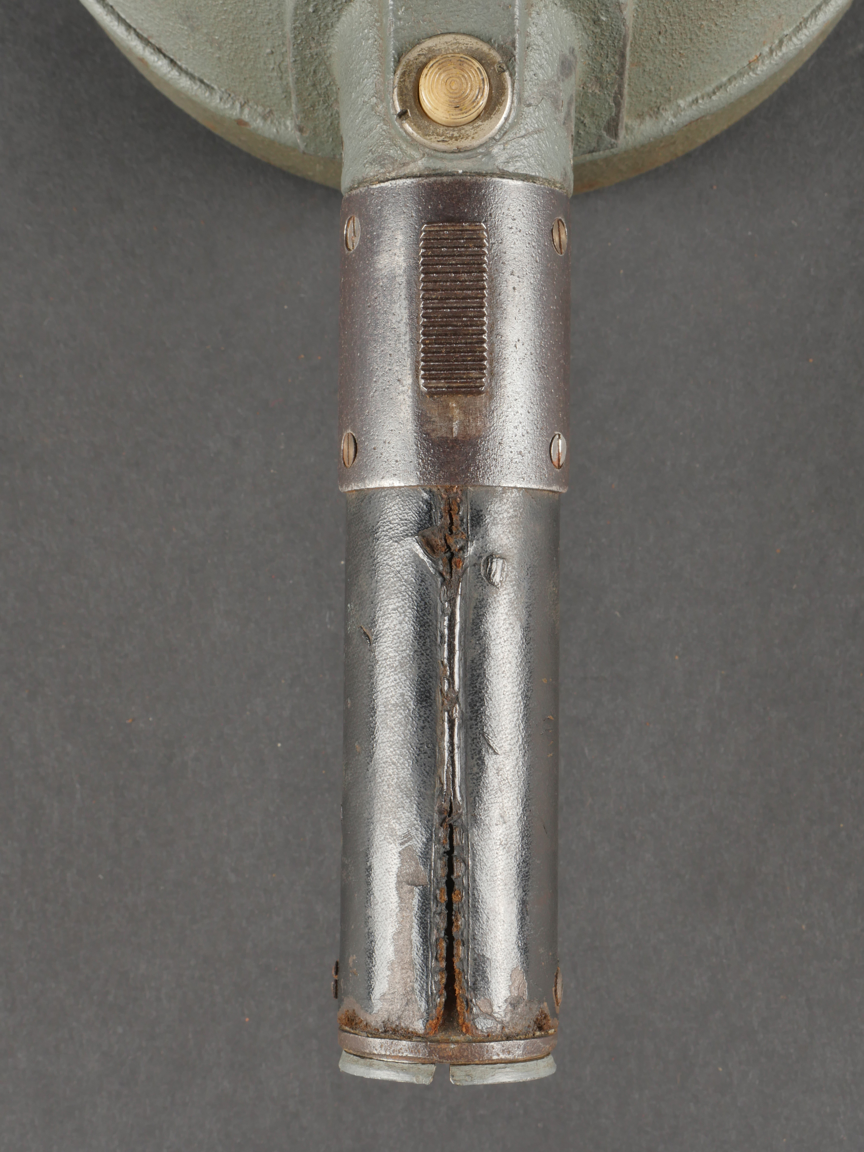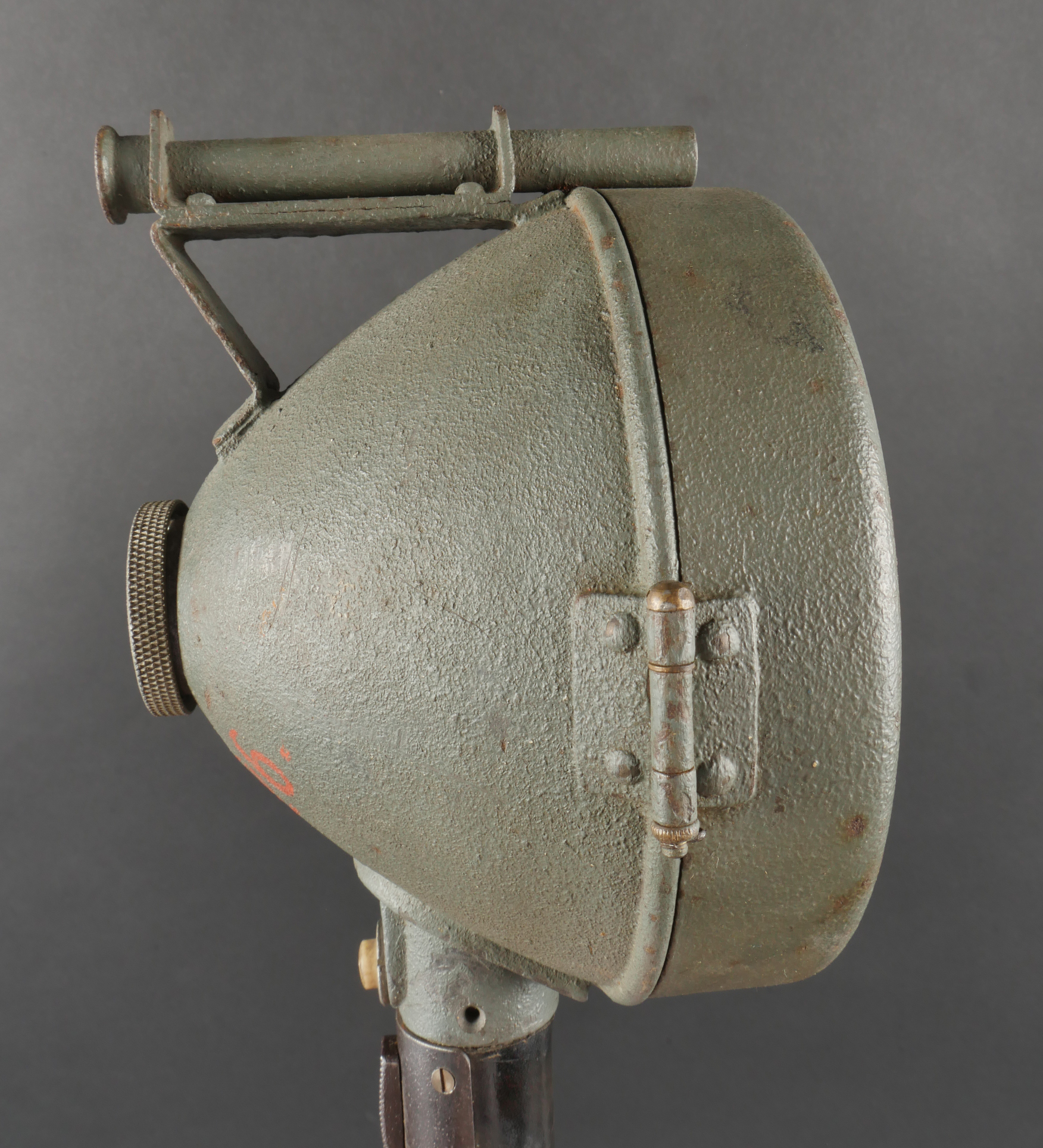 Projecteur de signalisation allemand Signalscheinwerfer 12 cm. Du fabricant Goerz, projecteur électrique de 12 cm, utilisable à la main ou sur trépied pour communication par signaux lumineux. Belle peinture granitée feldgrau, avec sa visée, son verre bien marqué Goerz, ampoule en place. Peu courant. Fonctionnement non testé. German Signal Projector, Signalscheinwerfer 12 cmManufactured by Goerz, 12 cm electric signaling projector, handheld or tripod-mounted for communication via light signals. Fine field-grey textured paint, complete with sight, glass lens marked “Goerz,” and bulb in place. Scarce model. Function not tested.