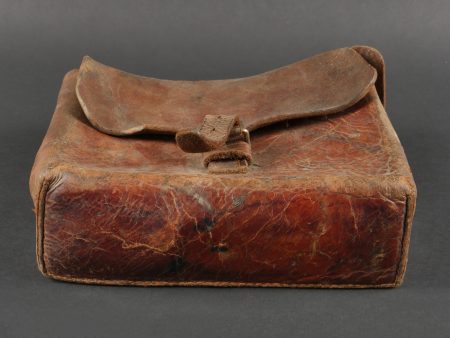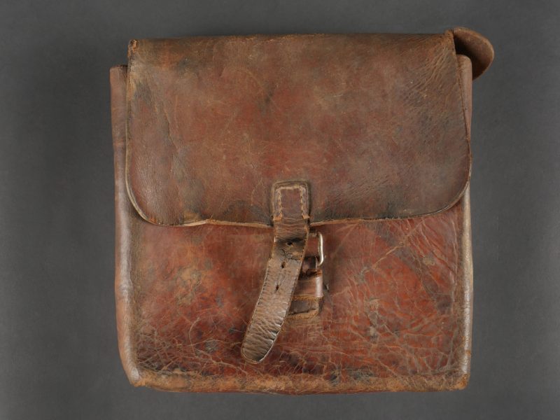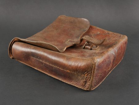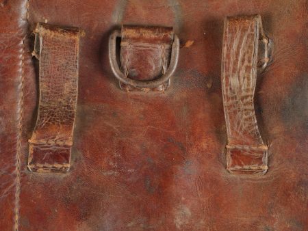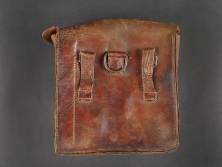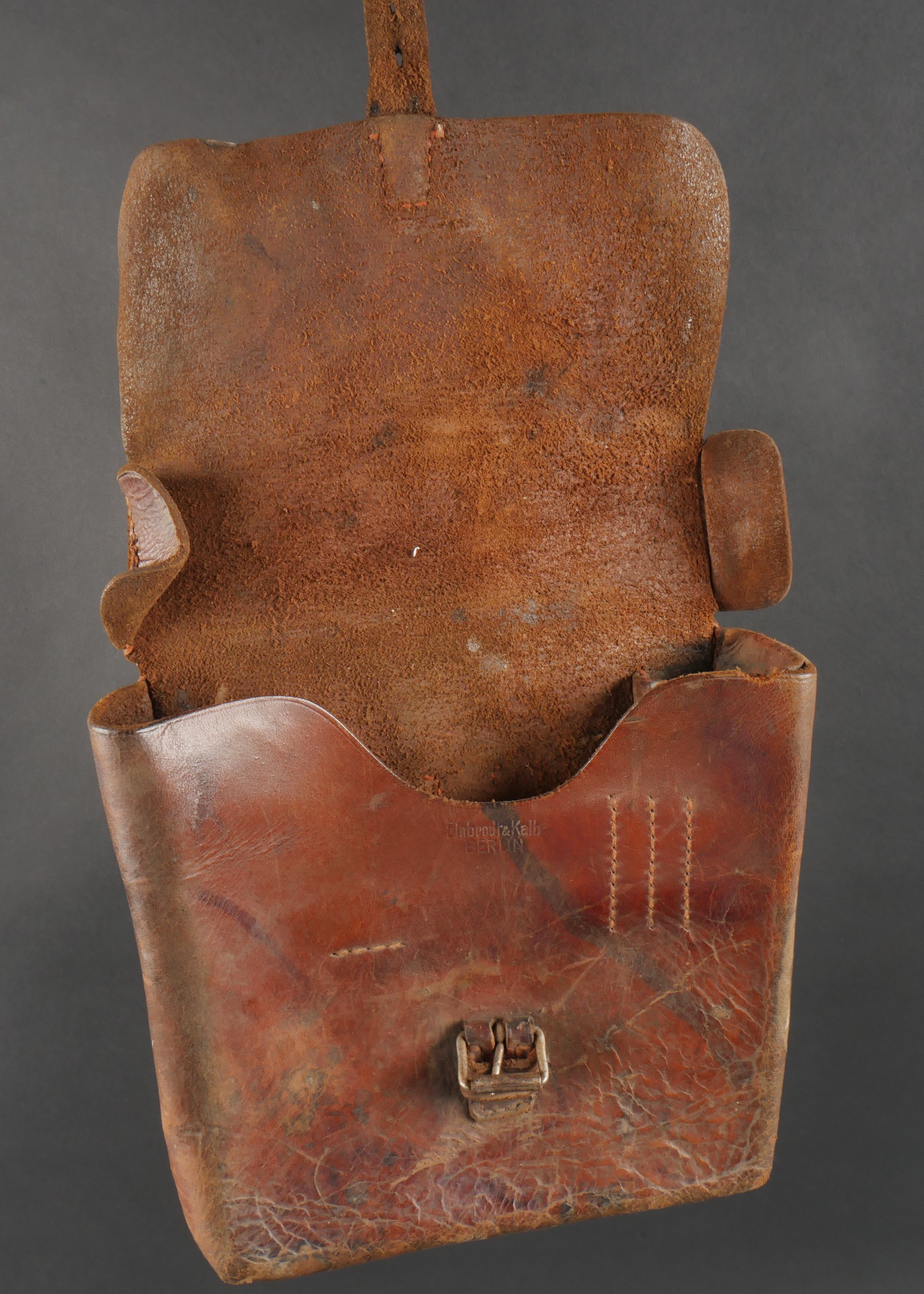 Sacoche de téléphoniste allemand de la 1ère Guerre. En cuir marron, marquée du fabricant Einbrodt & Kalb de Berlin. Rabat avec fermeture par sanglon, souple, et boucle à ardillon, fonctionnelle. Au dos 2 passants de ceinturon et anneau de suspension. A l’intérieur, initialement compartimenté, subsiste uniquement une petite sangle de maintien. Cuir souple. Usure d’usage. German First World War Telephone Operator’s PouchBrown leather pouch marked by manufacturer Einbrodt & Kalb, Berlin. Flap closed by strap and roller buckle, fully functional. Two belt loops and a suspension ring at the back. Interior originally divided, now retaining only a small holding strap. Supple leather with light wear from use.