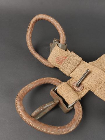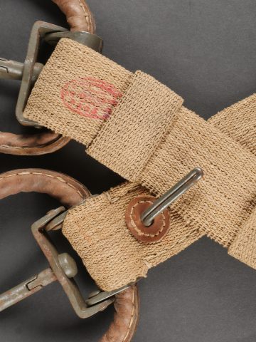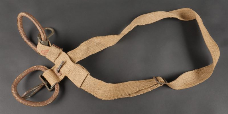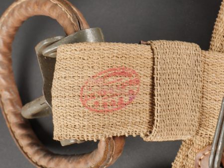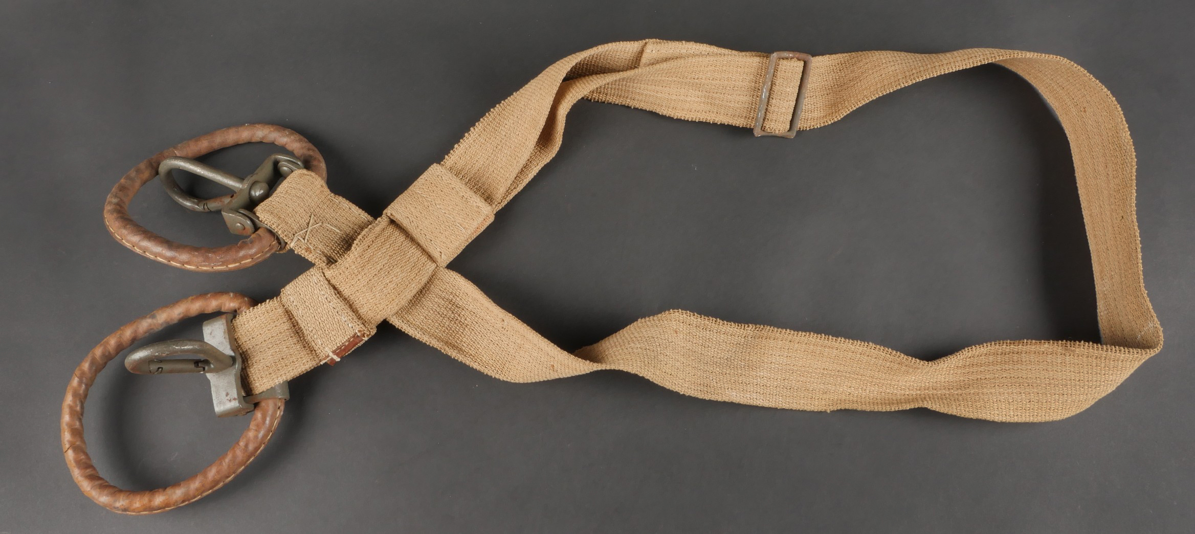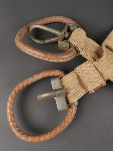 Sangle de mitrailleur allemand ersatz en ortie. Couleur beige, avec son passant, son crochet, ses mousquetons en peinture feldgrau, ses anneaux gainés de cuir. Tampon de fabricant à l’encre rouge. Fabrication 1918, en superbe état. German Ersatz Machine Gun Sling in Nettles FabricBeige sling with keeper, hook, and snap hooks painted in field-grey, with leather-covered rings. Red ink manufacturer’s stamp. Dated 1918, in superb condition.