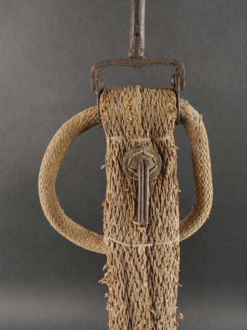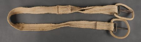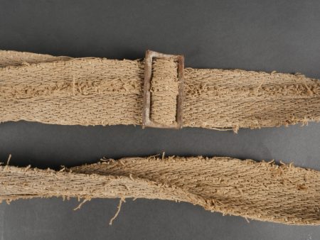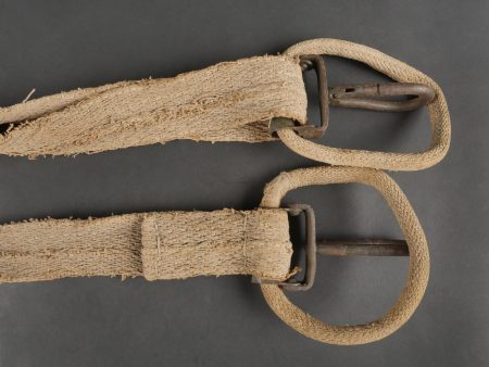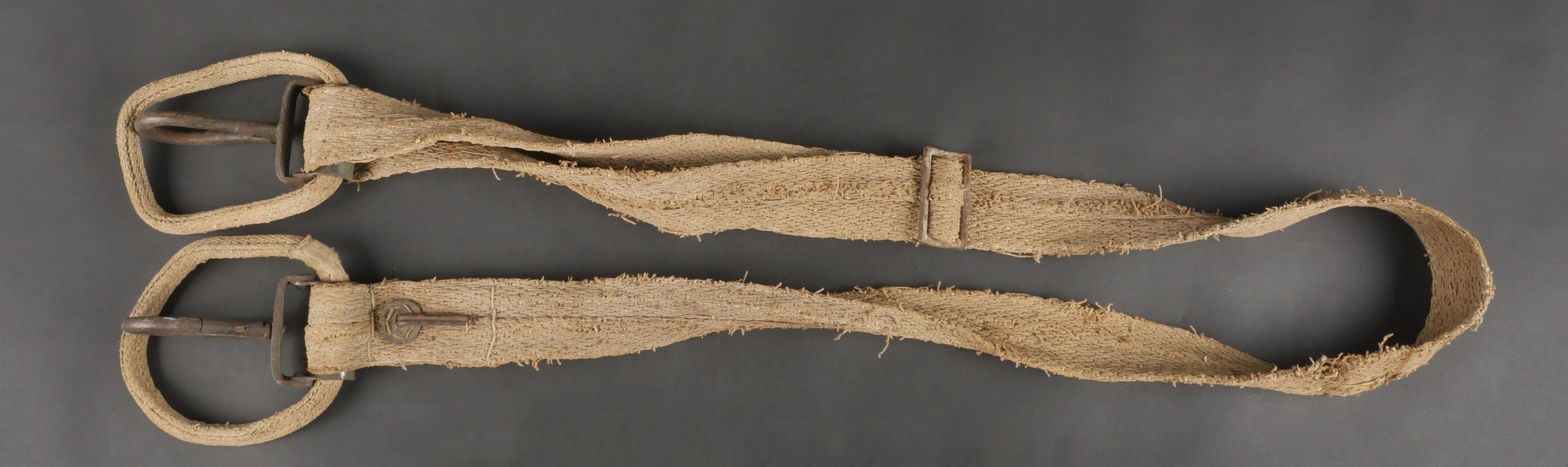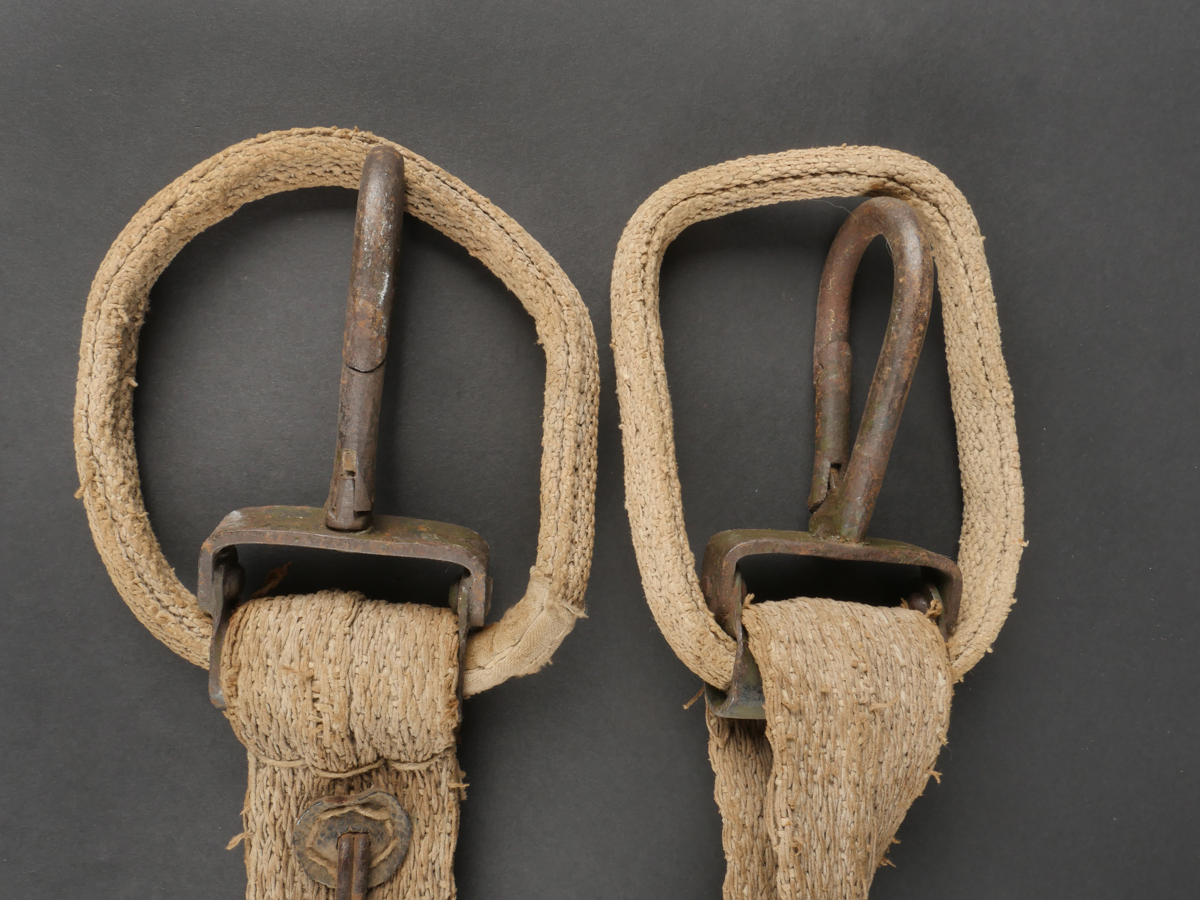 Sangle de mitrailleur allemand ersatz en ortie. Couleur beige, avec son crochet, ses longs mousquetons en peinture feldgrau, ses anneaux de tissu d’ortie. Passant manquant. Bonne sangle fabrication fin de guerre, en bon état, légère usure. German Ersatz Machine Gun Sling in Nettles FabricBeige-colored sling with hook, long snap hooks painted in field-grey, and rings made of nettle fabric. Missing keeper loop. A well-made late-war sling in good condition, showing light wear.