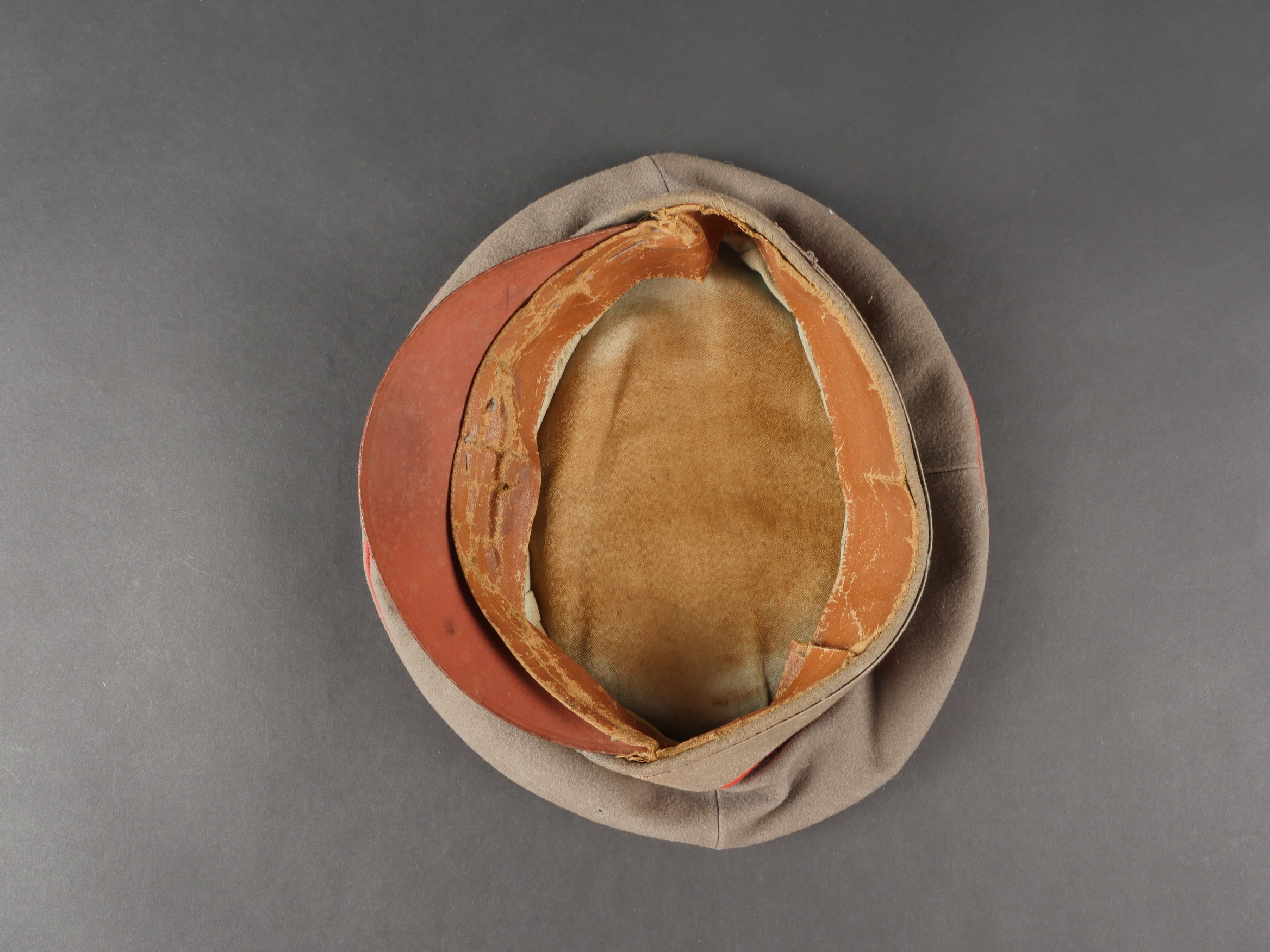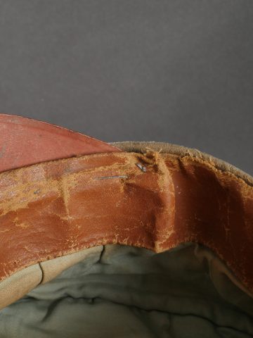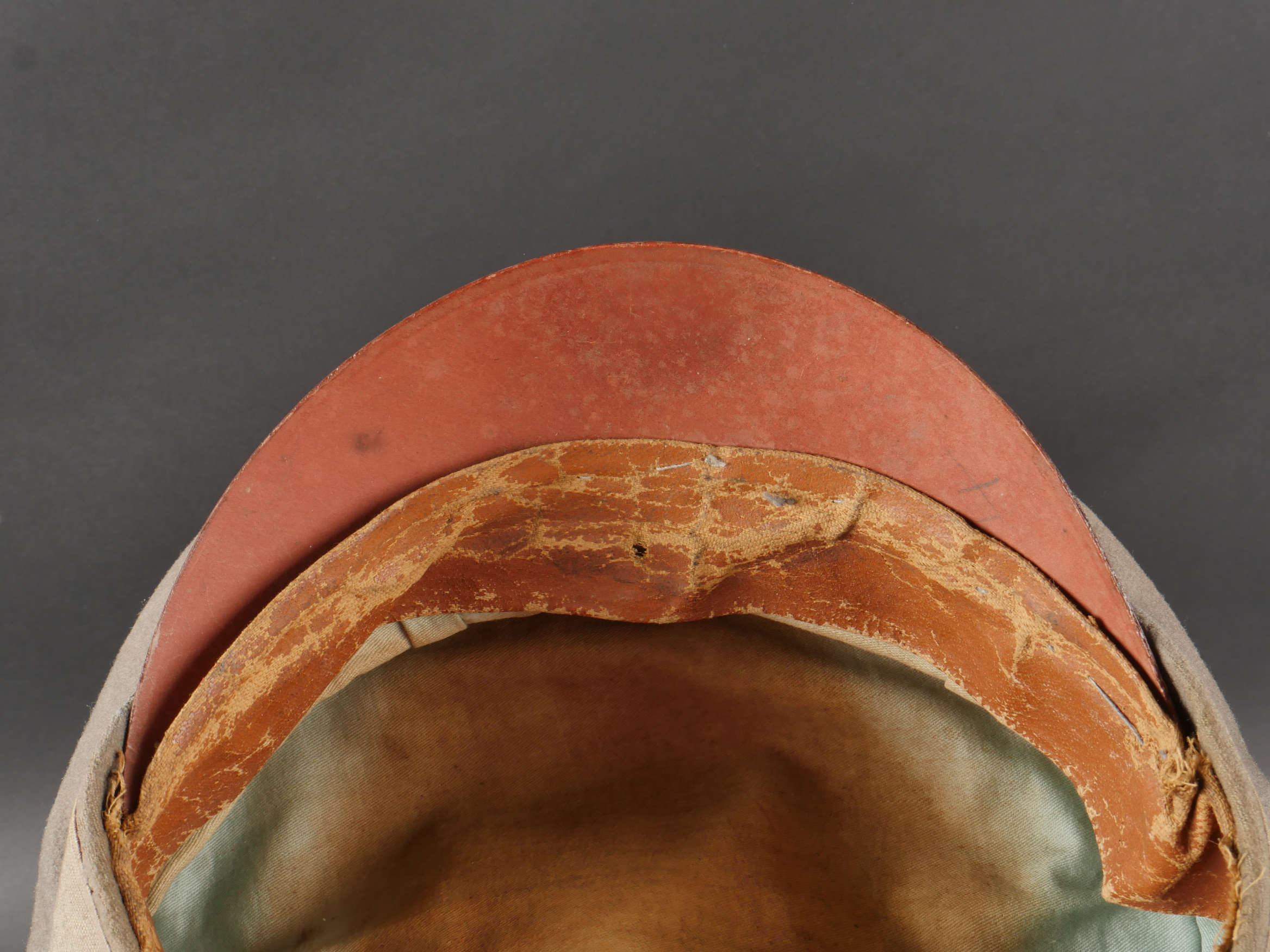 Schirmmütze M1910 feldgrau d’officier Prussien avec bande de camouflage. En drap feldgrau à bandeau et passepoil rouge. Casquette souple, fabrication de guerre. Bande de camouflage cousue sur le bandeau. Cocardes type officier aux couleur de l’Empire et de la Prusse. Visière en fibre, bandeau de sudation marron, doublure en tissu de soie bleu-vert, salie par un port prolongé, casquette ayant vu le terrain. Quelques trous minimes. Prussian Officer’s Field-Grey M1910 Visor Cap with Camouflage Band Field-grey cloth with red piping and band, soft wartime manufacture. Camouflage strip sewn over the band. Officer-type cockades in Imperial and Prussian colors. Fiber visor, brown leather sweatband, blue-green silk lining showing signs of field wear. Minor moth holes.