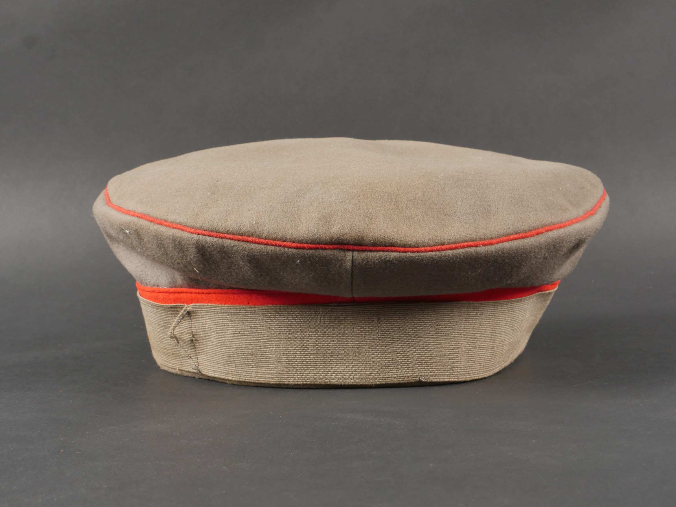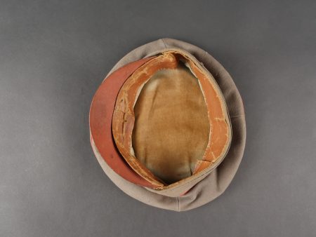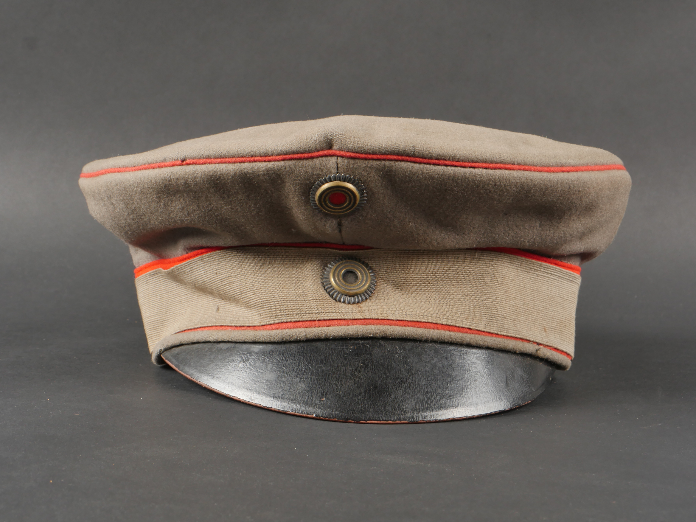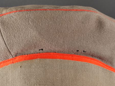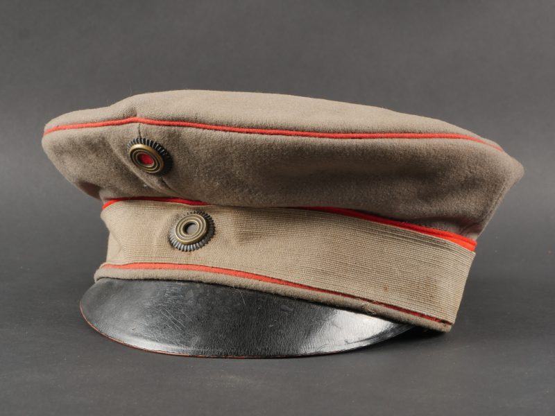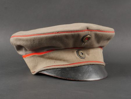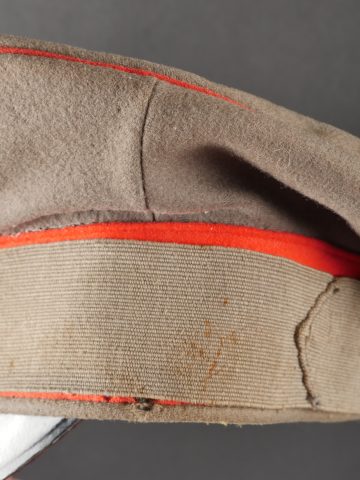Détails de la vente >Schirmmütze M1910 feldgrau d’officier Prussien avec bande de camouflage. En drap feldgrau à bandeau et passepoil rouge. Casquette souple, fabrication de guerre. Bande de camouflage cousue... en savoir plus