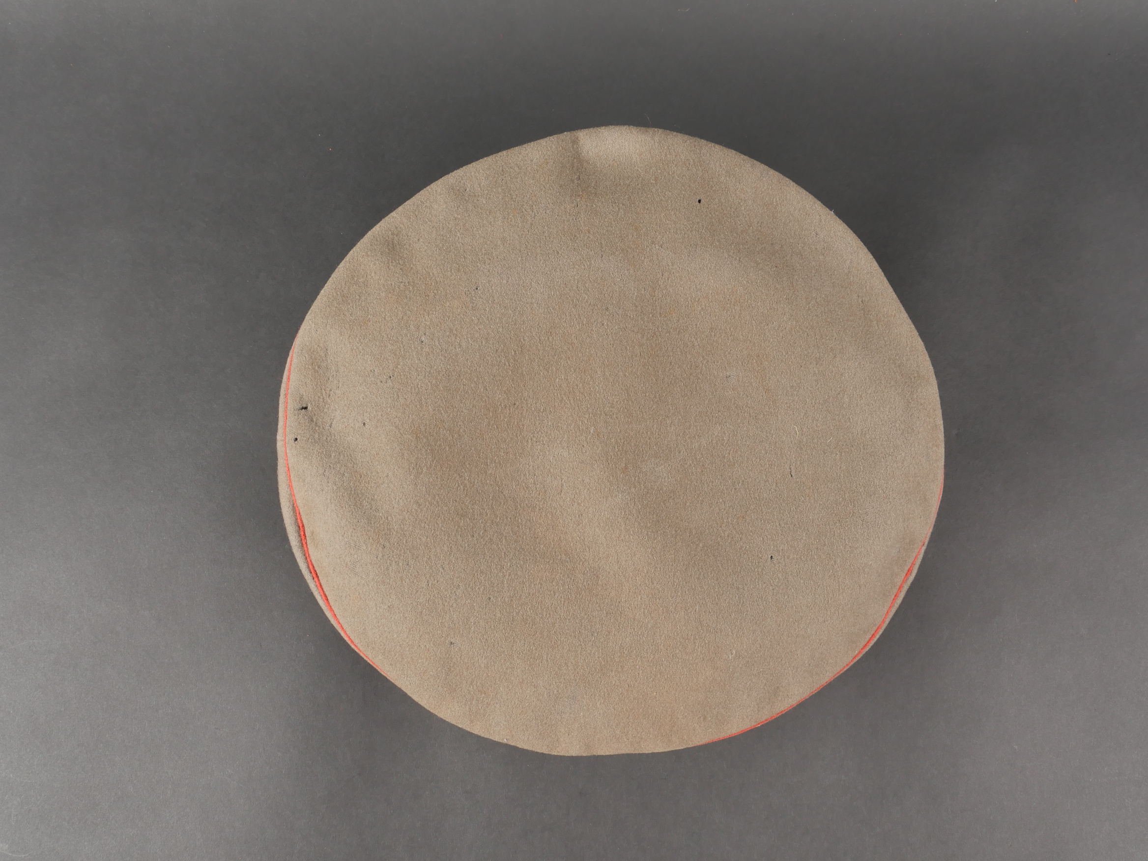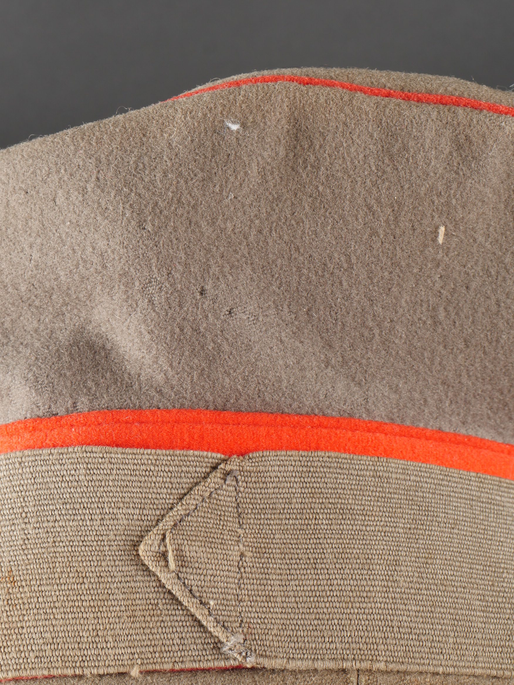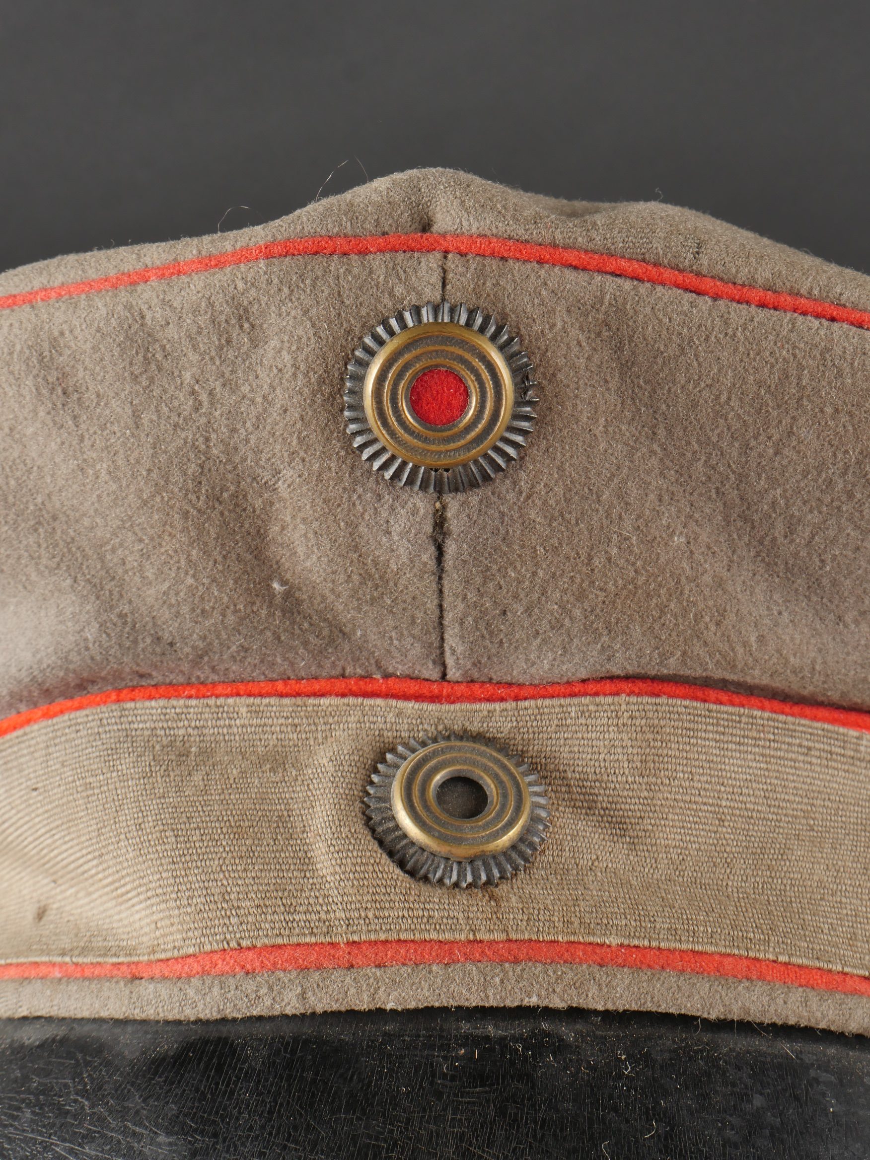 Détails de la vente >Schirmmütze M1910 feldgrau d’officier Prussien avec bande de camouflage. En drap feldgrau à bandeau et passepoil rouge. Casquette souple, fabrication de guerre. Bande de camouflage cousue... en savoir plus