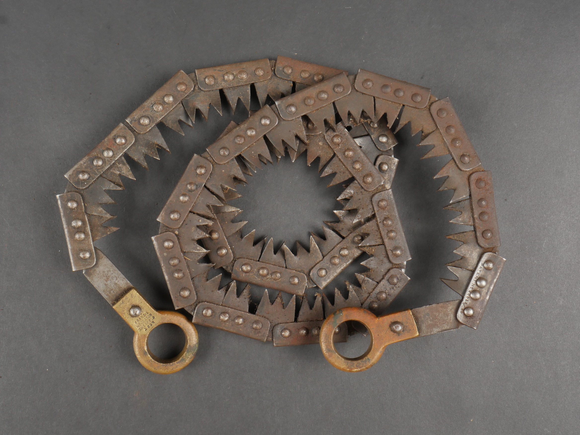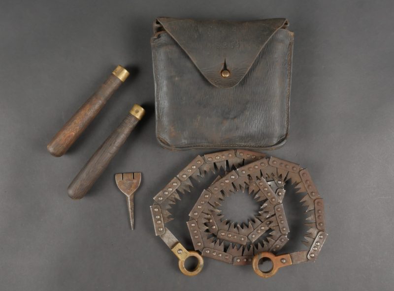 Détails de la vente >Scie articulée anglaise dans son étui cuir. Scie articulée bien marquée et datée 1917, avec ses poignées bois, son outil d’affûtage daté 1914, dans son étui en cuir daté 1915.... en savoir plus