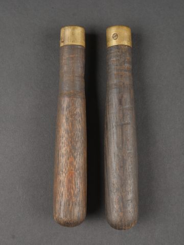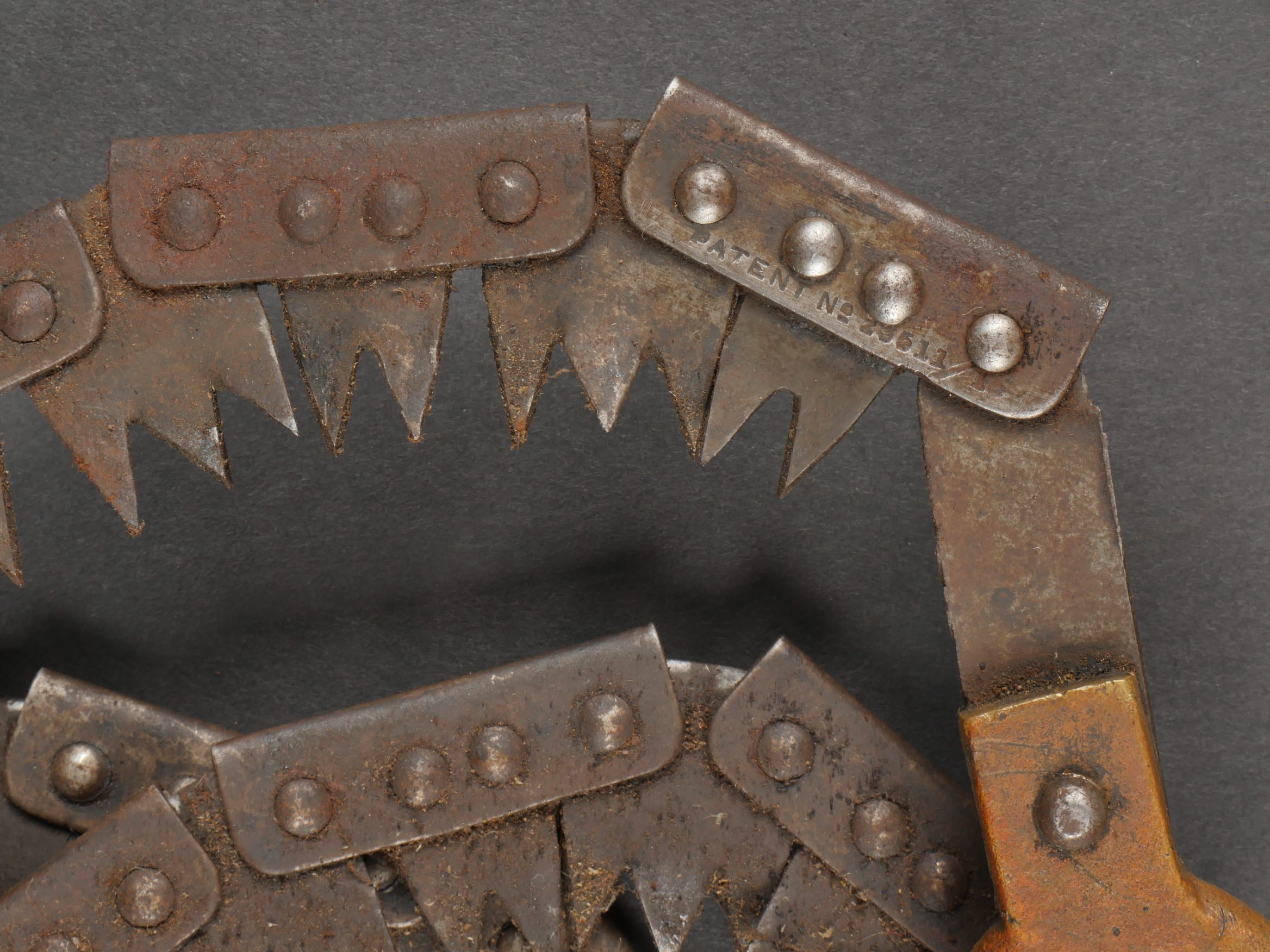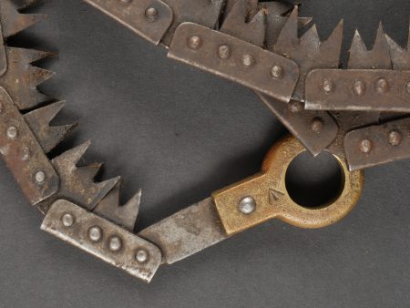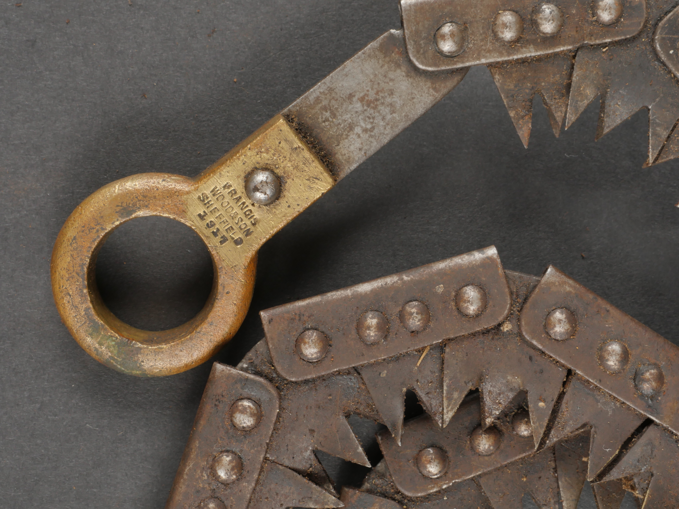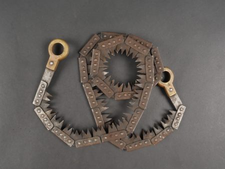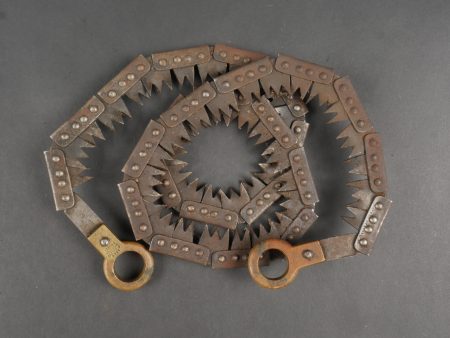 Scie articulée anglaise dans son étui cuir. Scie articulée bien marquée et datée 1917, avec ses poignées bois, son outil d’affûtage daté 1914, dans son étui en cuir daté 1915.... en savoir plus
