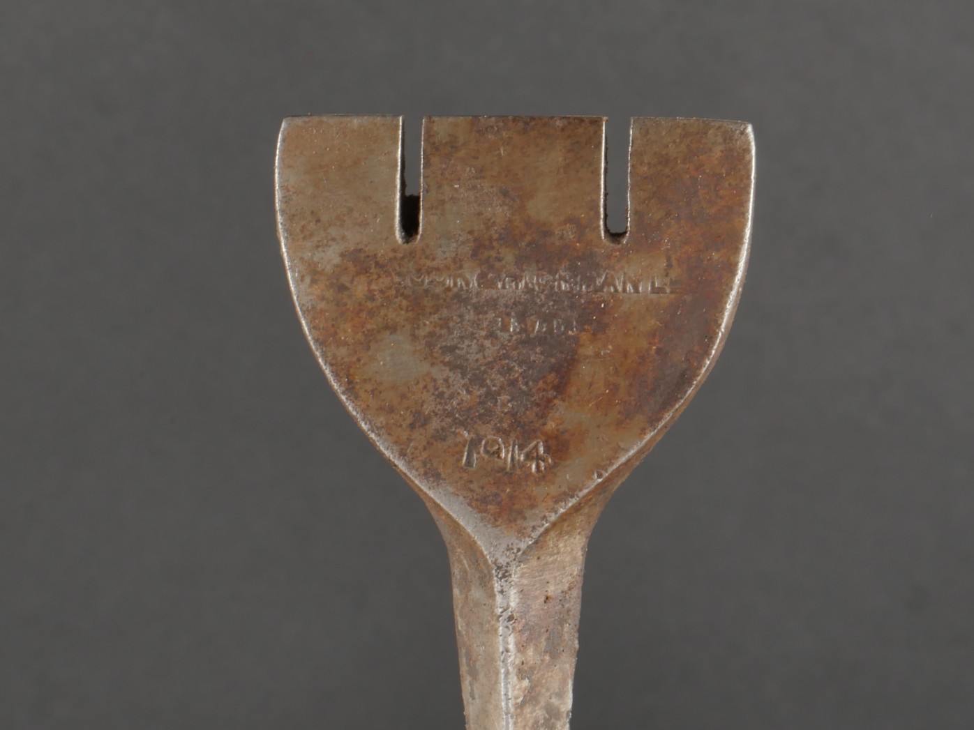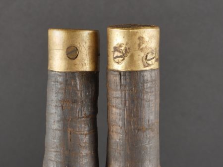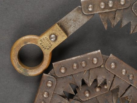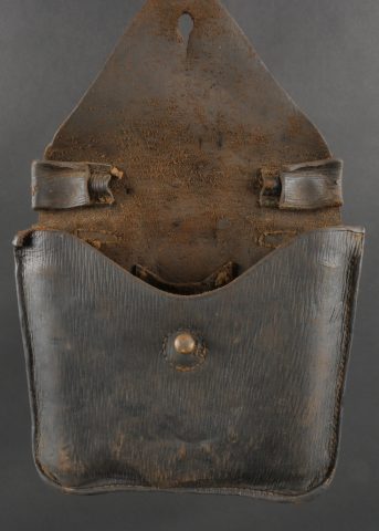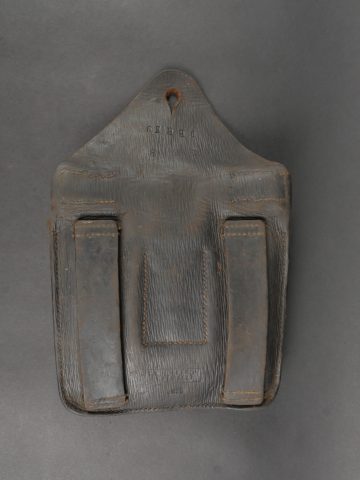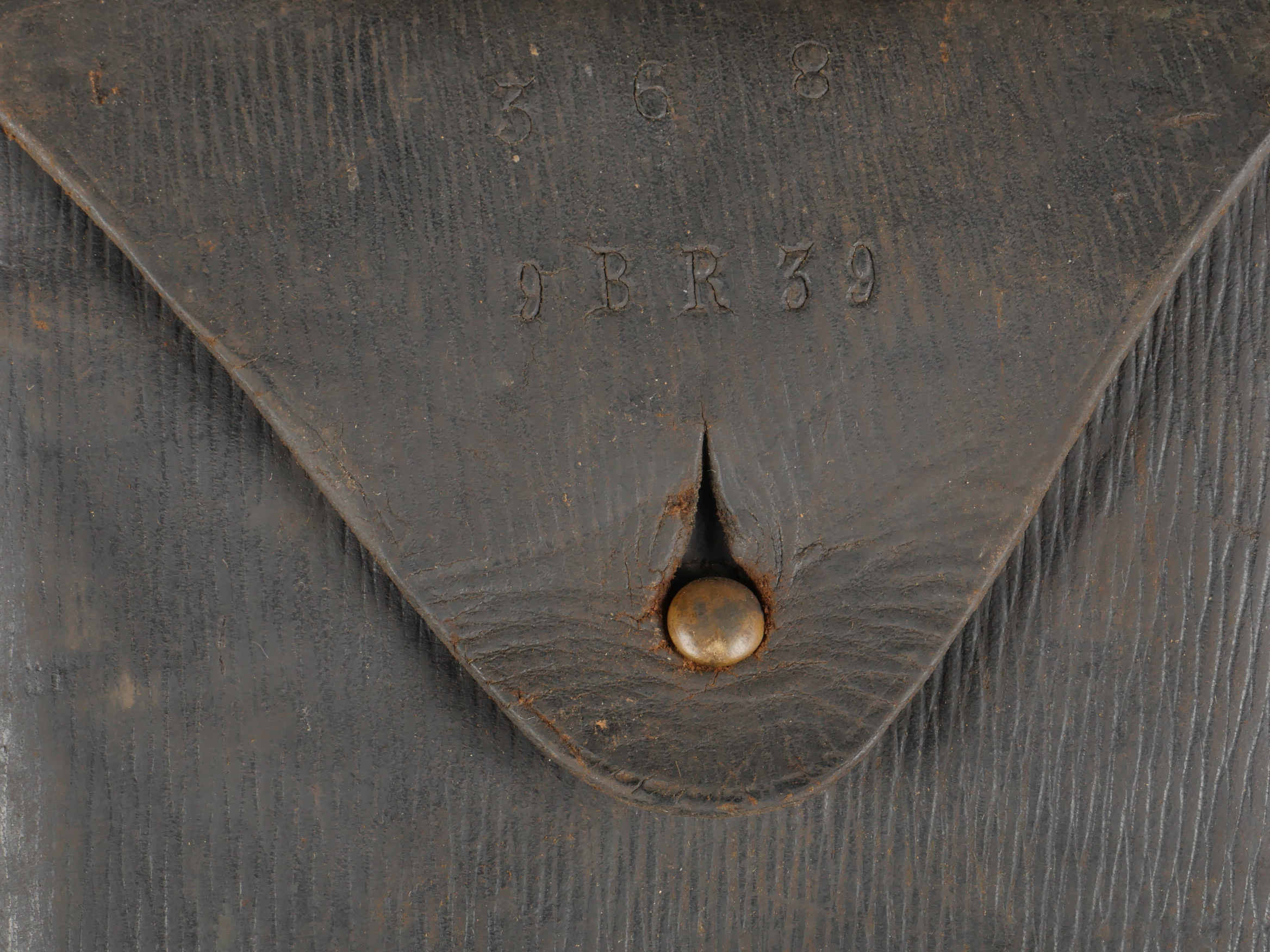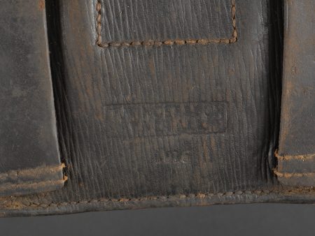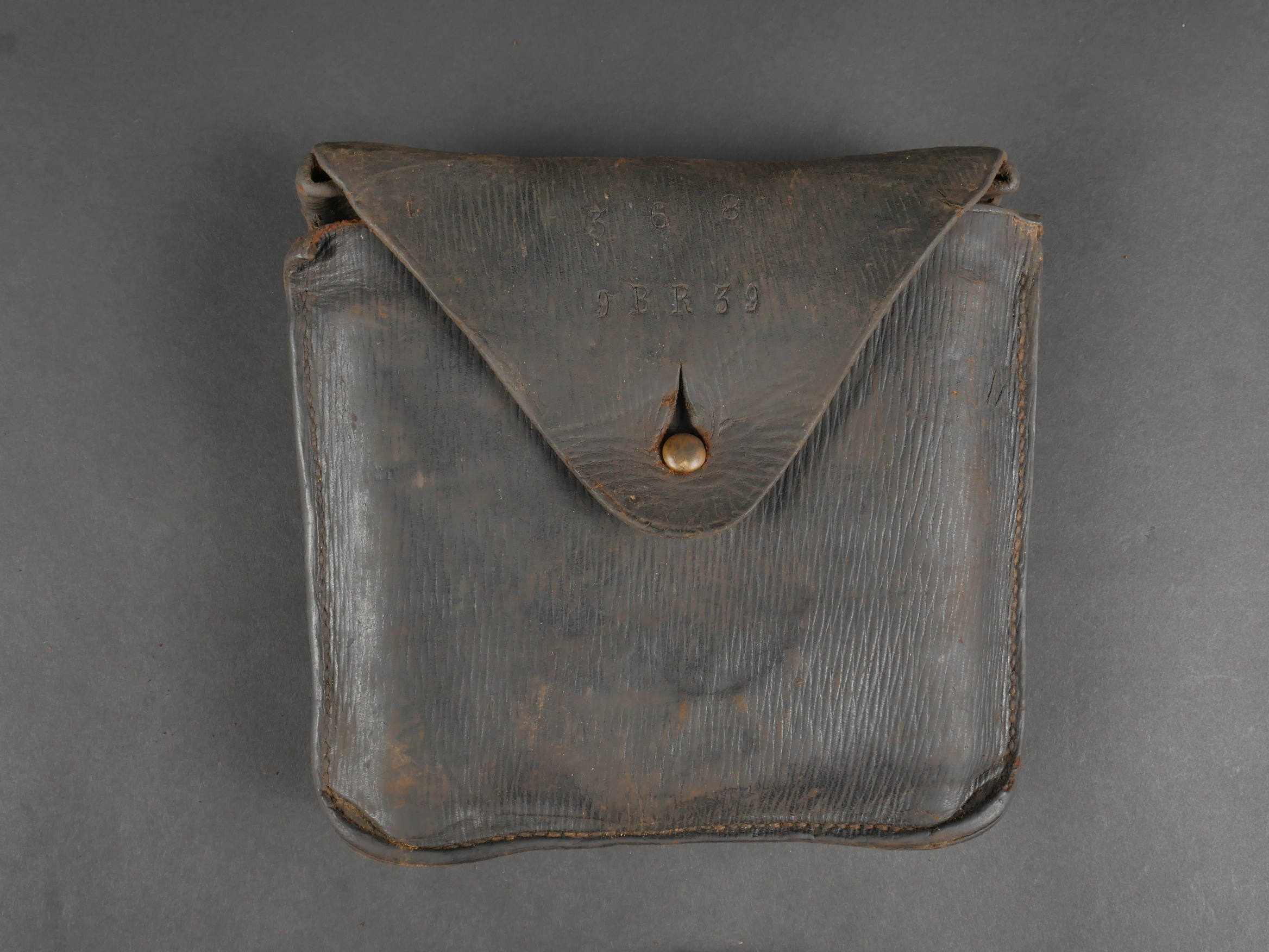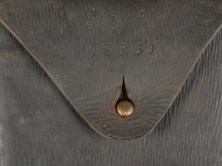 Scie articulée anglaise dans son étui cuir. Scie articulée bien marquée et datée 1917, avec ses poignées bois, son outil d’affûtage daté 1914, dans son étui en cuir daté 1915. Marquage sur le rabat 9 BR 39, peut être 9th Battalion the (Scottish) Borderers Regiment ? avec un matricule 368. Usure d’usage, patine. British Folding Saw in Leather CaseArticulated saw clearly marked and dated 1917 with wooden handles, complete with 1914-dated sharpening tool, housed in a 1915-dated leather case. Flap marked “9 BR 39,” likely “9th Battalion (Scottish) Borderers,” with service number “368.” Used condition with patina.