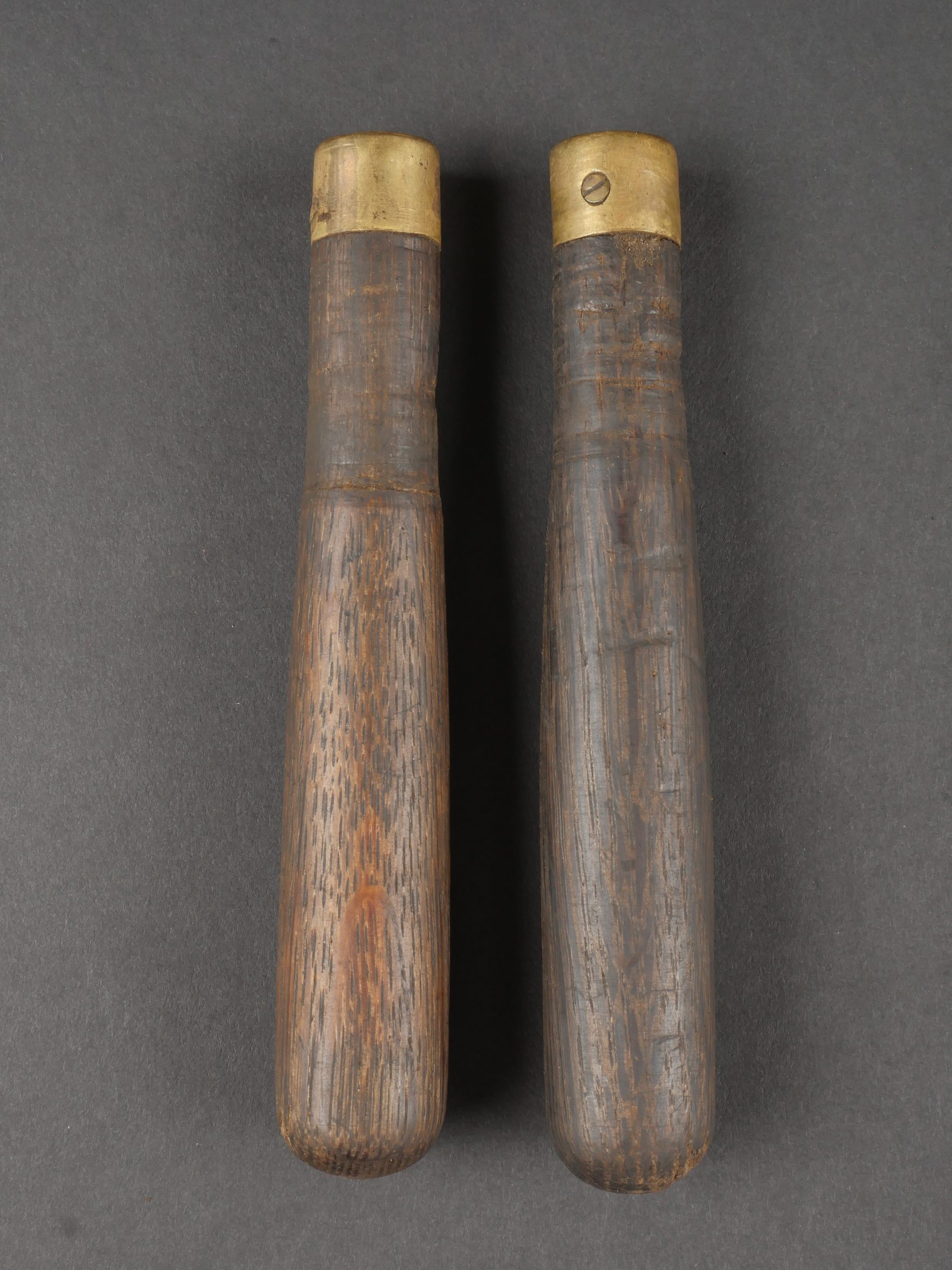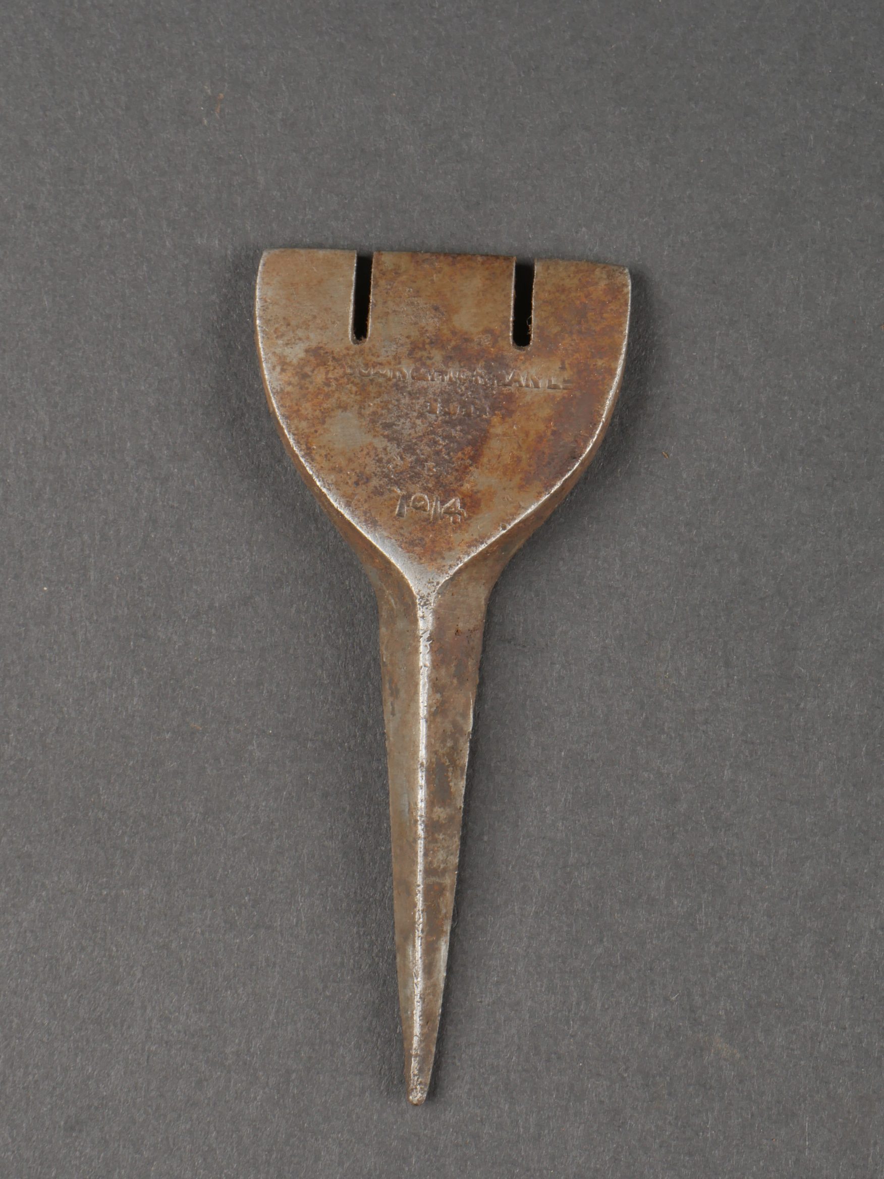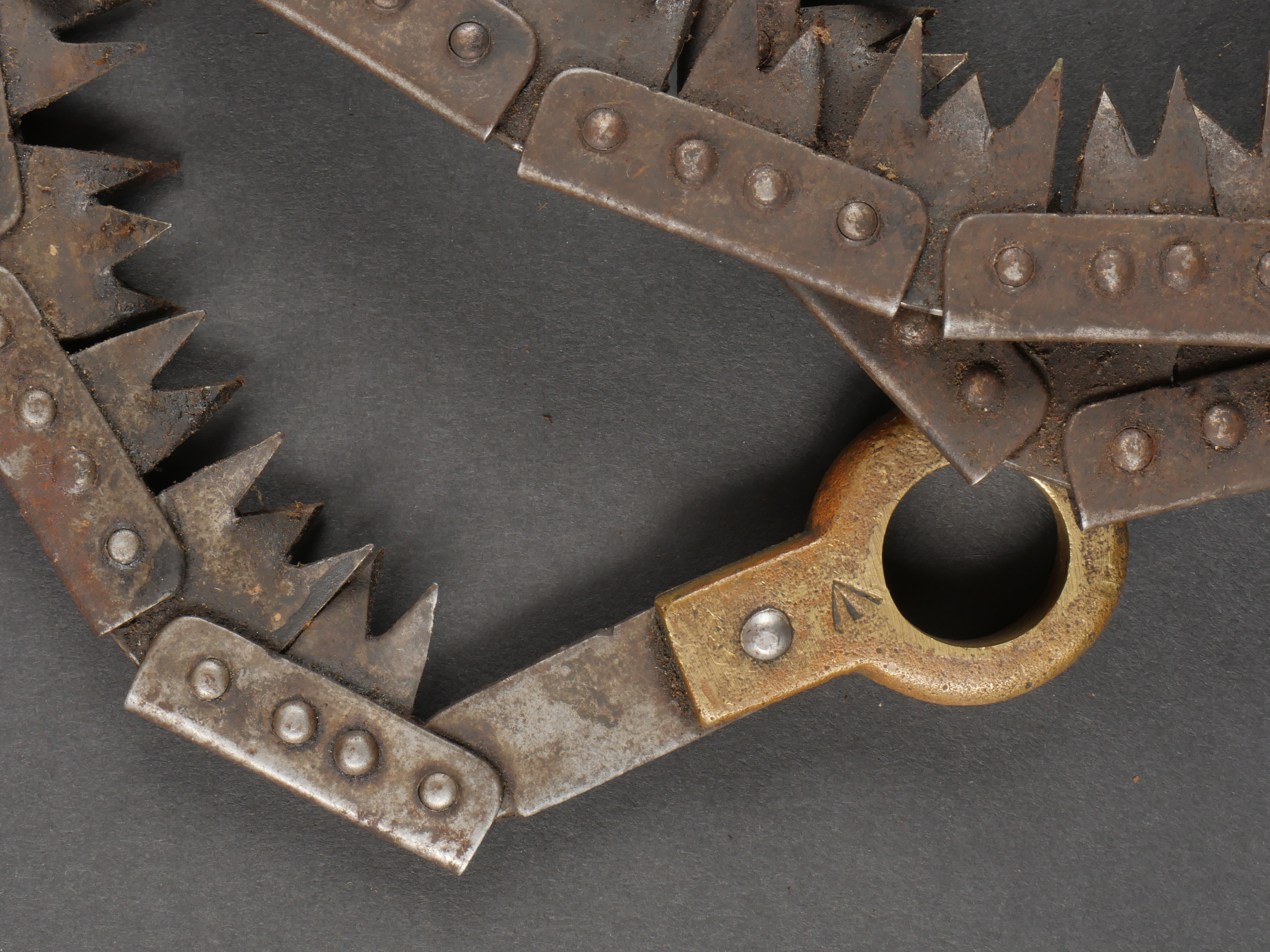 Scie articulée anglaise dans son étui cuir. Scie articulée bien marquée et datée 1917, avec ses poignées bois, son outil d’affûtage daté 1914, dans son étui en cuir daté 1915. Marquage sur le rabat 9 BR 39, peut être 9th Battalion the (Scottish) Borderers Regiment ? avec un matricule 368. Usure d’usage, patine. British Folding Saw in Leather CaseArticulated saw clearly marked and dated 1917 with wooden handles, complete with 1914-dated sharpening tool, housed in a 1915-dated leather case. Flap marked “9 BR 39,” likely “9th Battalion (Scottish) Borderers,” with service number “368.” Used condition with patina.