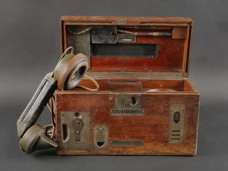 Téléphone de campagne allemand Feldfernsprecher 16 type B. Téléphone de campagne modèle 1916 type B du fabricant Siemens & Halske, dans sa boîte en bois vernis, complet de son combiné,... en savoir plus