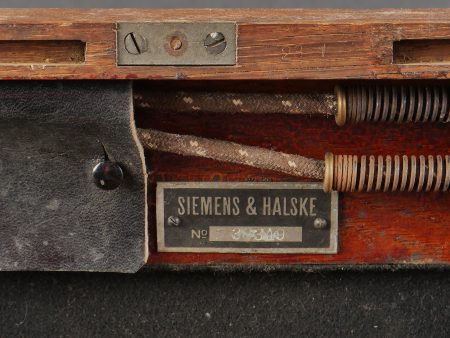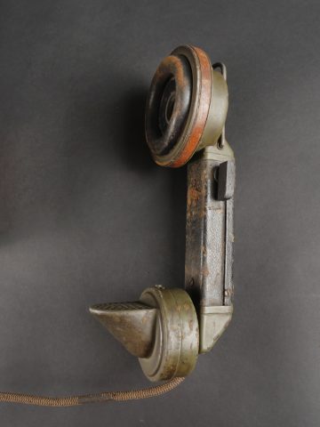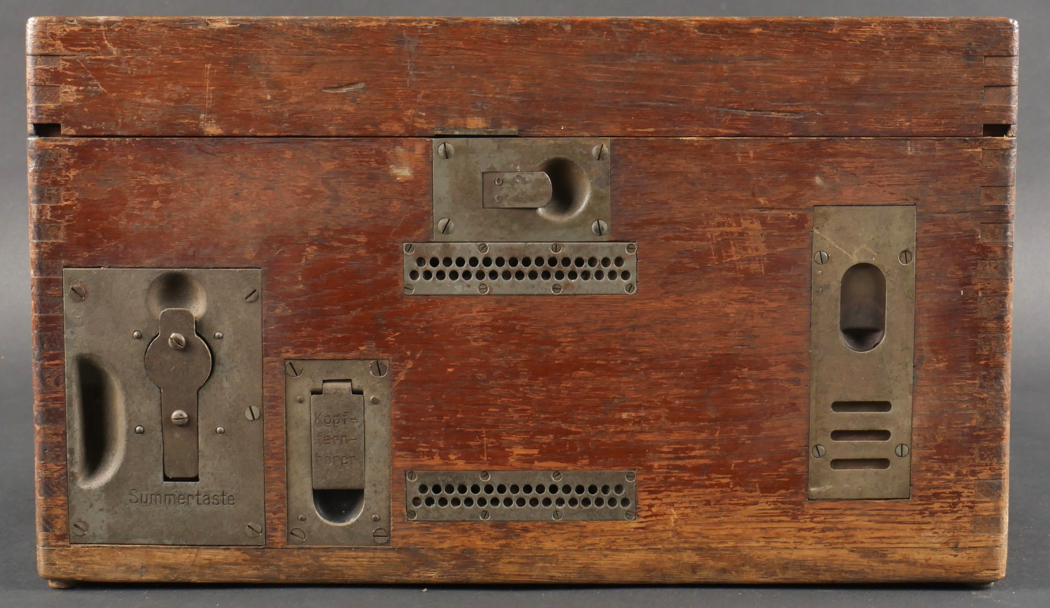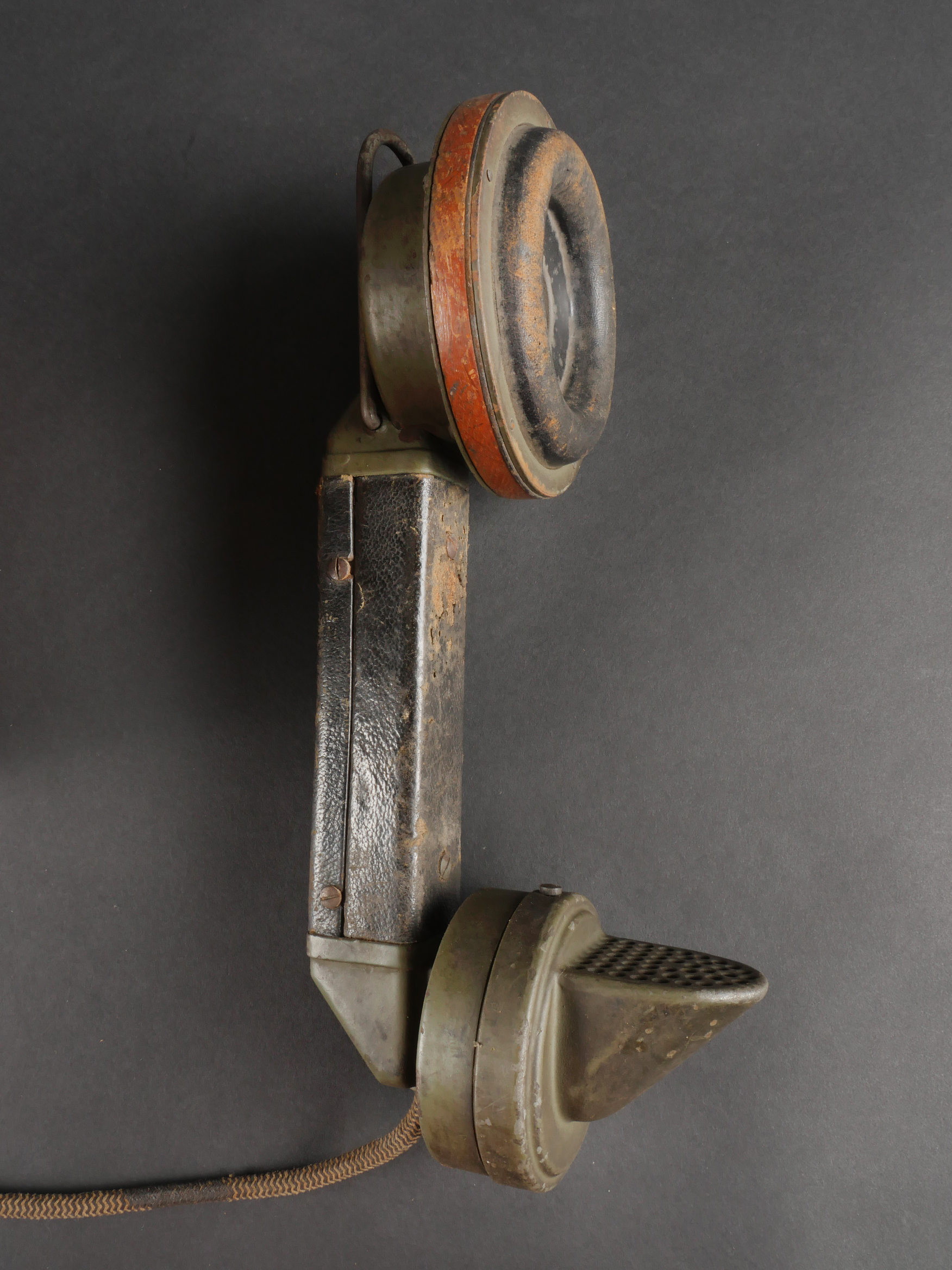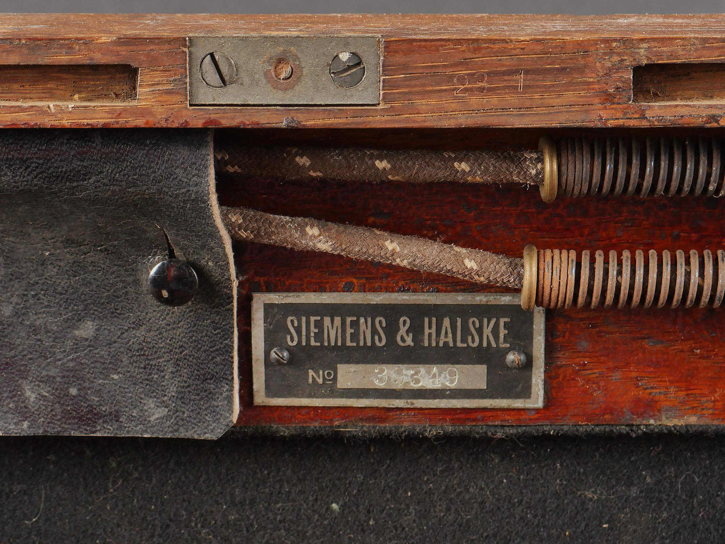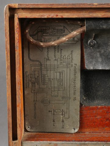 Téléphone de campagne allemand Feldfernsprecher 16 type B. Téléphone de campagne modèle 1916 type B du fabricant Siemens & Halske, dans sa boîte en bois vernis, complet de son combiné, sa manivelle, sa plaque signalétique interne et son cordon de connexion. Les grilles, plaques, manipulateur morse et connecteurs externes sont présents. La sangle de portage a été comme presque toujours coupée. L’ergot de fermeture du couvercle est manquant. Objet présentant une usure et une patine importante, mais facilement améliorable. German Field Telephone Feldfernsprecher 16 Type BModel 1916 Type B field telephone made by Siemens & Halske, housed in its varnished wooden box. Complete with handset, crank, internal identification plate, and connecting cord. Grilles, plates, Morse key, and external connectors all present. Carrying strap, as usual, has been cut. Lid locking lug missing. Shows significant wear and patina but remains easily restorable.