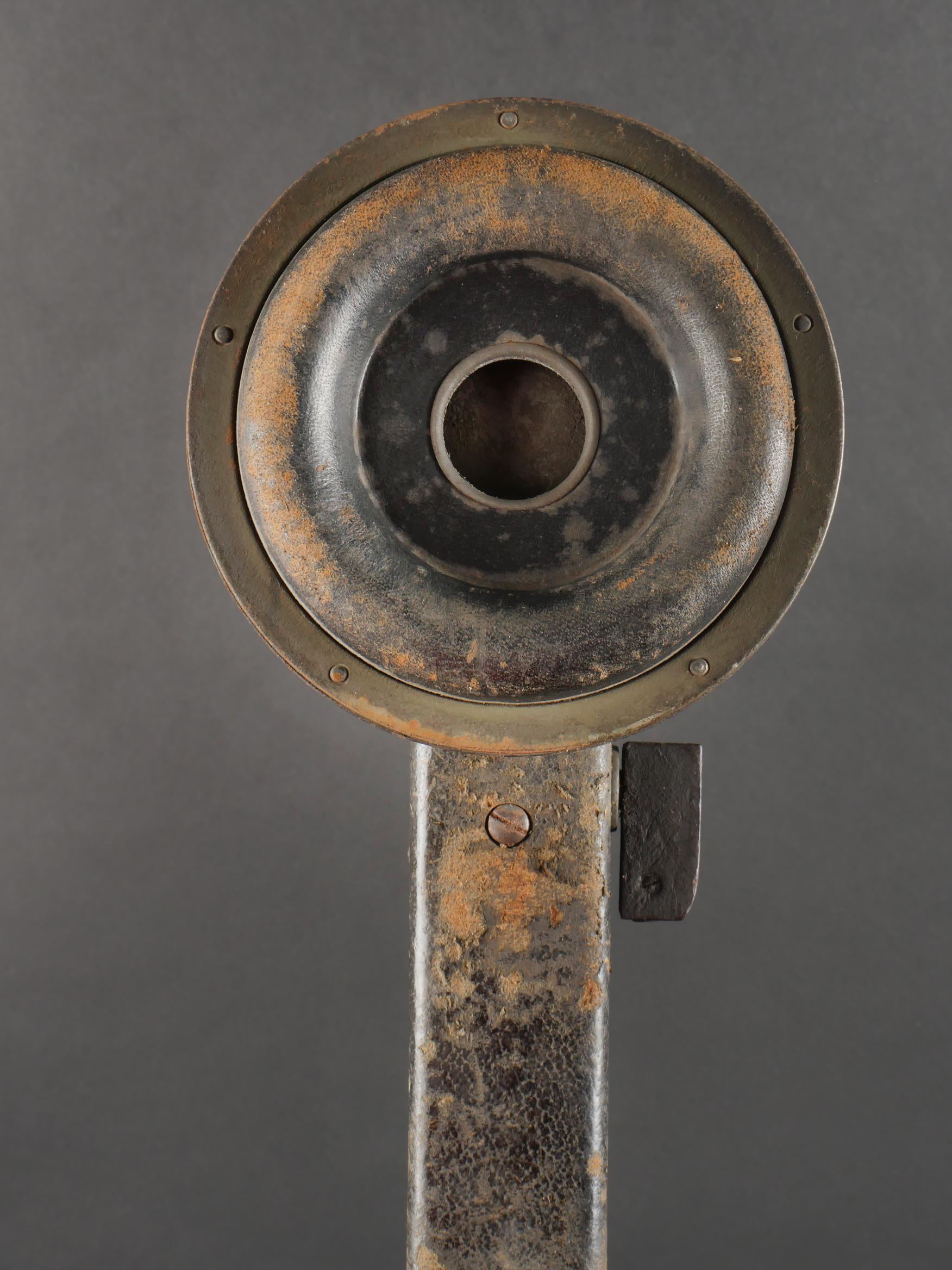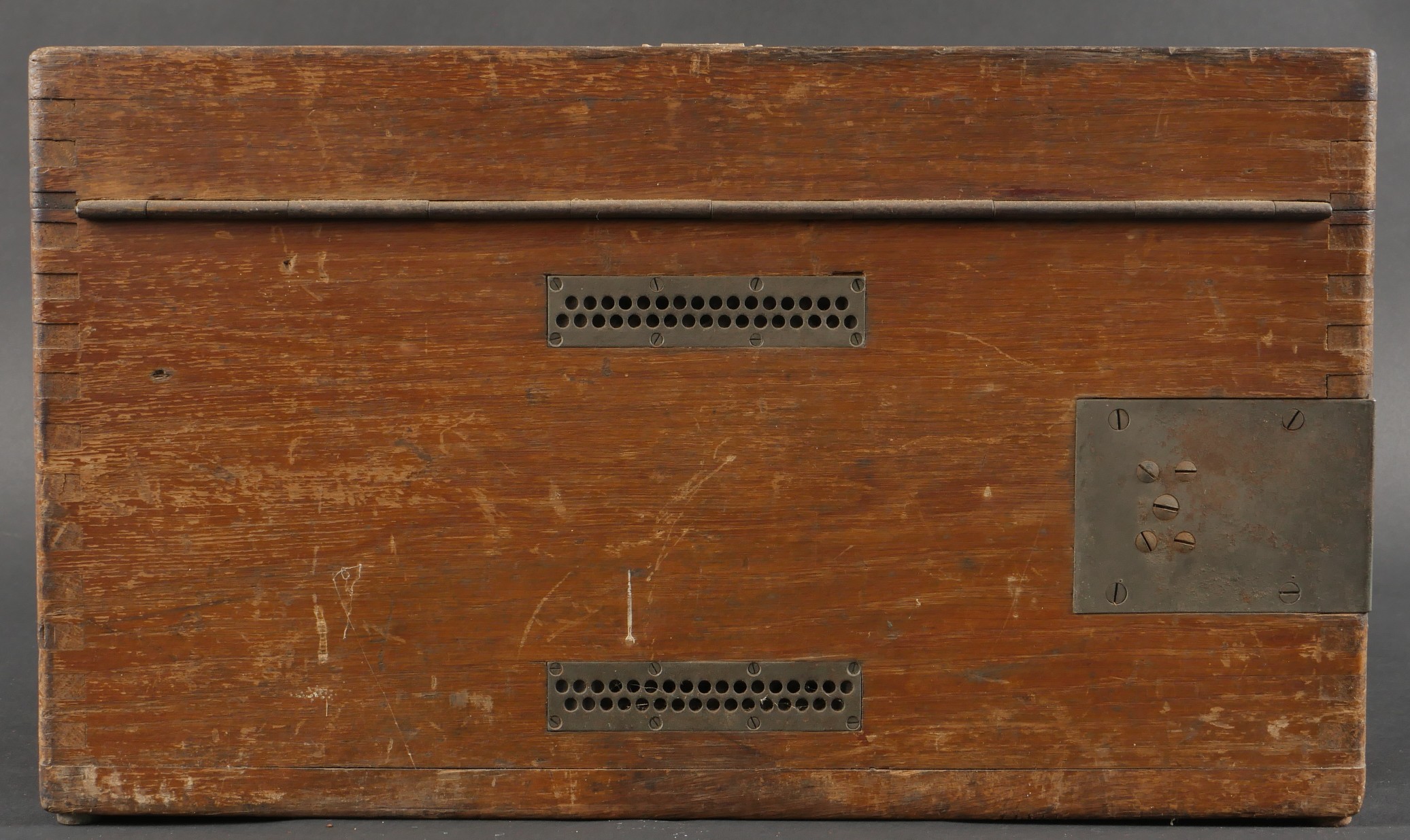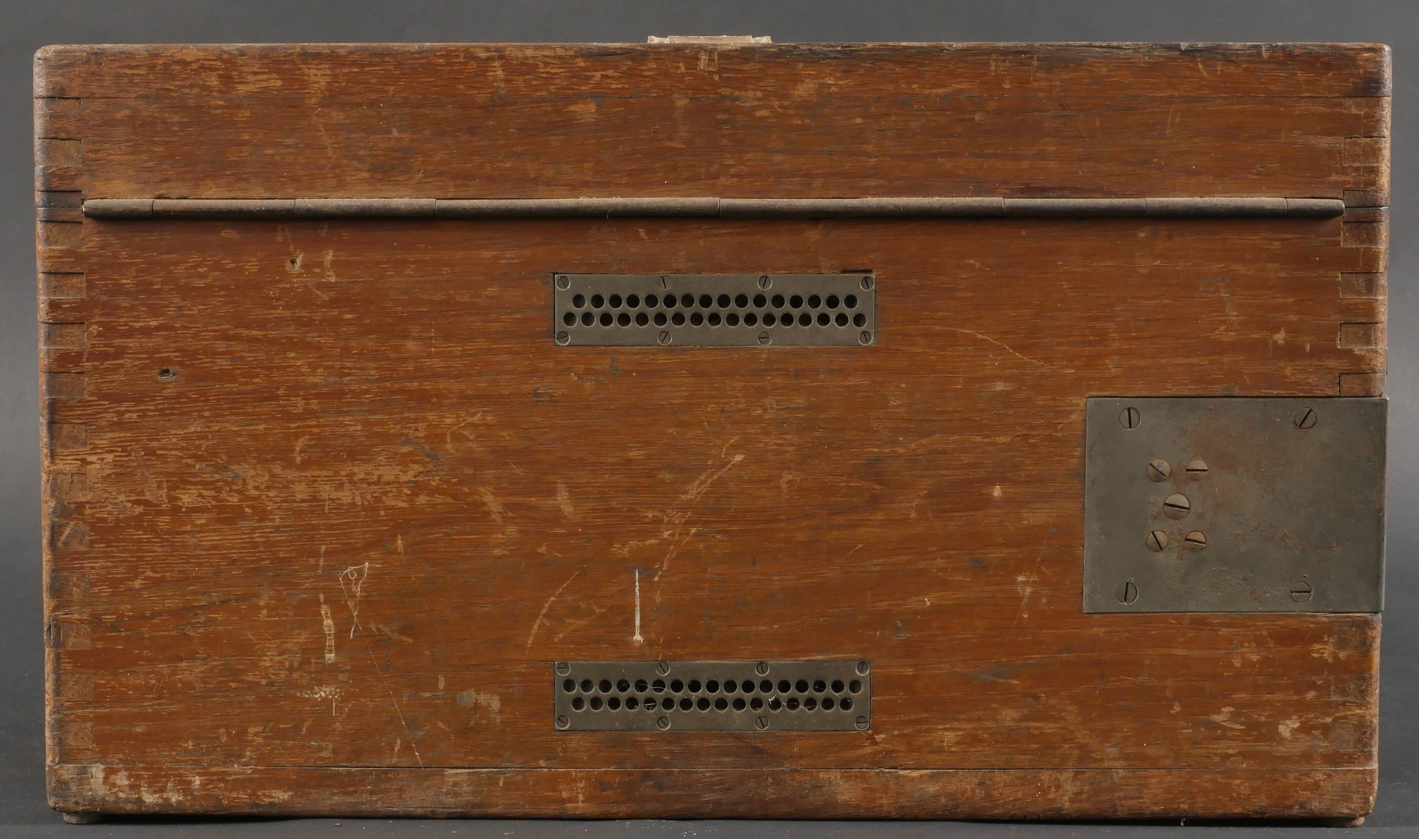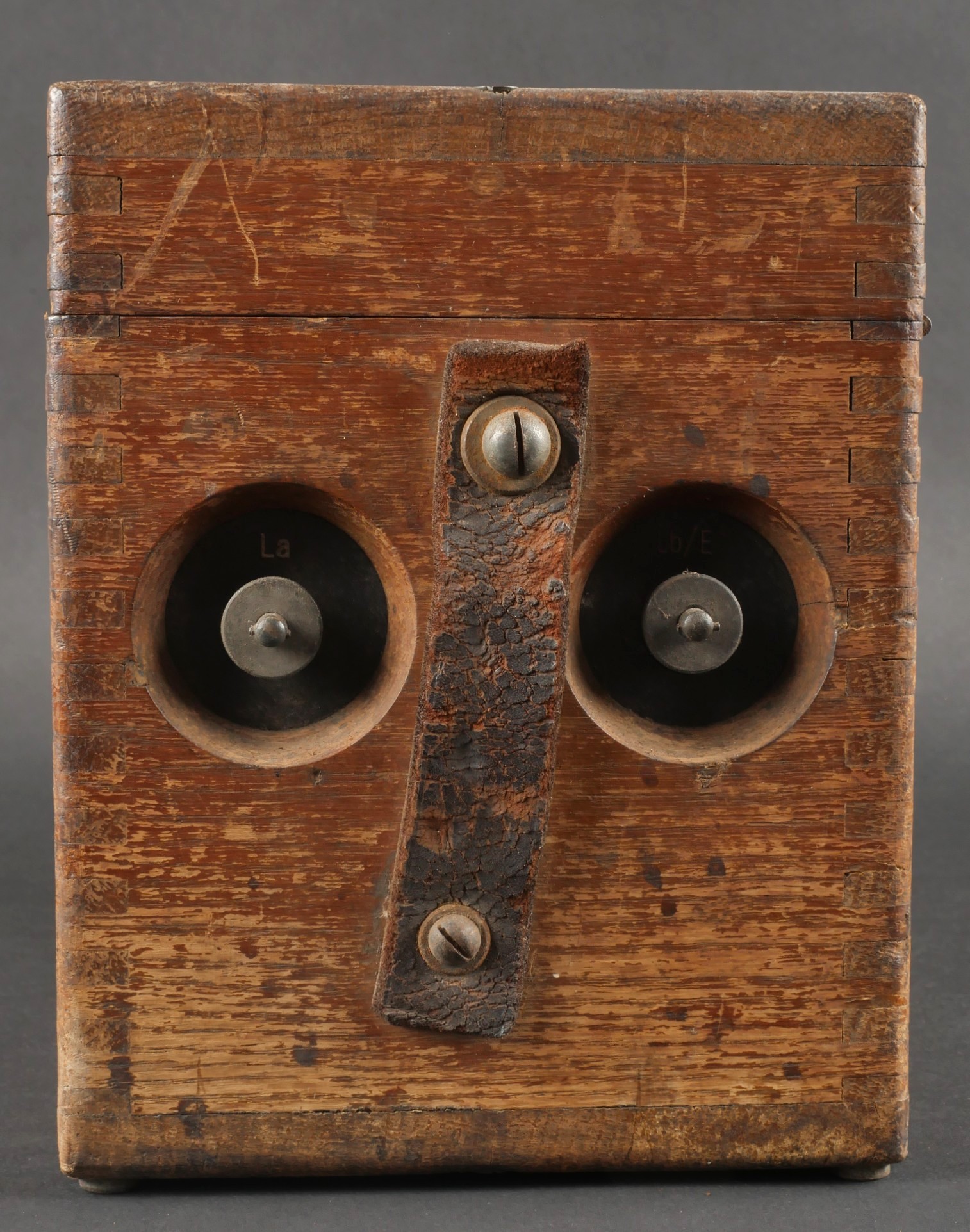 Téléphone de campagne allemand Feldfernsprecher 16 type B. Téléphone de campagne modèle 1916 type B du fabricant Siemens & Halske, dans sa boîte en bois vernis, complet de son combiné, sa manivelle, sa plaque signalétique interne et son cordon de connexion. Les grilles, plaques, manipulateur morse et connecteurs externes sont présents. La sangle de portage a été comme presque toujours coupée. L’ergot de fermeture du couvercle est manquant. Objet présentant une usure et une patine importante, mais facilement améliorable. German Field Telephone Feldfernsprecher 16 Type BModel 1916 Type B field telephone made by Siemens & Halske, housed in its varnished wooden box. Complete with handset, crank, internal identification plate, and connecting cord. Grilles, plates, Morse key, and external connectors all present. Carrying strap, as usual, has been cut. Lid locking lug missing. Shows significant wear and patina but remains easily restorable.