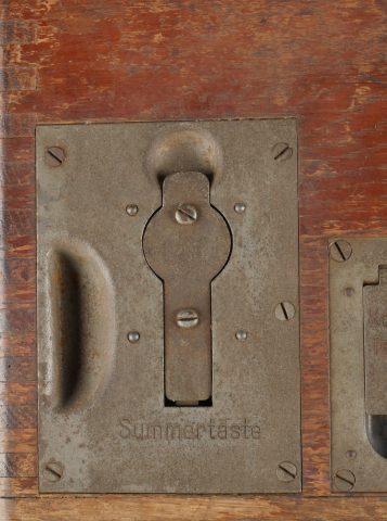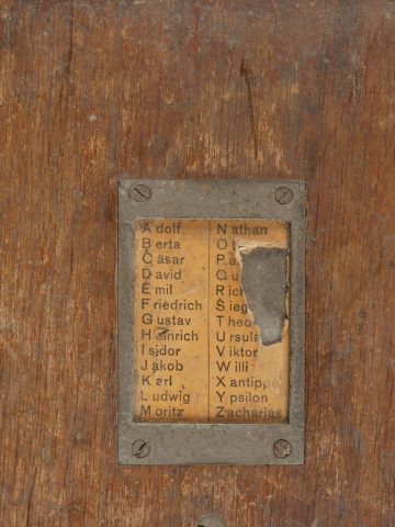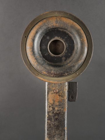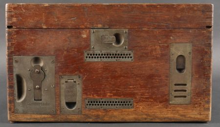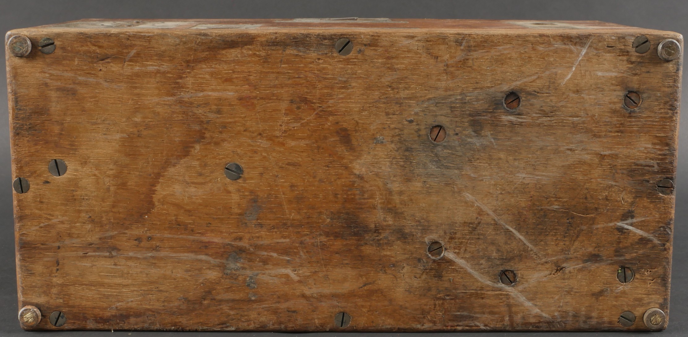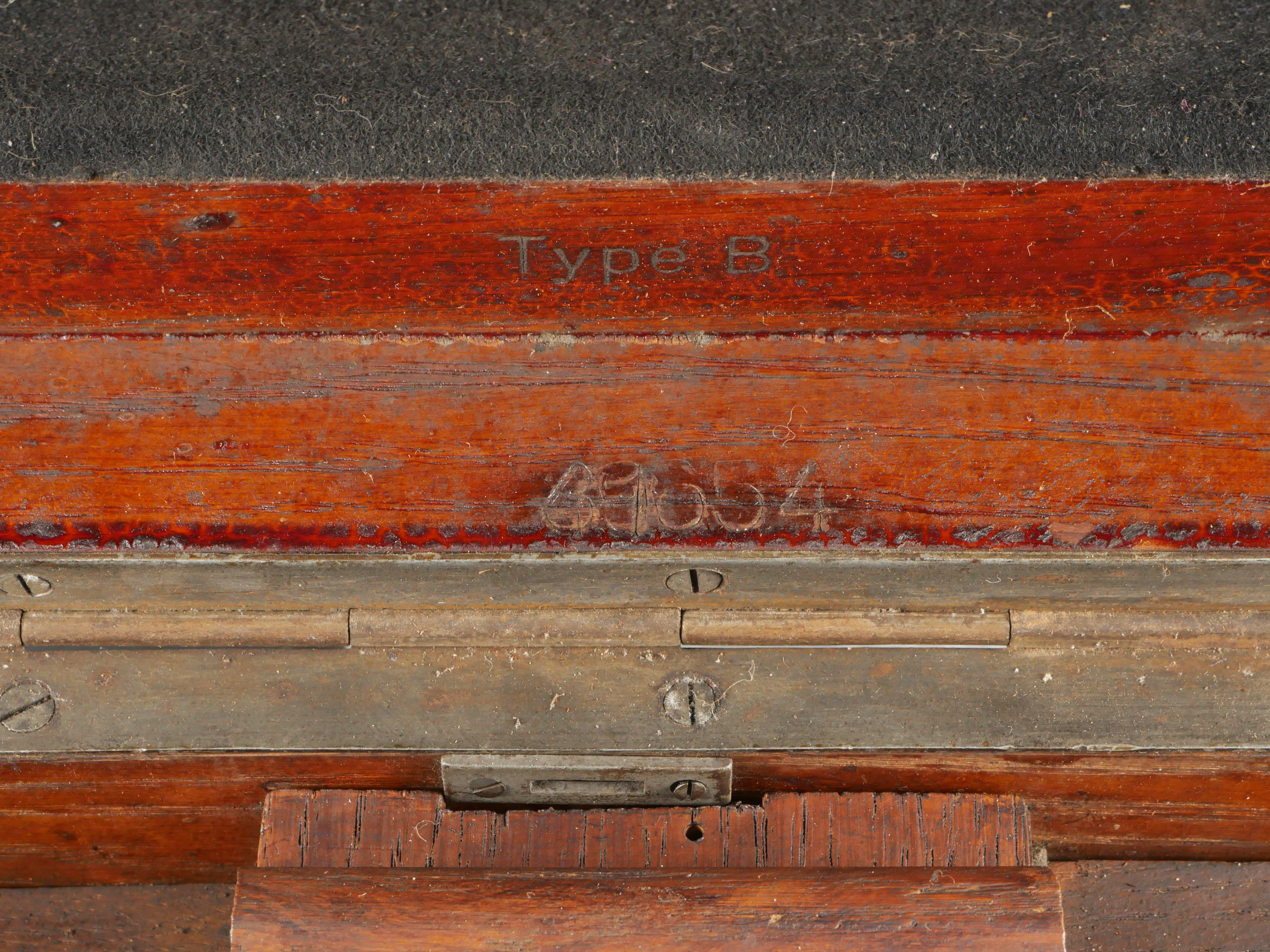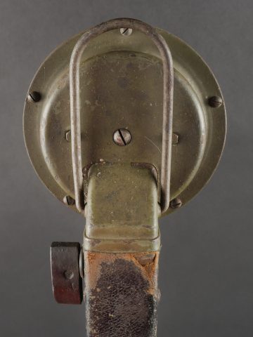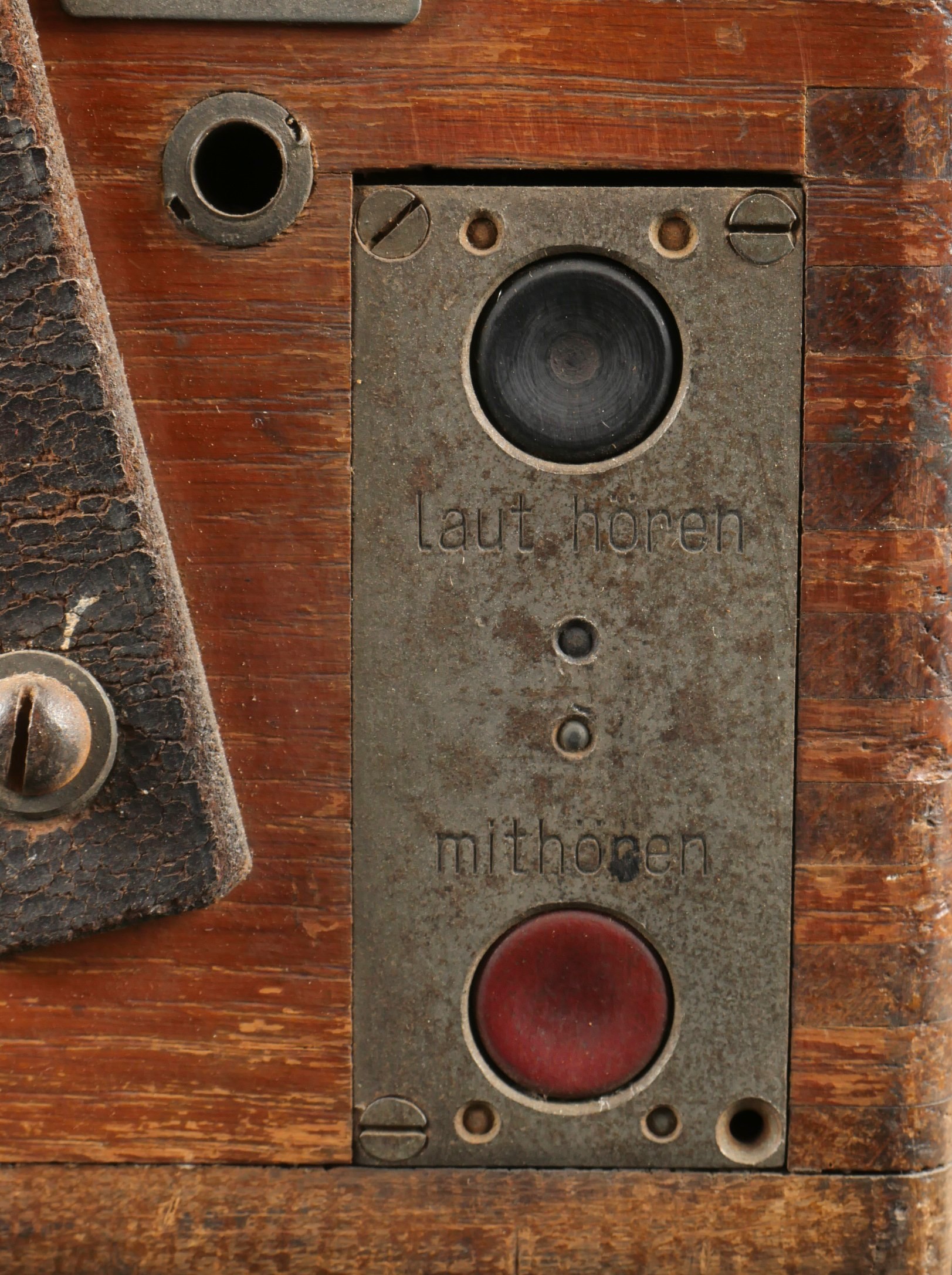 Téléphone de campagne allemand Feldfernsprecher 16 type B. Téléphone de campagne modèle 1916 type B du fabricant Siemens & Halske, dans sa boîte en bois vernis, complet de son combiné, sa manivelle, sa plaque signalétique interne et son cordon de connexion. Les grilles, plaques, manipulateur morse et connecteurs externes sont présents. La sangle de portage a été comme presque toujours coupée. L’ergot de fermeture du couvercle est manquant. Objet présentant une usure et une patine importante, mais facilement améliorable. German Field Telephone Feldfernsprecher 16 Type BModel 1916 Type B field telephone made by Siemens & Halske, housed in its varnished wooden box. Complete with handset, crank, internal identification plate, and connecting cord. Grilles, plates, Morse key, and external connectors all present. Carrying strap, as usual, has been cut. Lid locking lug missing. Shows significant wear and patina but remains easily restorable.