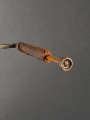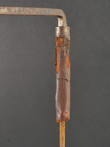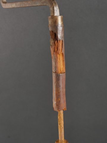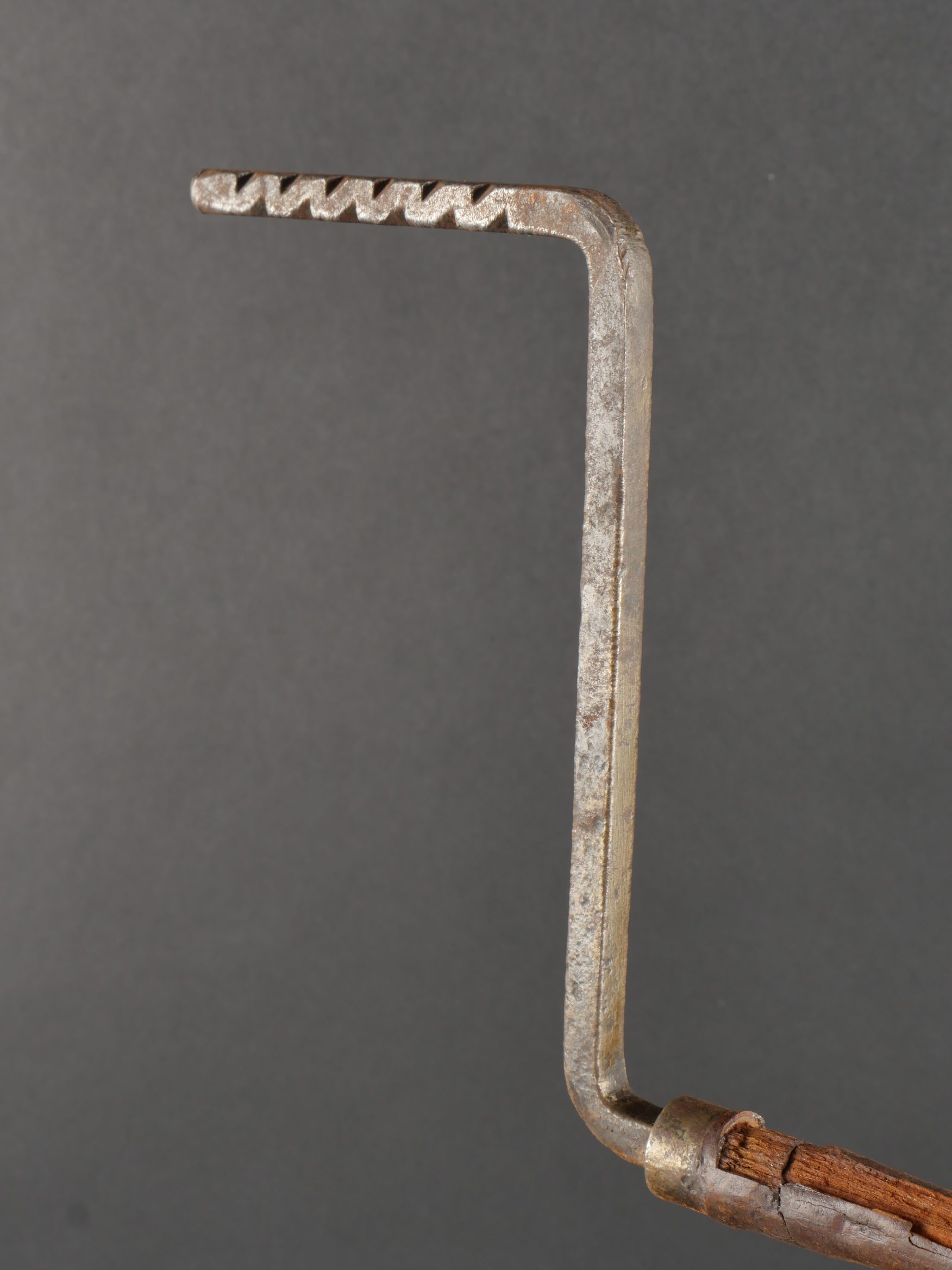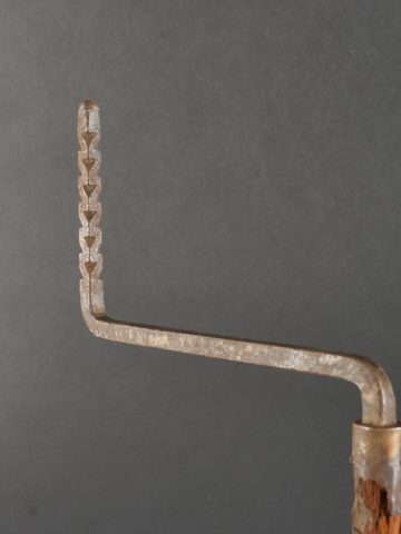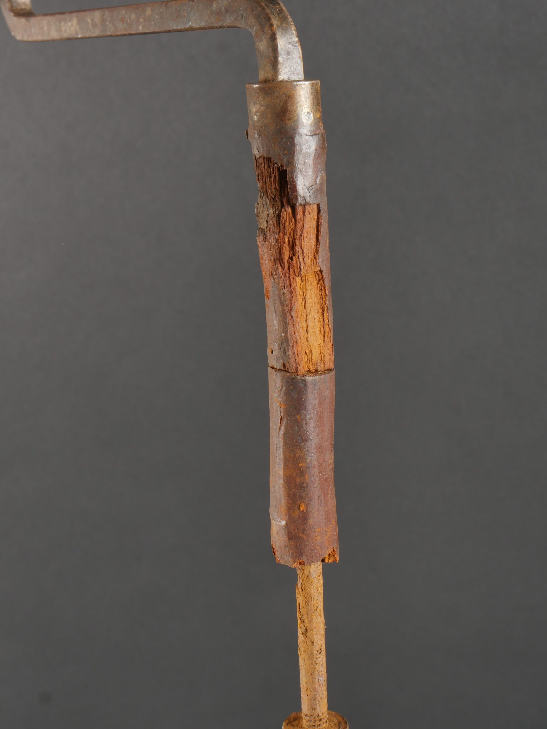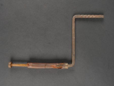 Tige coudée de nettoyage de chambre de mitrailleuse allemande MG08. Parfois appelée manivelle en raison de sa forme, tige coudée en fer avec extrémité crantée pour nettoyage rapide de la chambre de la MG08 et extraction d’un étui dont le culot a été arraché. Marquage d’unité ou de machine, on distingue le chiffre 13. Poignée tubulaire en bois, en mauvais état, manques. Se fixe sur l’affût traineau, souvent manquant et pas facile à trouver. Bent Cleaning Rod for MG08 Machine Gun Chamber Steel cleaning rod for the MG08, sometimes called “crank handle” due to its shape. Bent end with serrated tip for clearing jammed cases. Marked with unit or weapon number “13.” Wooden handle in poor condition with losses. Attaches to the sled mount, often missing and hard to find.