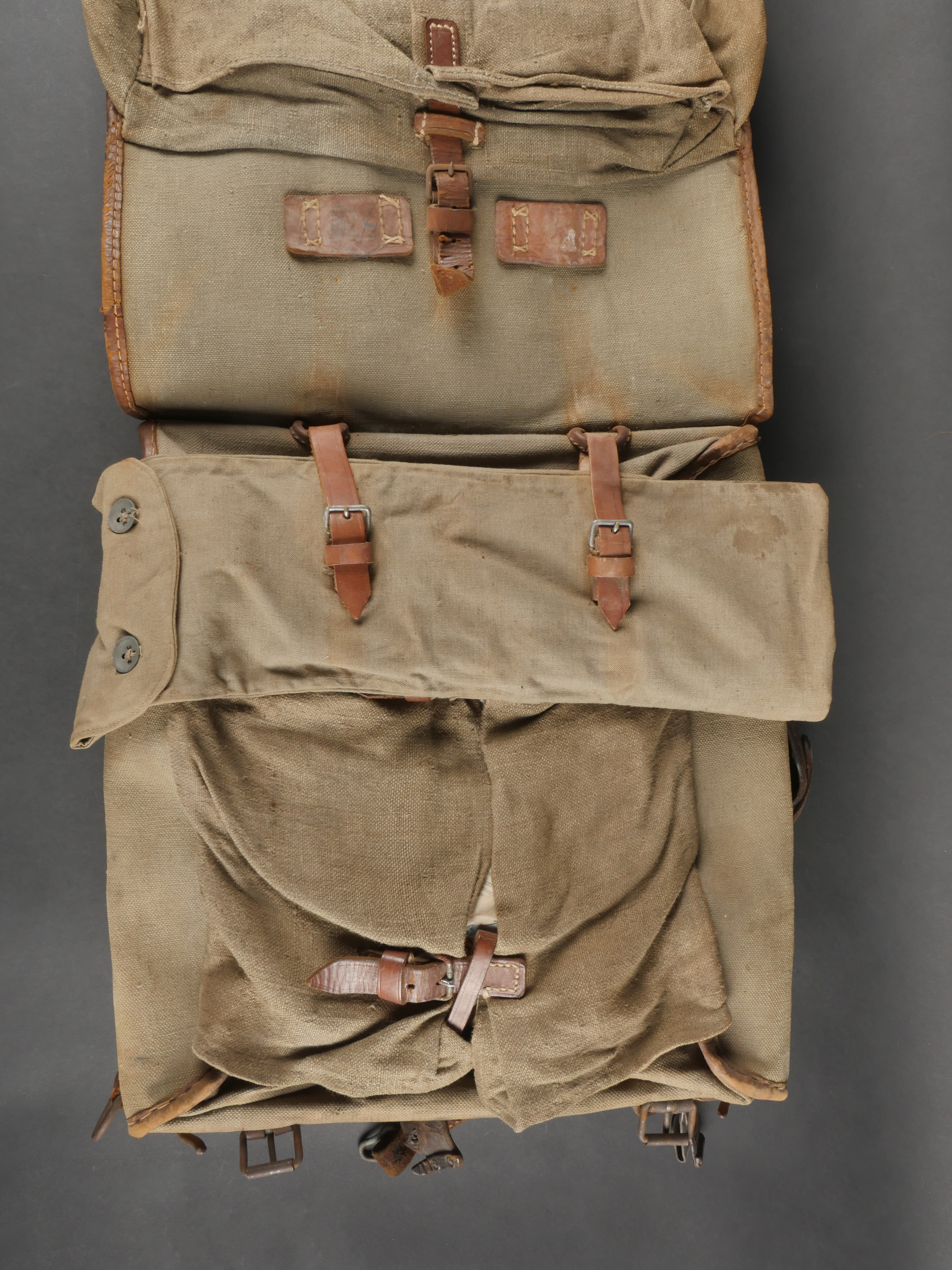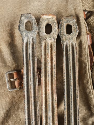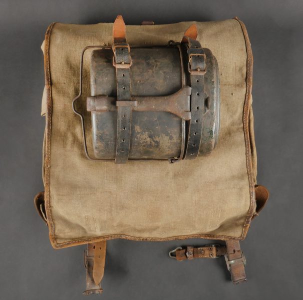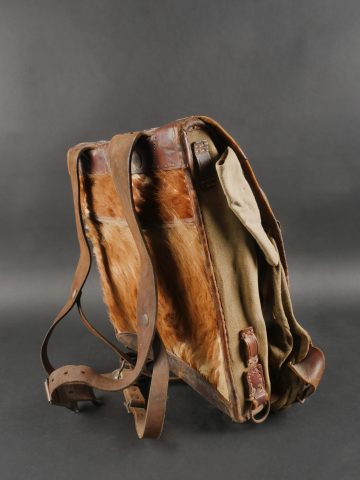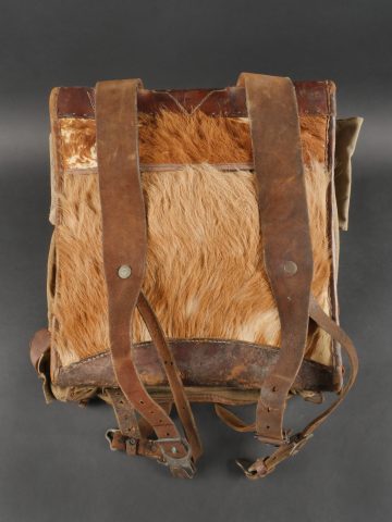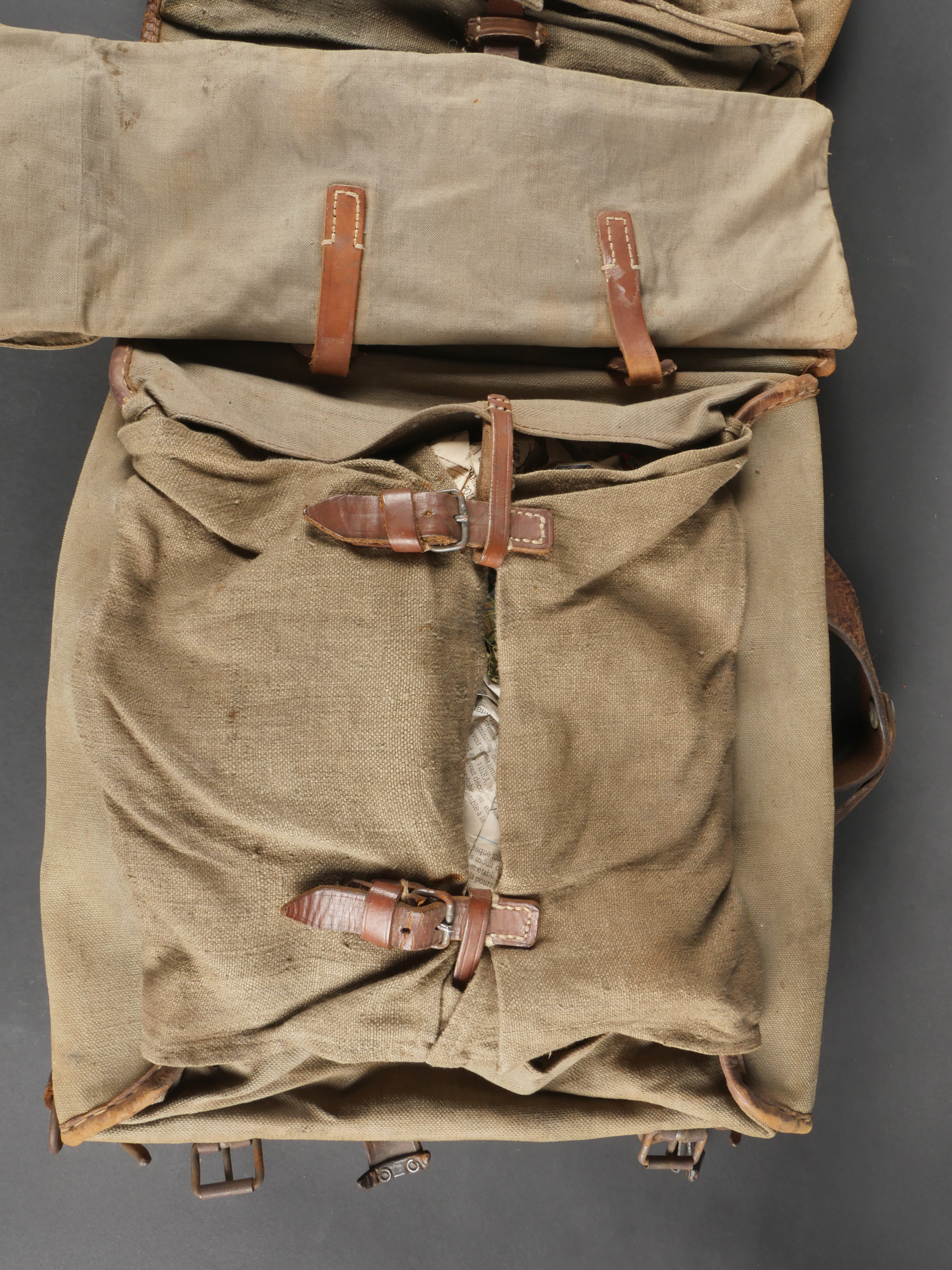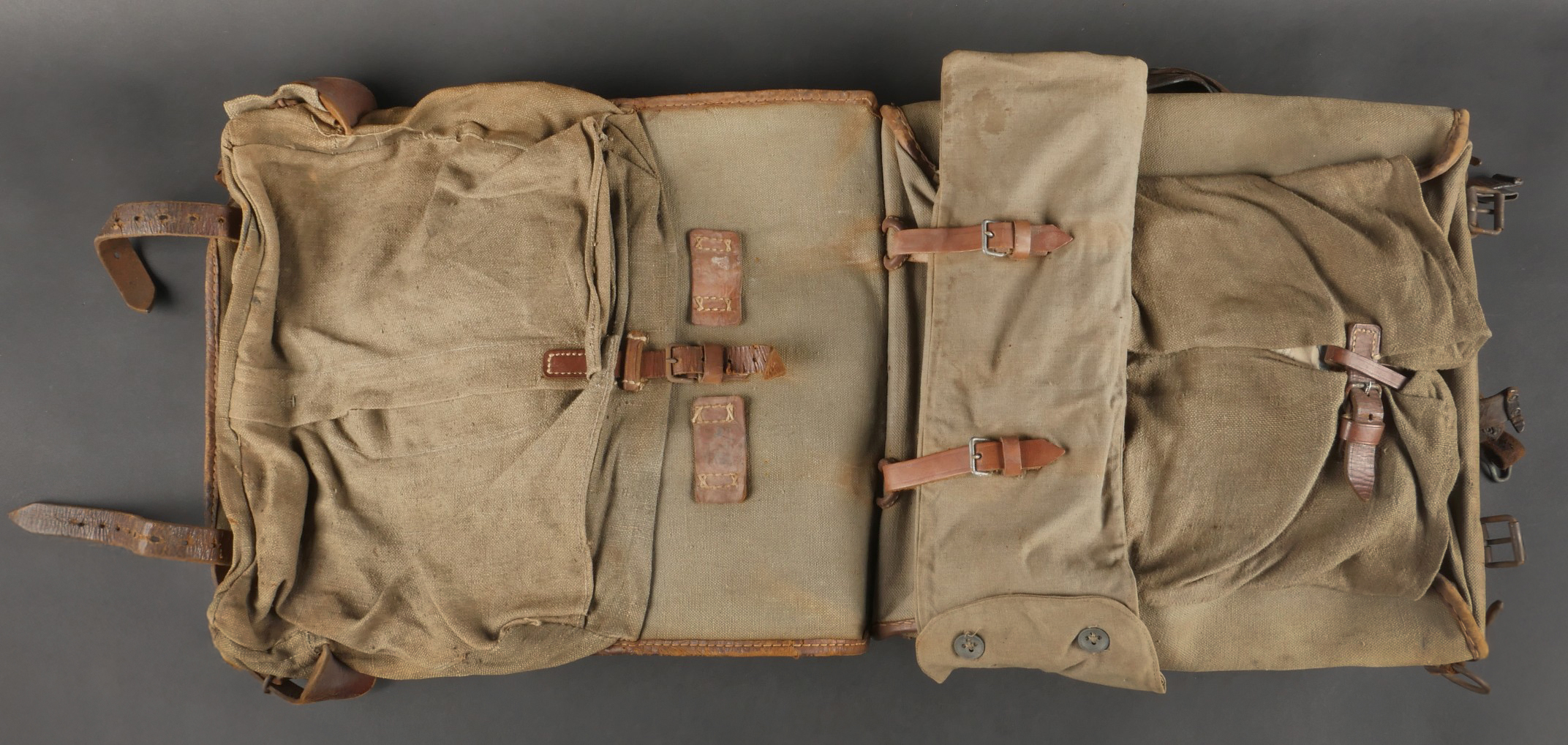 Tornister avec sangles, gamelle et housse de piquets de tente. Sac à dos à poils de vache et rabat en toile feldgrau, marquage fabricant et daté 1917, avec ses bretelles de fabricants différents, l’une régimentée auu IR12 Bavarois. Gamelle émaillée, non marquée, fixée par 2 sangles de paquetage à dégrafage rapide en cuir noir, non marquées. A l’intérieur une housse pour piquets de tentes, réceptionnée au BA XV en 1916, contenant 3 piquets métalliques dont 2 sont datés 1916. Usure d’usage, bon état. Tornister with Straps, Mess Tin, and Tent Peg Case Cowhide backpack with field-grey canvas flap, maker marked and dated 1917, with two mismatched shoulder straps, one regimentally marked to Bavarian IR12. Enameled mess tin unmarked, attached with two quick-release leather straps, unmarked. Inside, a tent peg case stamped BA XV 1916 containing three metal pegs, two dated 1916. Signs of use, good condition.