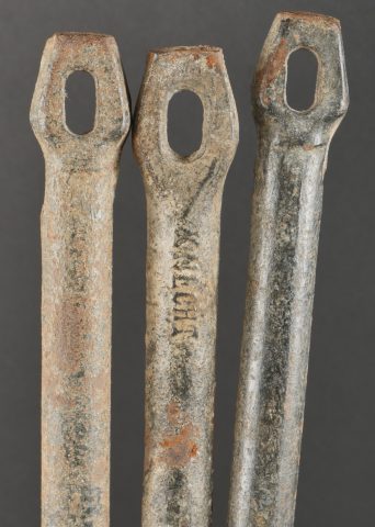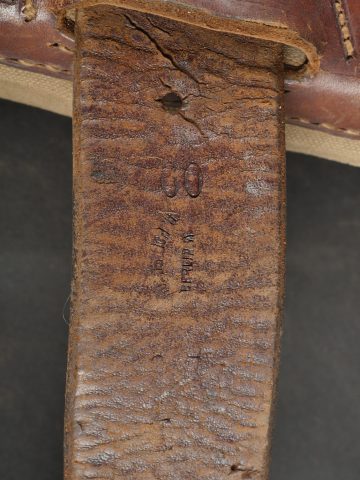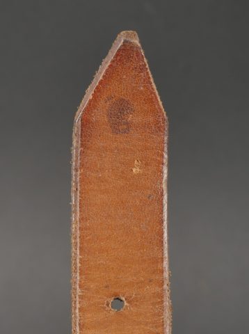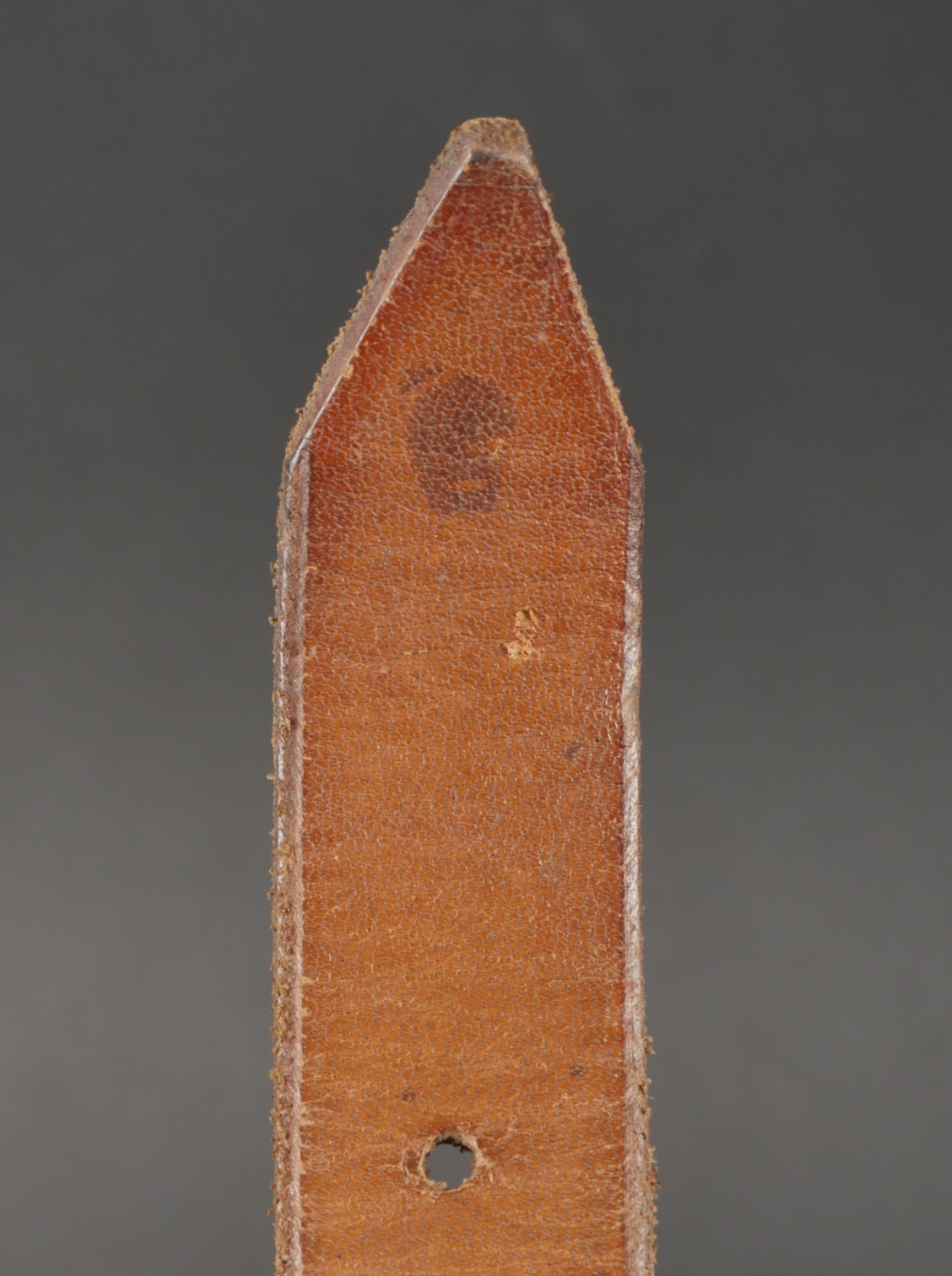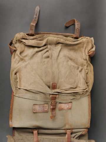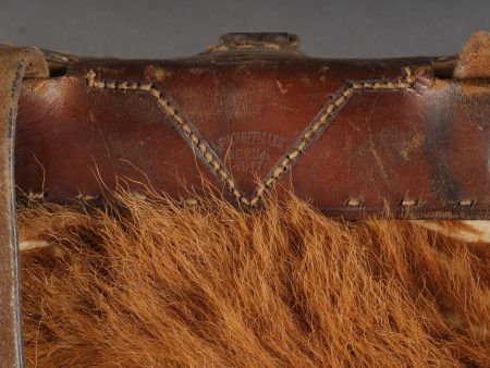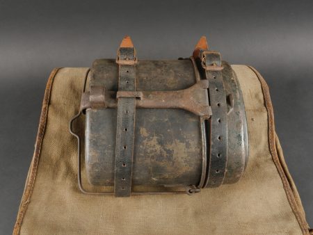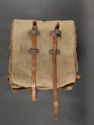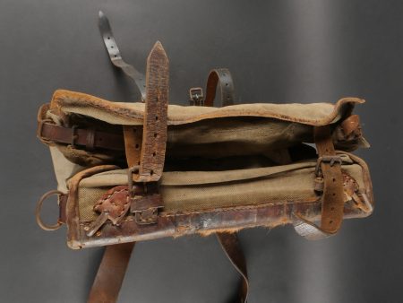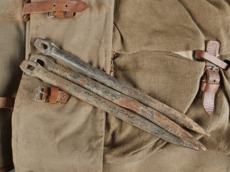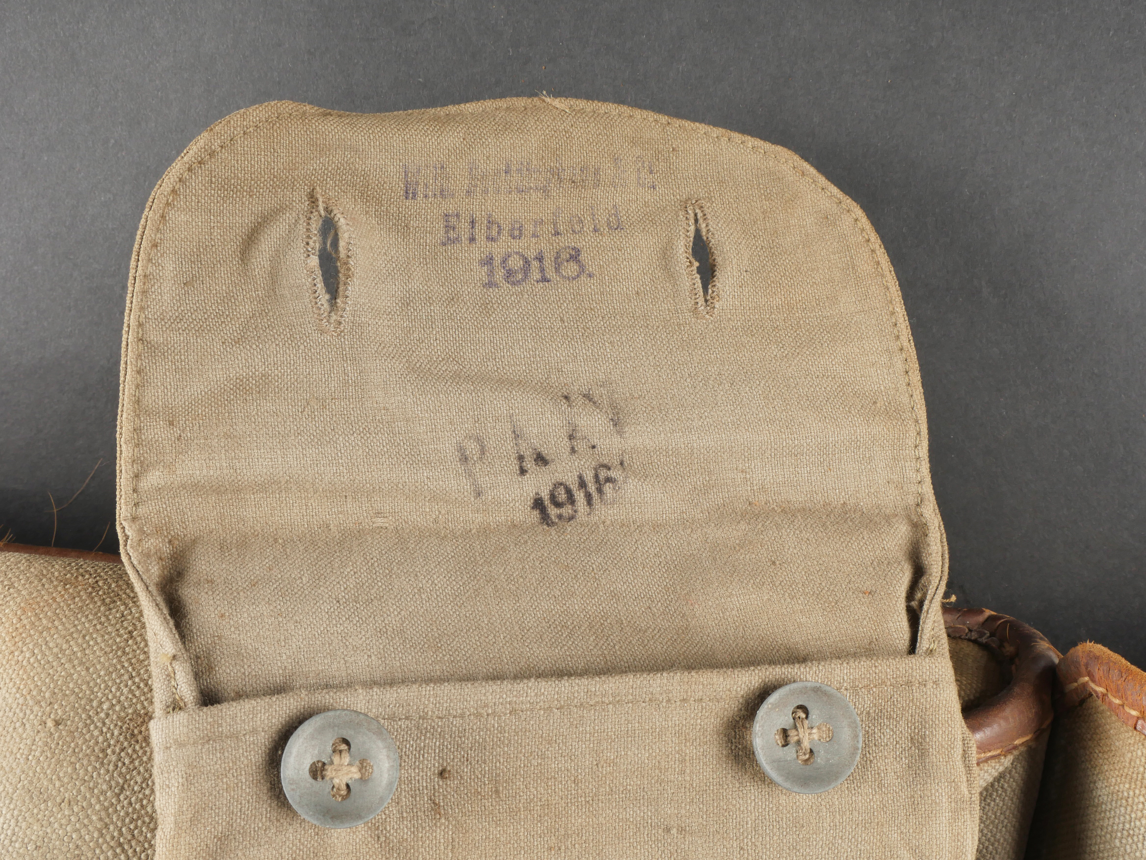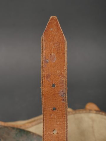 Tornister avec sangles, gamelle et housse de piquets de tente. Sac à dos à poils de vache et rabat en toile feldgrau, marquage fabricant et daté 1917, avec ses bretelles de fabricants différents, l’une régimentée auu IR12 Bavarois. Gamelle émaillée, non marquée, fixée par 2 sangles de paquetage à dégrafage rapide en cuir noir, non marquées. A l’intérieur une housse pour piquets de tentes, réceptionnée au BA XV en 1916, contenant 3 piquets métalliques dont 2 sont datés 1916. Usure d’usage, bon état. Tornister with Straps, Mess Tin, and Tent Peg Case Cowhide backpack with field-grey canvas flap, maker marked and dated 1917, with two mismatched shoulder straps, one regimentally marked to Bavarian IR12. Enameled mess tin unmarked, attached with two quick-release leather straps, unmarked. Inside, a tent peg case stamped BA XV 1916 containing three metal pegs, two dated 1916. Signs of use, good condition.