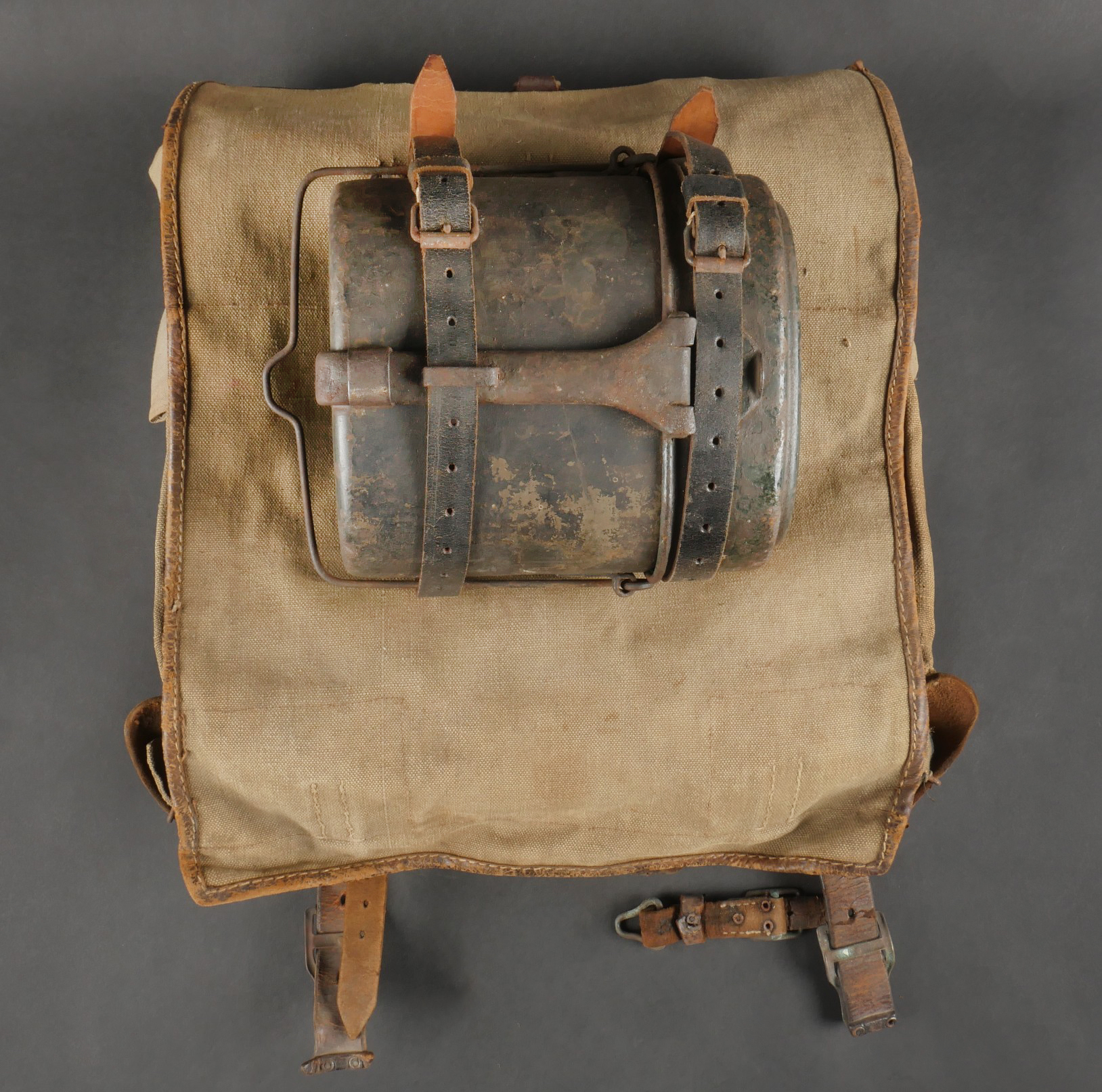 Détails de la vente >Tornister avec sangles, gamelle et housse de piquets de tente. Sac à dos à poils de vache et rabat en toile feldgrau, marquage fabricant et daté 1917, avec ses bretelles de fabricants... en savoir plus