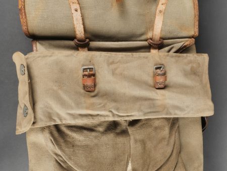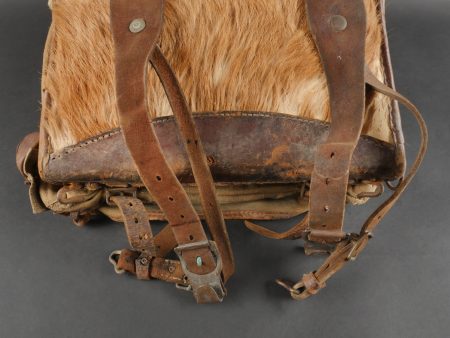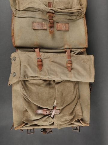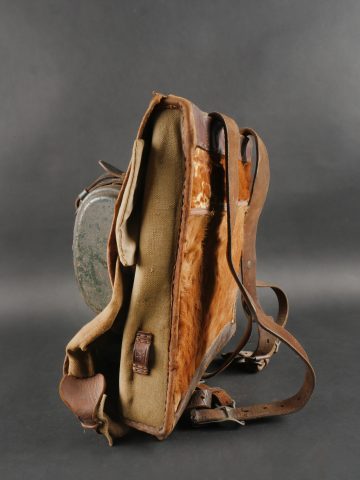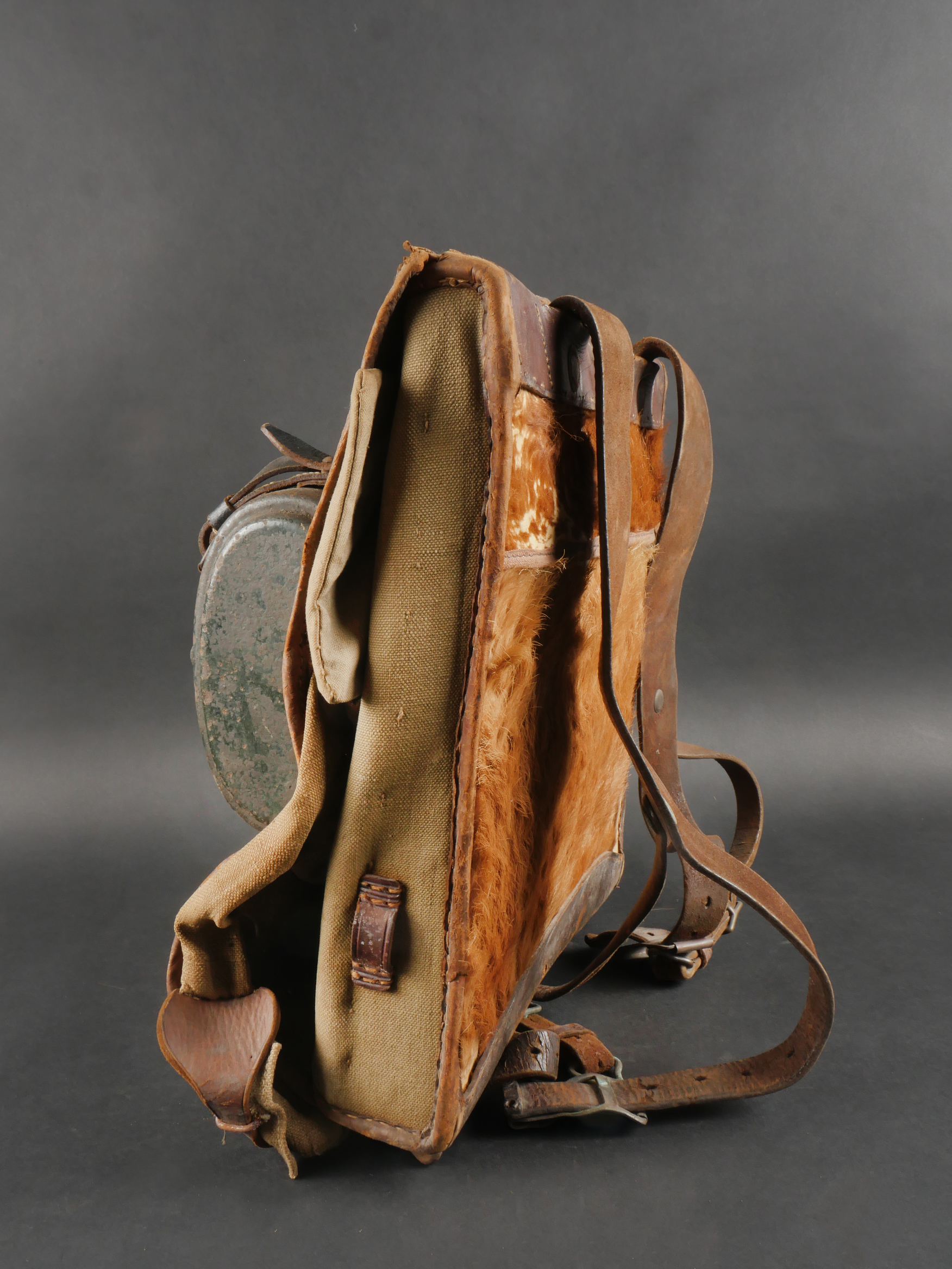 Tornister avec sangles, gamelle et housse de piquets de tente. Sac à dos à poils de vache et rabat en toile feldgrau, marquage fabricant et daté 1917, avec ses bretelles de fabricants... en savoir plus
