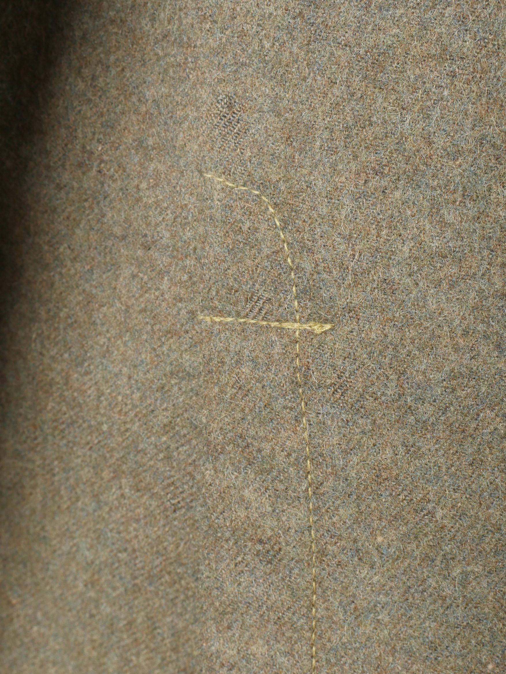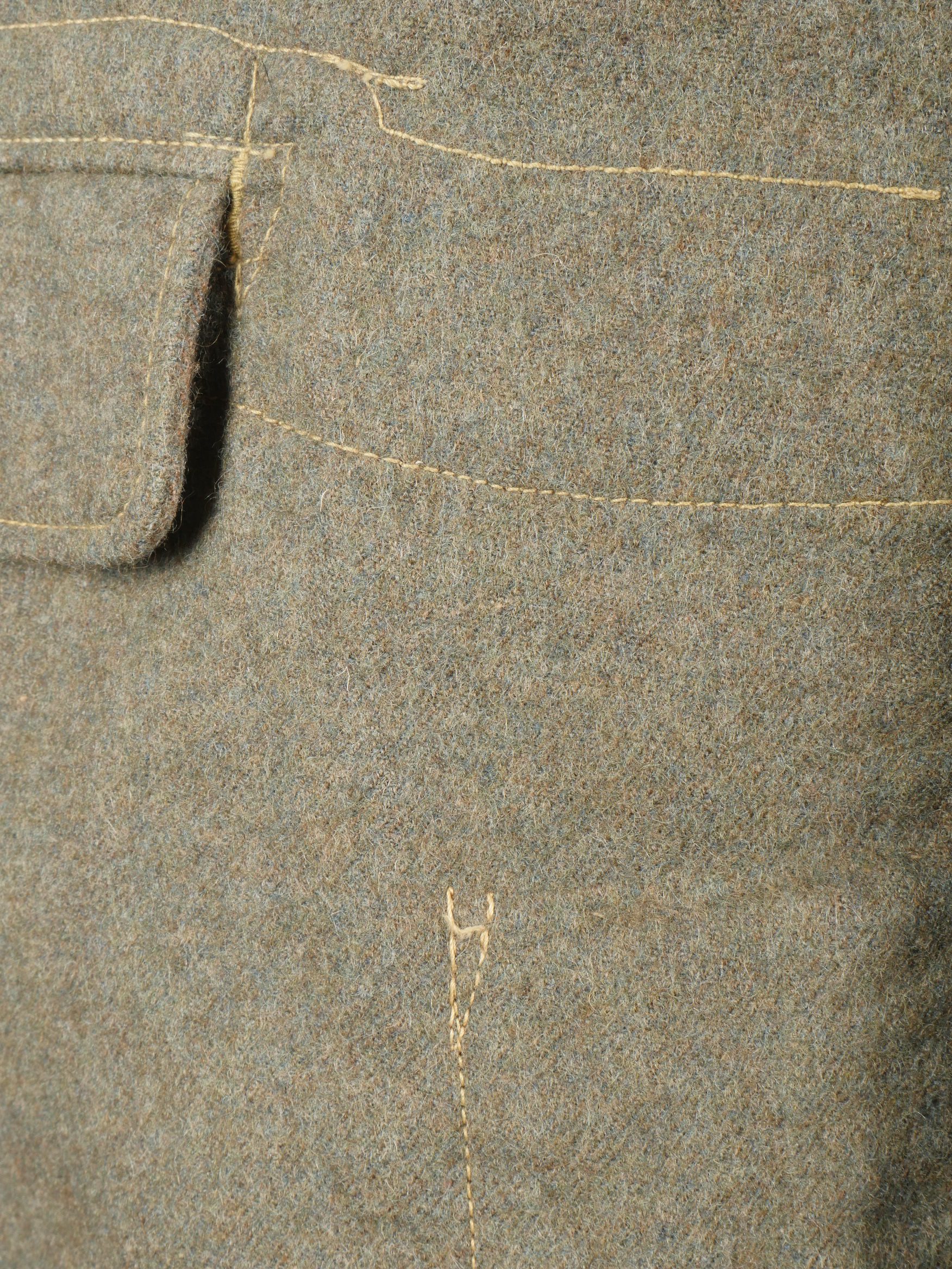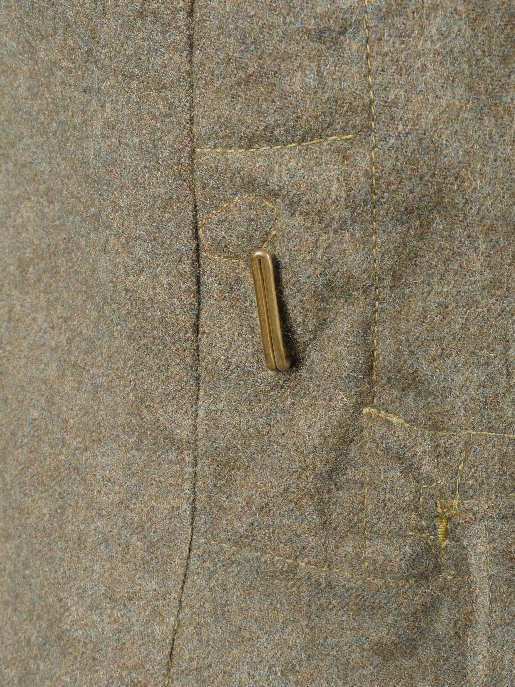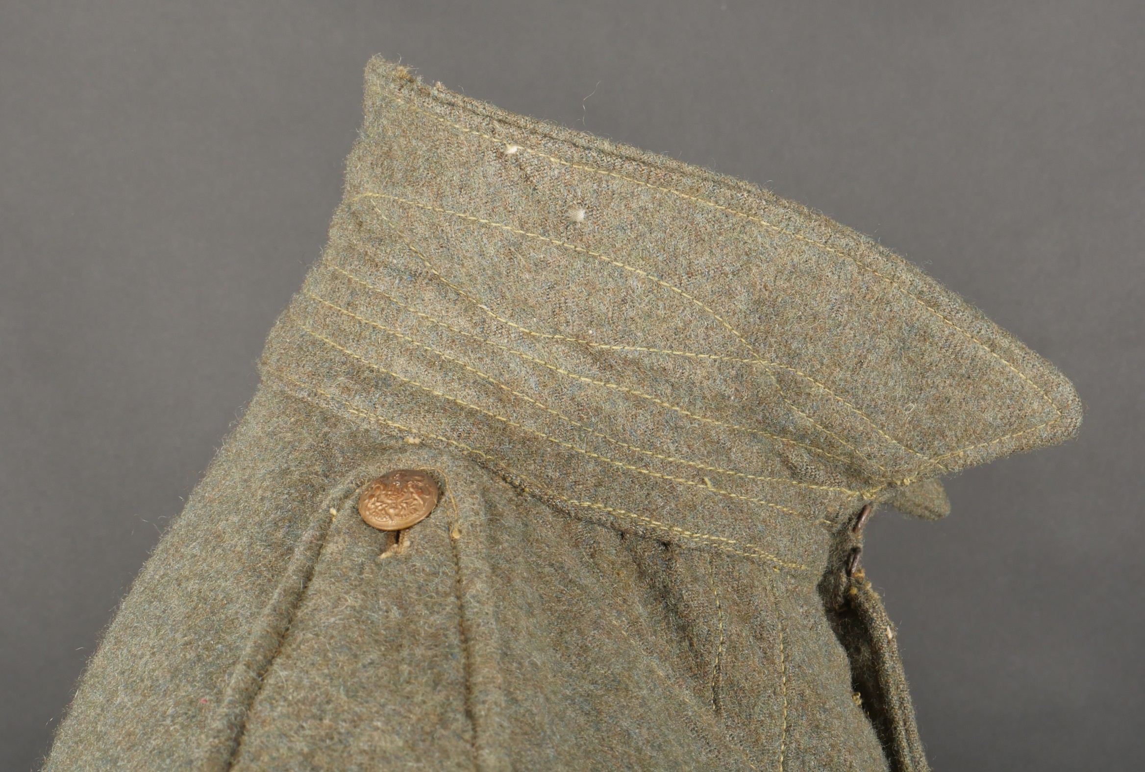 Tunique anglaise troupe Service Dress modèle 1902. Très belle et curieuse tunique anglaise troupe en serge tirant sur la teinte verte. Jamais réceptionnée, jamais portée. En tout point conforme, fermant par 5 boutons du type général, rifle patches, double couture sous le col, poche à pansement jamais décousue. Quelques trous de mites minimes, 4 réparations peu visibles. Veste très fraîche. Etiquette papier du fabricant C. & J. Webb & Co Ltd. Barrée d’un trait à l’encre rouge. Avec un tampon à l’encre 18 pouvant être une date. British Service Dress Tunic Model 1902Excellent example of a British other ranks service dress tunic in greenish serge. Unissued and unworn, with five general service buttons, rifle patches, double collar stitching, and undisturbed field dressing pocket. Minor moth holes and four small repairs. Fresh condition with paper label “C. & J. Webb & Co Ltd” crossed in red ink, and faint ink stamp “18,” possibly a date.