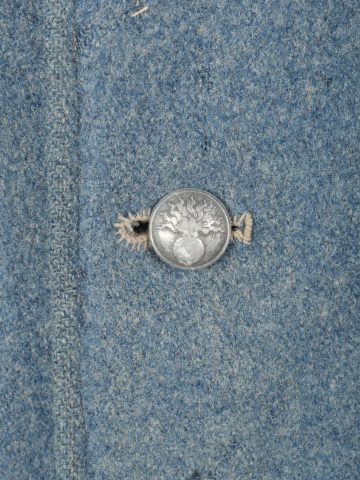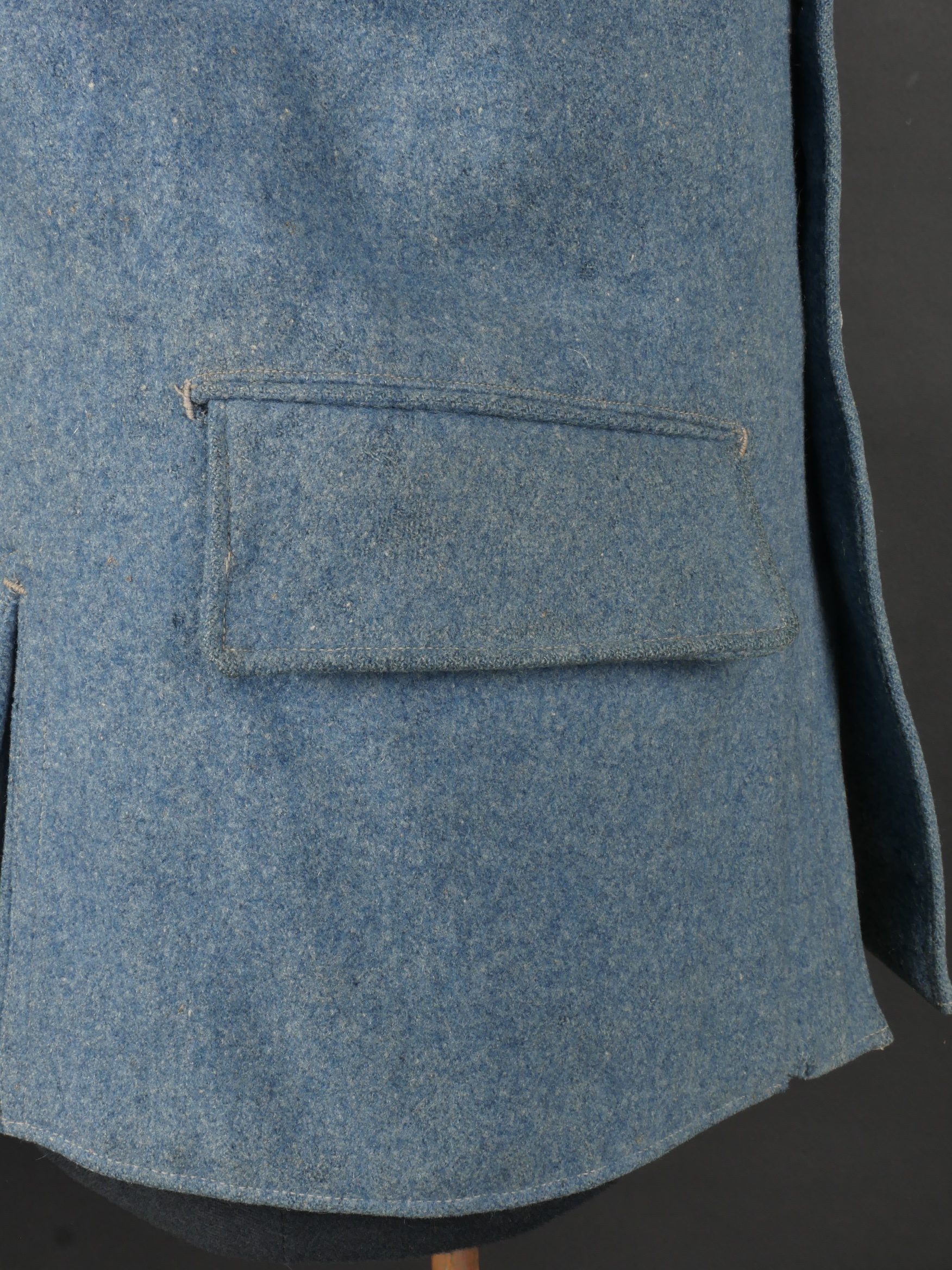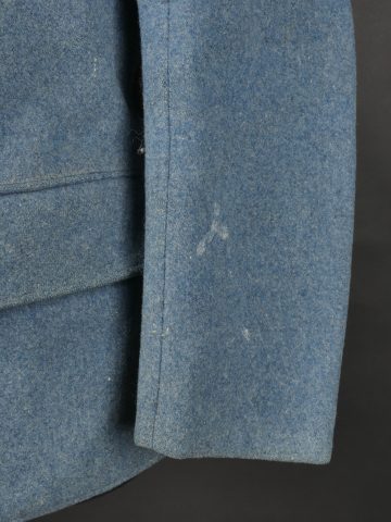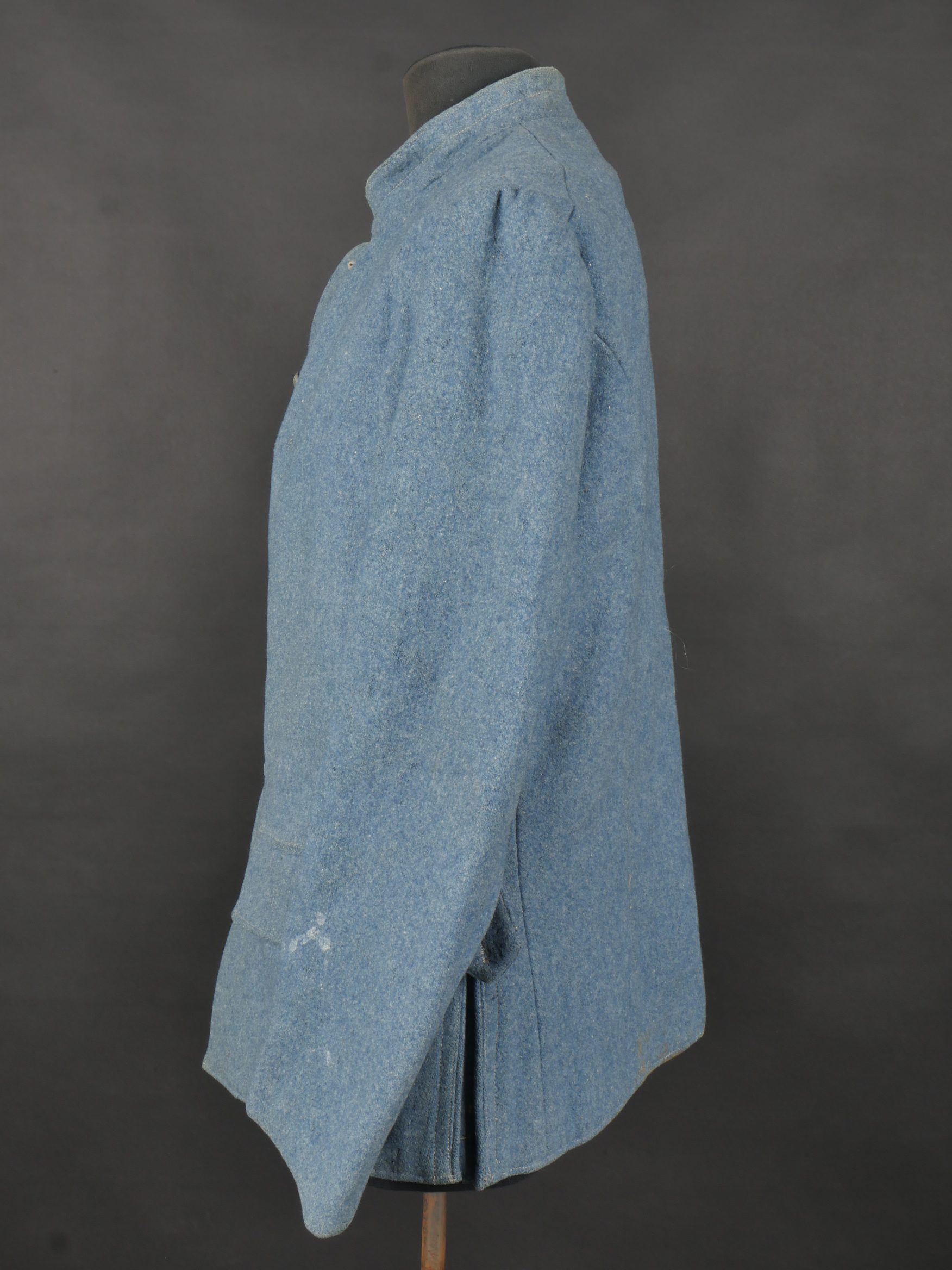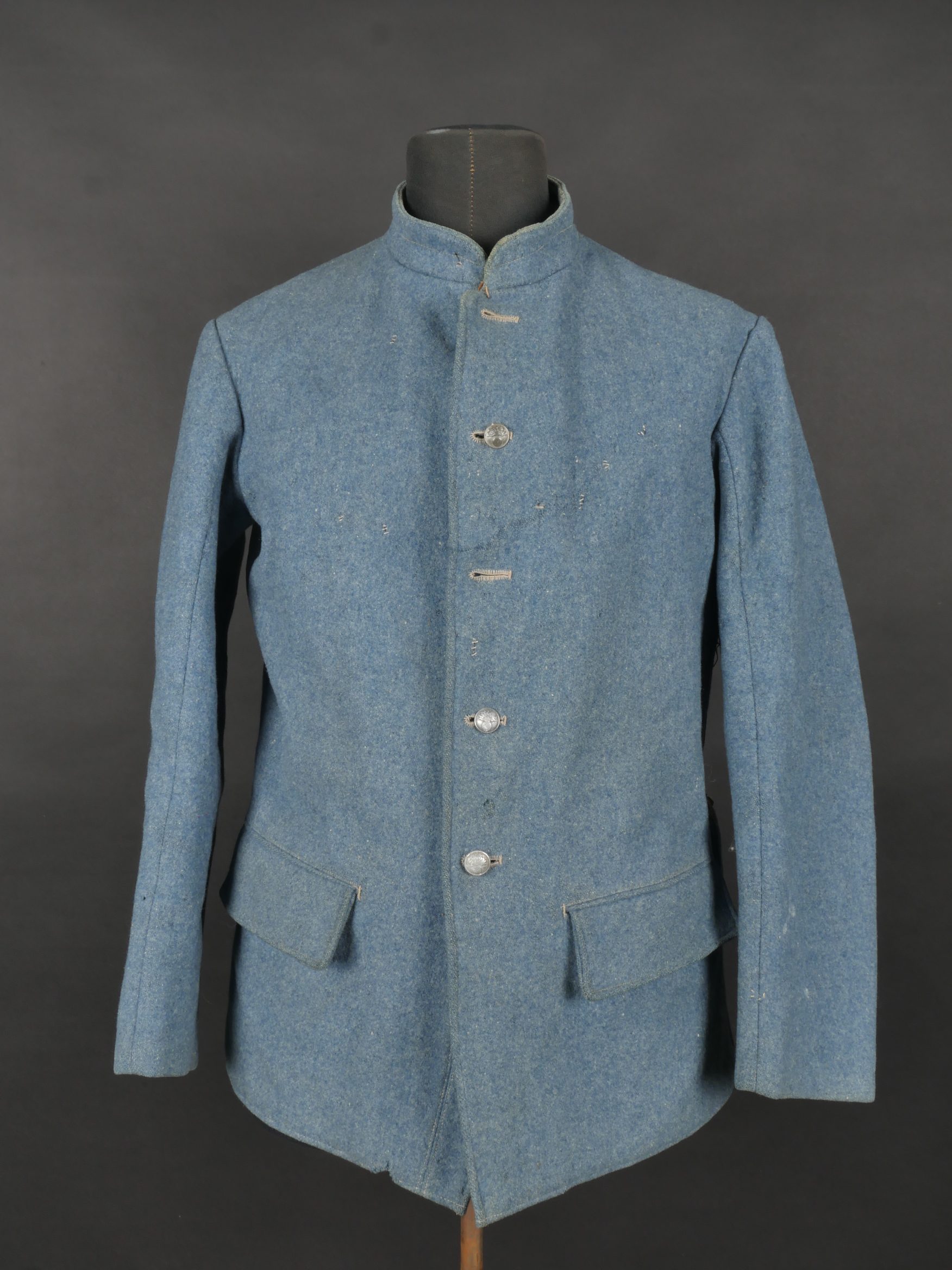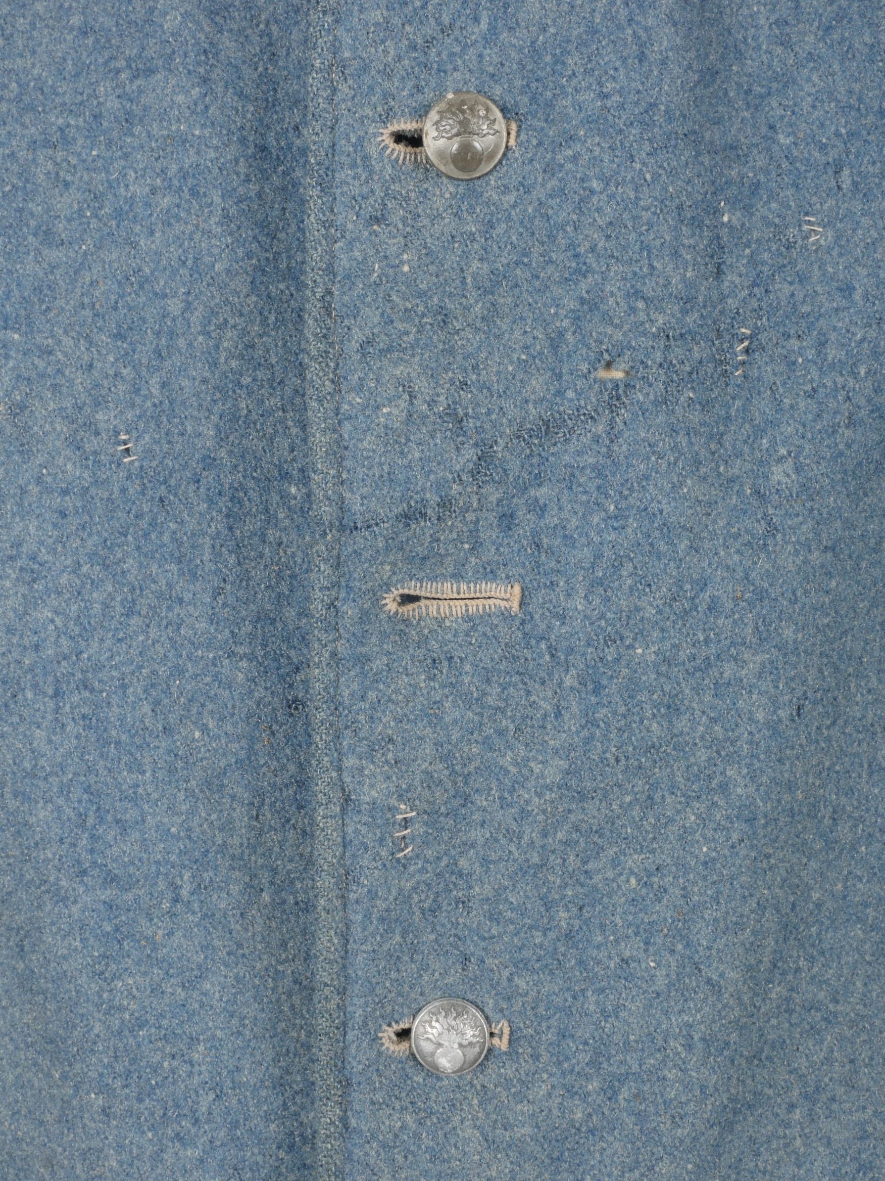 Vareuse française modèle 1914 bleu horizon. Vareuse toutes armes M1914 en drap bleu horizon, sur les 5 boutons de fermeture, 3 sont présents, du petit modèle infanterie. Patte de ceinturon présente, sans bouton. Les boutons de fermeture des plis d’aisance sont absents. Doublure coton écrue avec marquages dont tampon ovale de réception daté 1918. Relativement fraiche malgré de nombreuses léchures de mites, quelques trous, accrocs et réparations. French Model 1914 Horizon-Blue Tunic Standard M1914 all-arms tunic in horizon-blue wool, with five front buttons (three remaining, small infantry type). Belt hook loops present, no button. Back pleat closure buttons missing. Unbleached cotton lining with stamps including oval acceptance mark dated 1918. Fairly fresh despite numerous moth grazes, small holes, snags, and repairs.