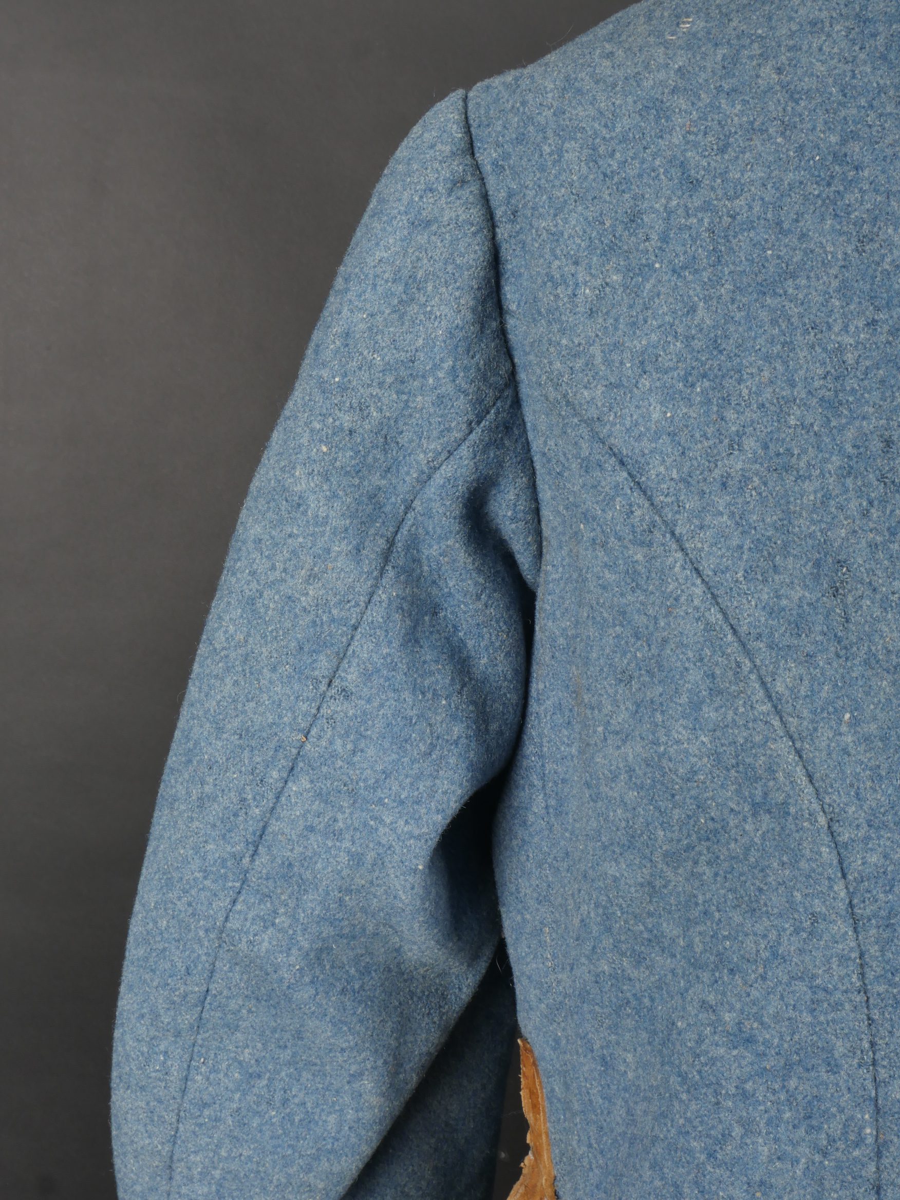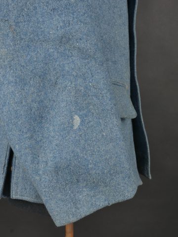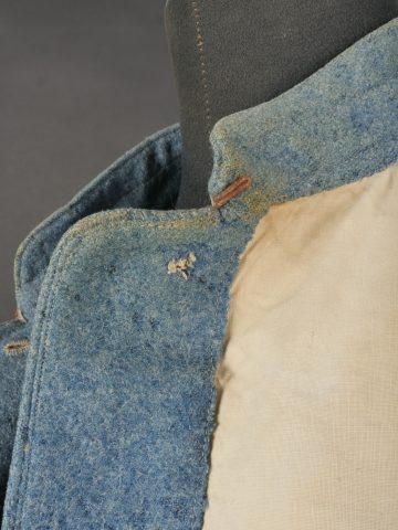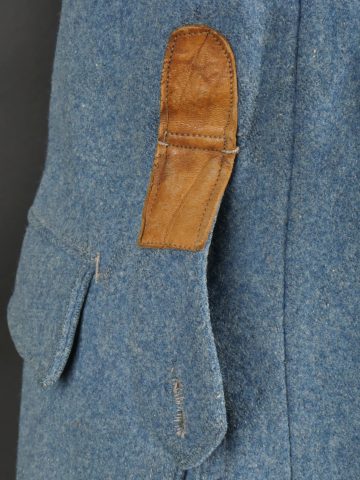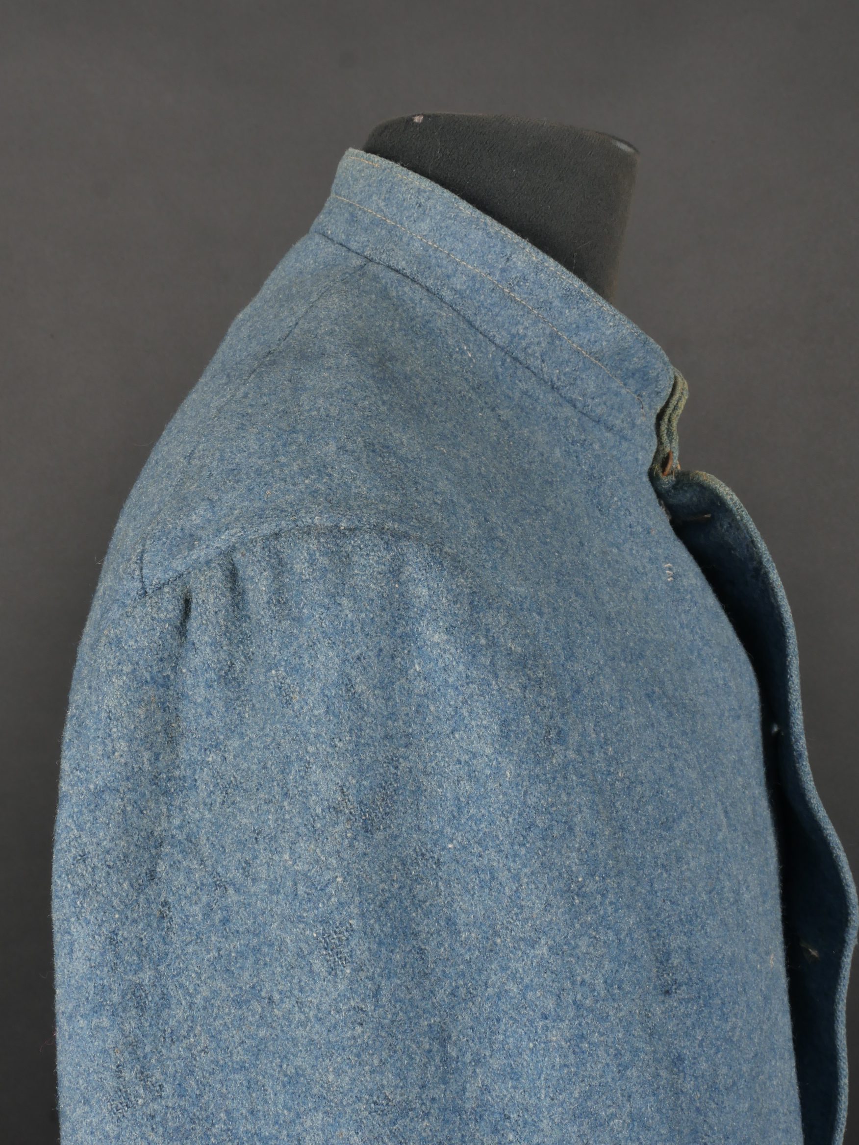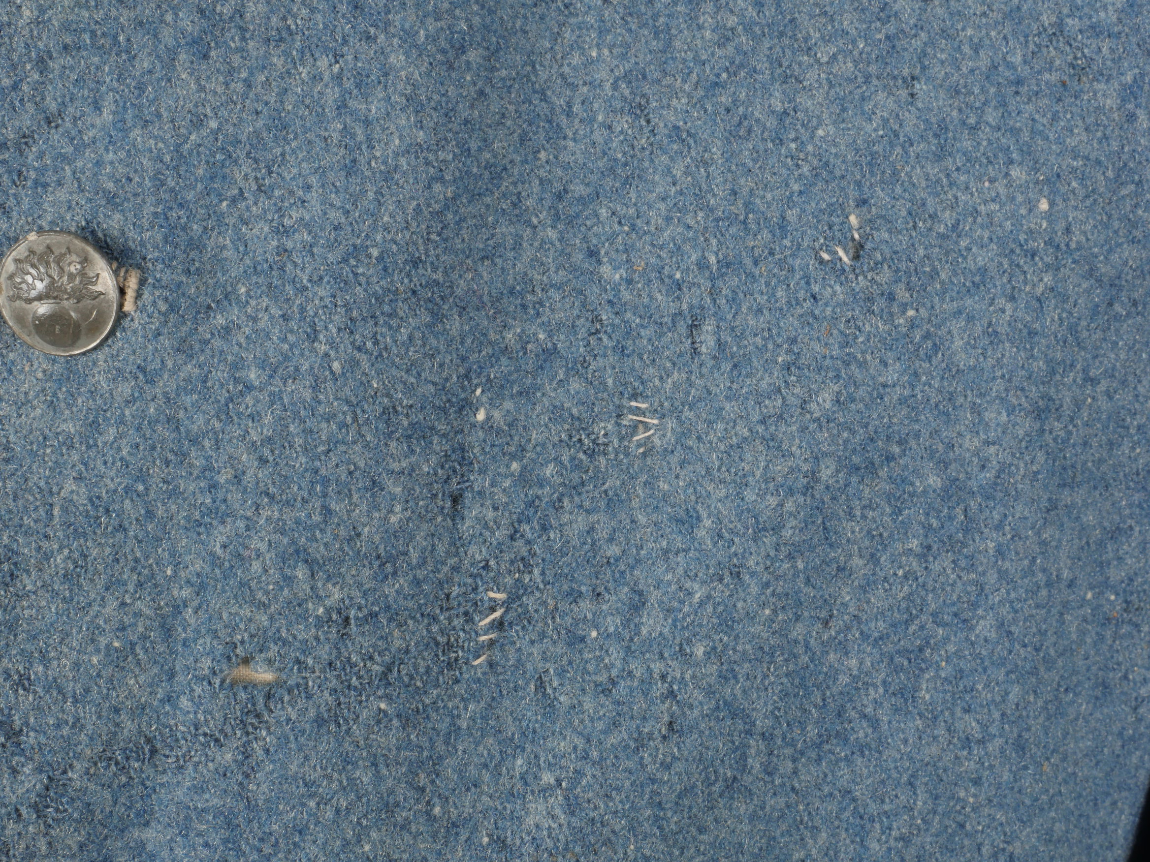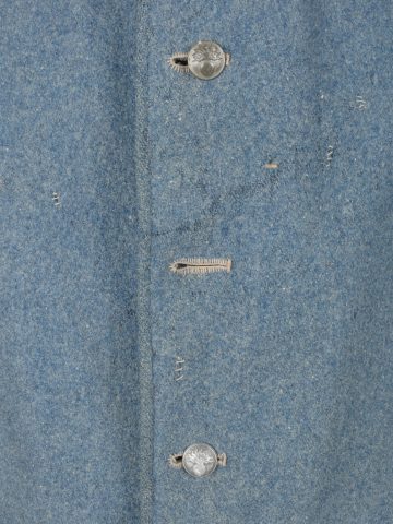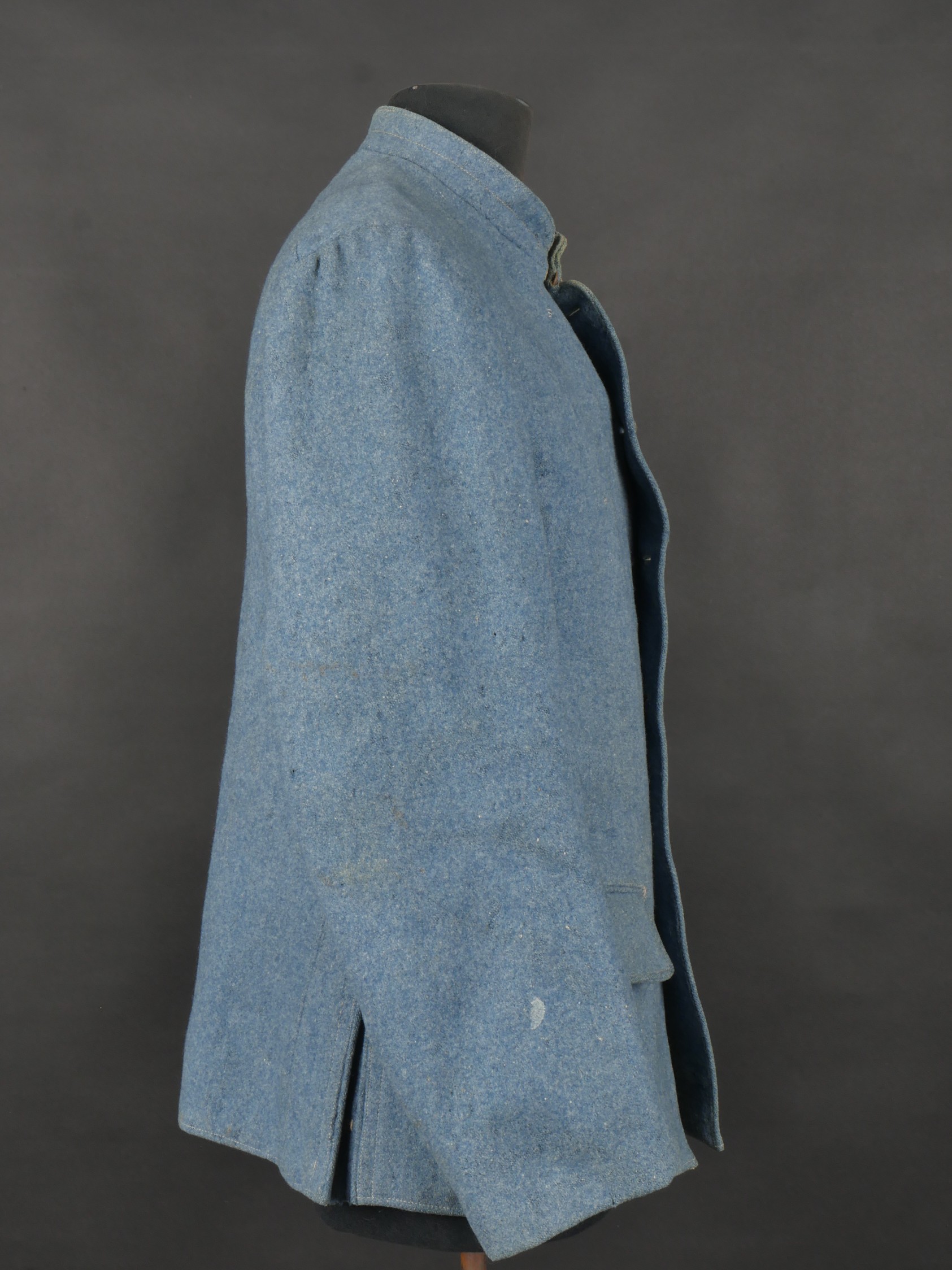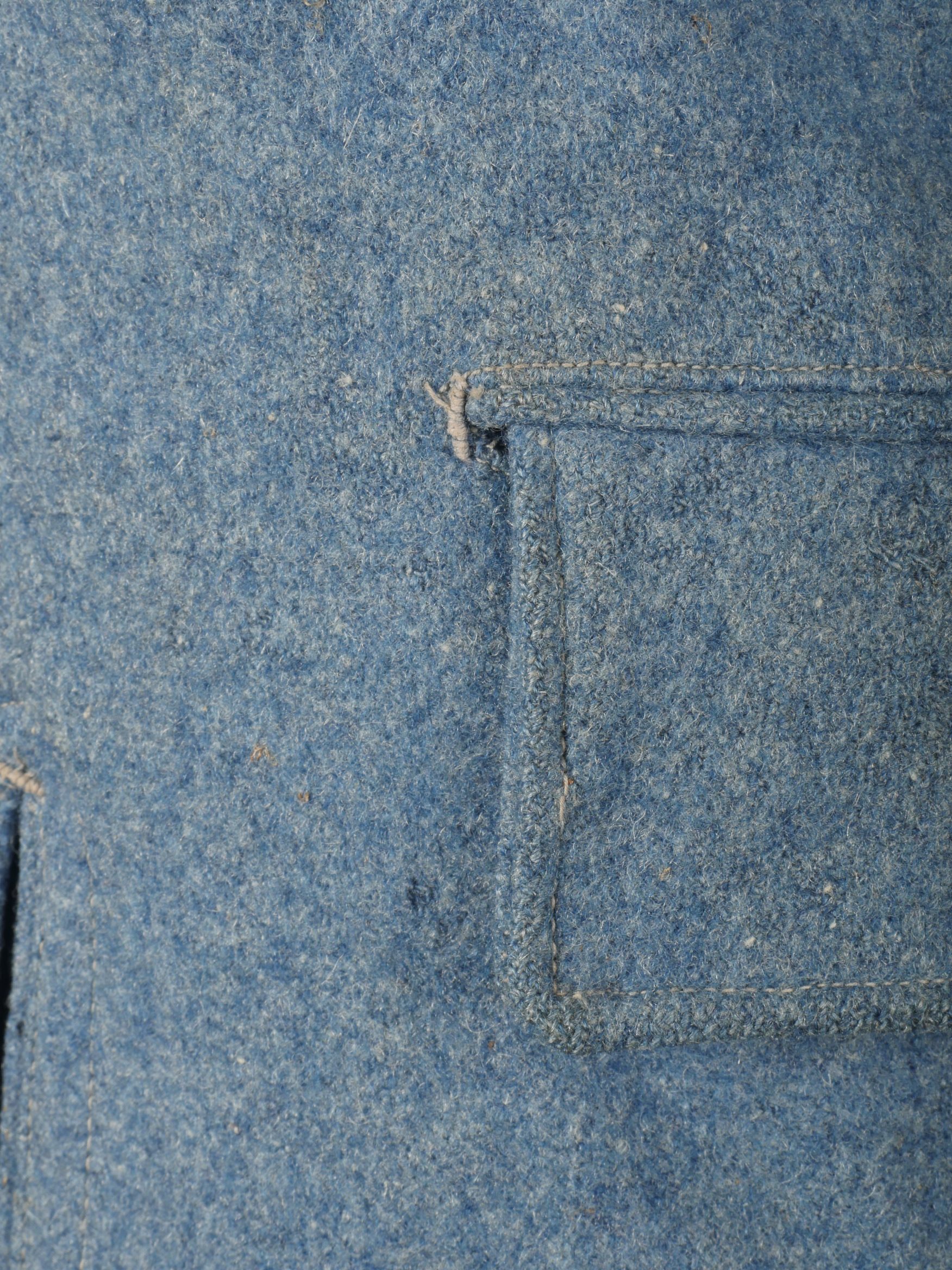 Vareuse française modèle 1914 bleu horizon. Vareuse toutes armes M1914 en drap bleu horizon, sur les 5 boutons de fermeture, 3 sont présents, du petit modèle infanterie. Patte de ceinturon présente, sans bouton. Les boutons de fermeture des plis d’aisance sont absents. Doublure coton écrue avec marquages dont tampon ovale de réception daté 1918. Relativement fraiche malgré de nombreuses léchures de mites, quelques trous, accrocs et réparations. French Model 1914 Horizon-Blue Tunic Standard M1914 all-arms tunic in horizon-blue wool, with five front buttons (three remaining, small infantry type). Belt hook loops present, no button. Back pleat closure buttons missing. Unbleached cotton lining with stamps including oval acceptance mark dated 1918. Fairly fresh despite numerous moth grazes, small holes, snags, and repairs.