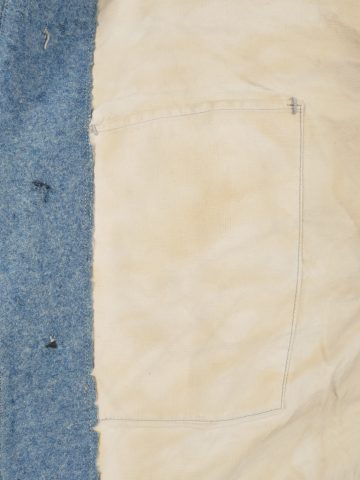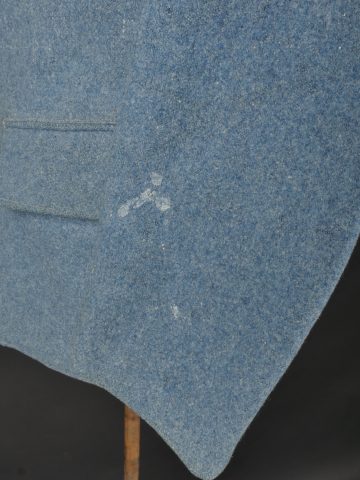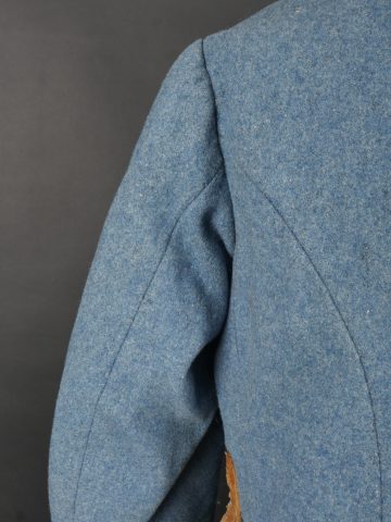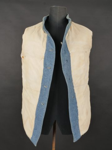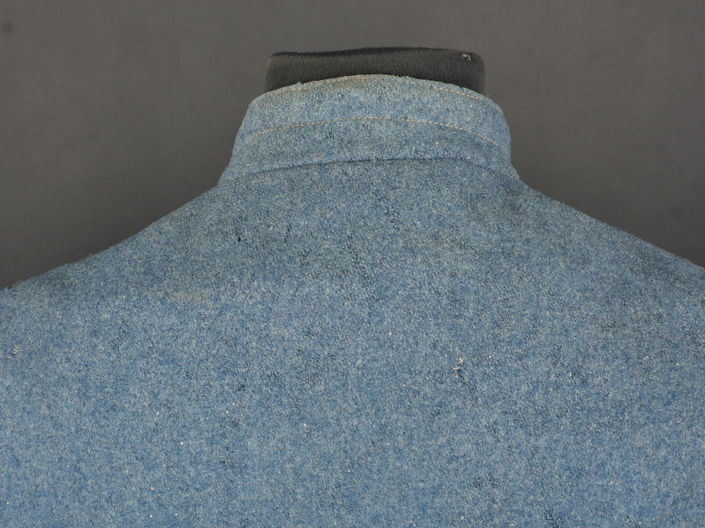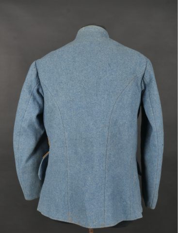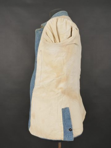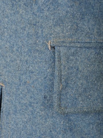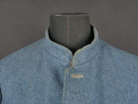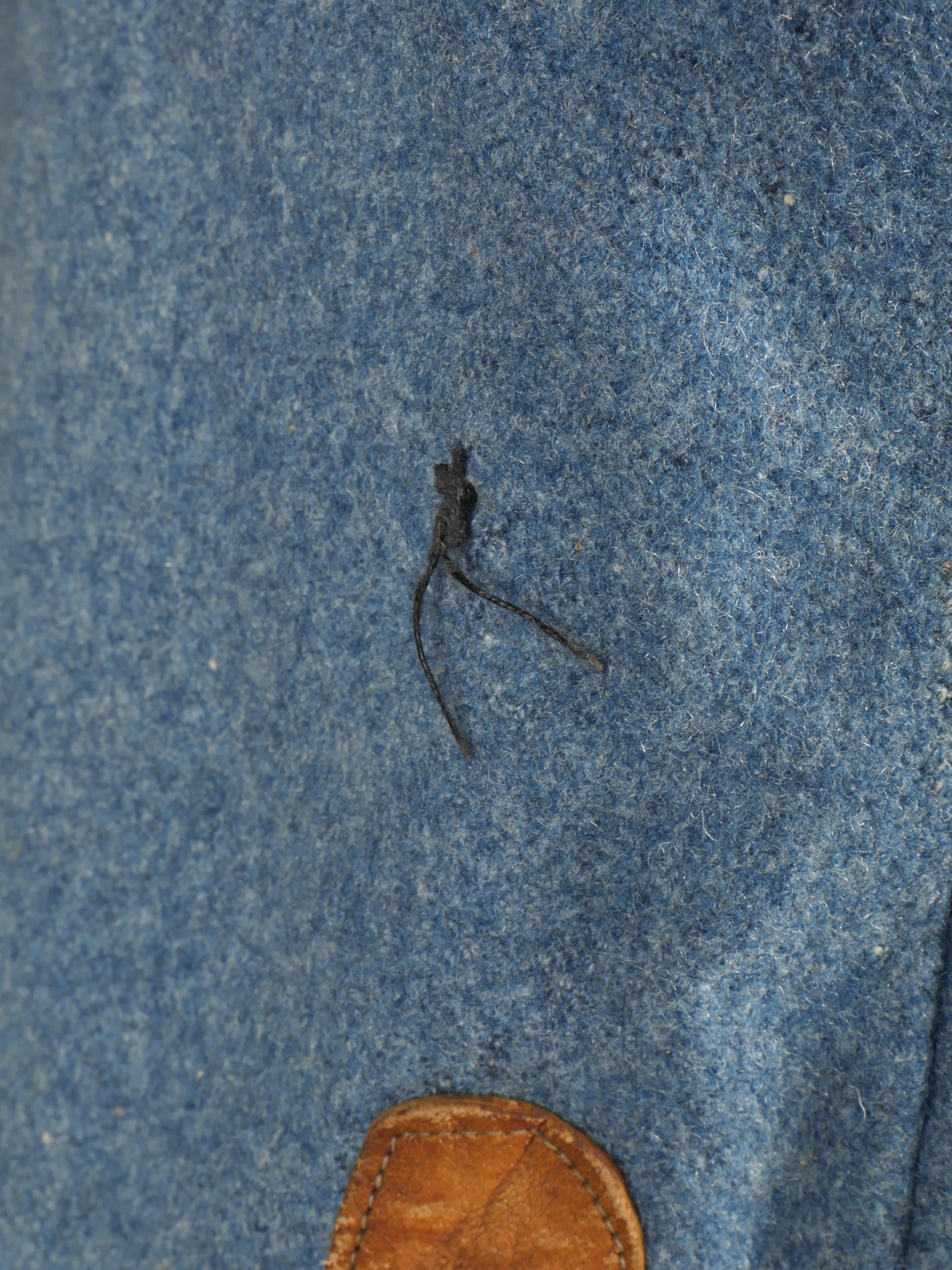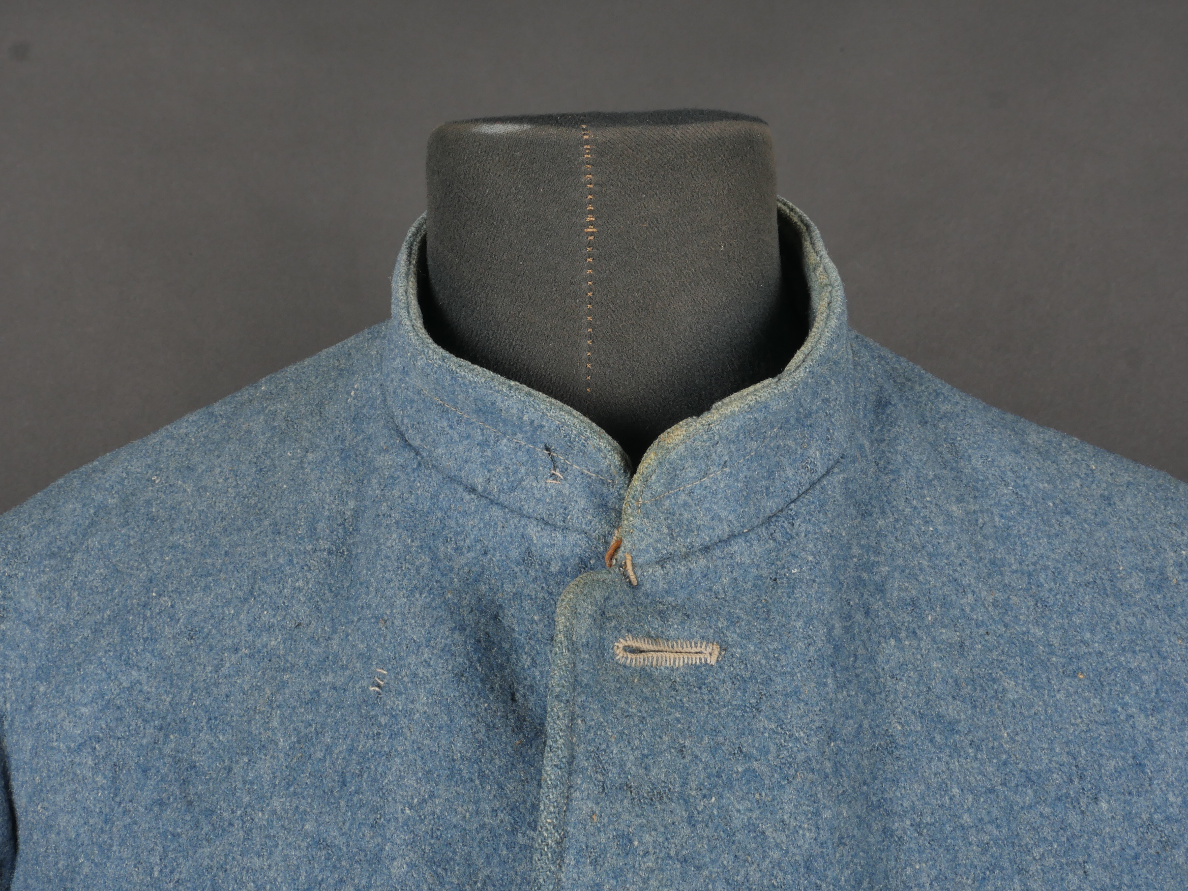 Vareuse française modèle 1914 bleu horizon. Vareuse toutes armes M1914 en drap bleu horizon, sur les 5 boutons de fermeture, 3 sont présents, du petit modèle infanterie. Patte de ceinturon présente, sans bouton. Les boutons de fermeture des plis d’aisance sont absents. Doublure coton écrue avec marquages dont tampon ovale de réception daté 1918. Relativement fraiche malgré de nombreuses léchures de mites, quelques trous, accrocs et réparations. French Model 1914 Horizon-Blue Tunic Standard M1914 all-arms tunic in horizon-blue wool, with five front buttons (three remaining, small infantry type). Belt hook loops present, no button. Back pleat closure buttons missing. Unbleached cotton lining with stamps including oval acceptance mark dated 1918. Fairly fresh despite numerous moth grazes, small holes, snags, and repairs.