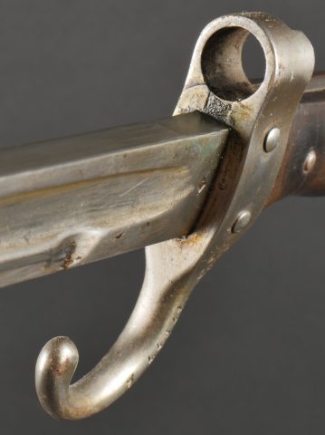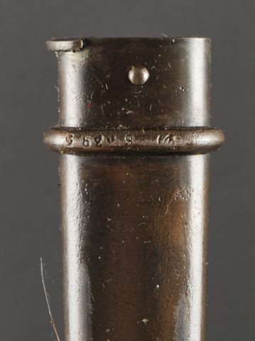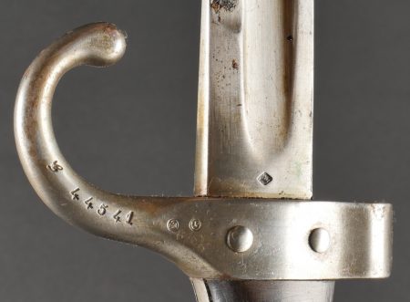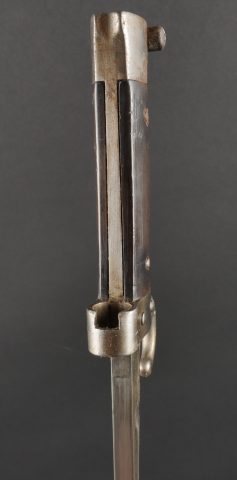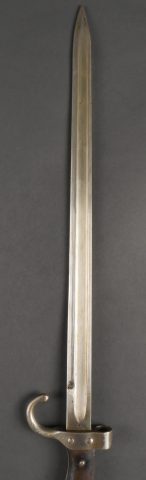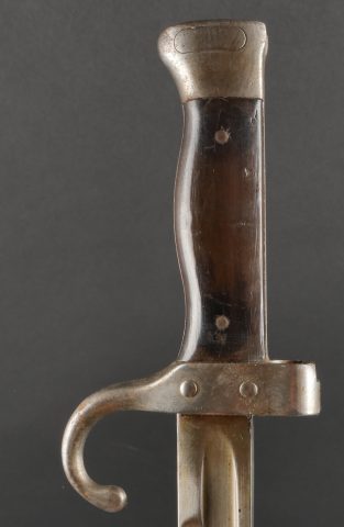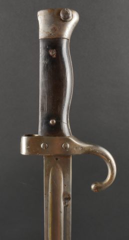 Baïonnette Berthier 1892. Poignée du premier type en corne, quillon long, lame dans sa longueur d’origine, bouton poussoir d’origine. Numéro de la baïonnette 44541, fourreau monté... en savoir plus
