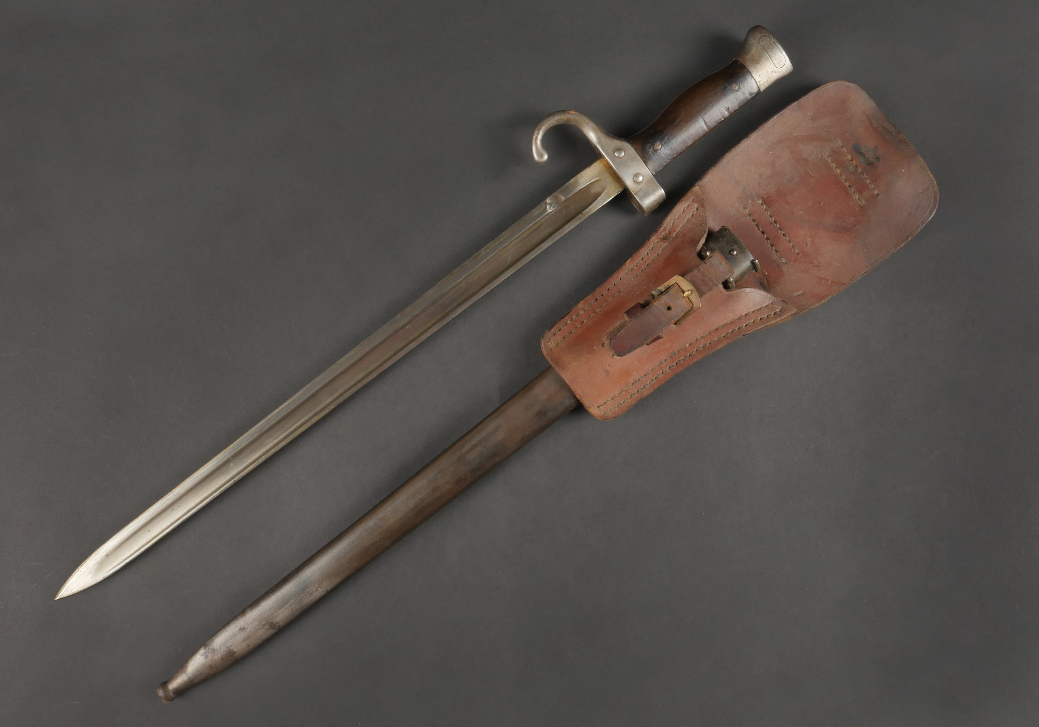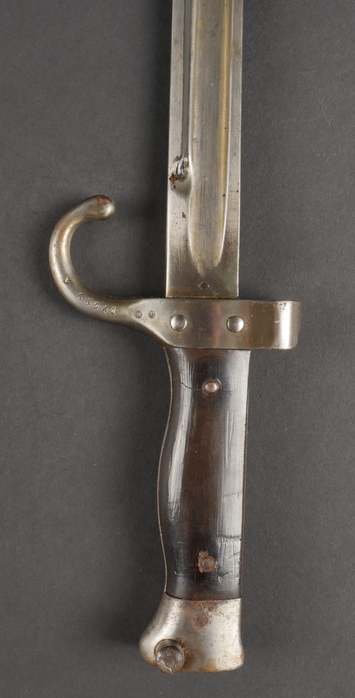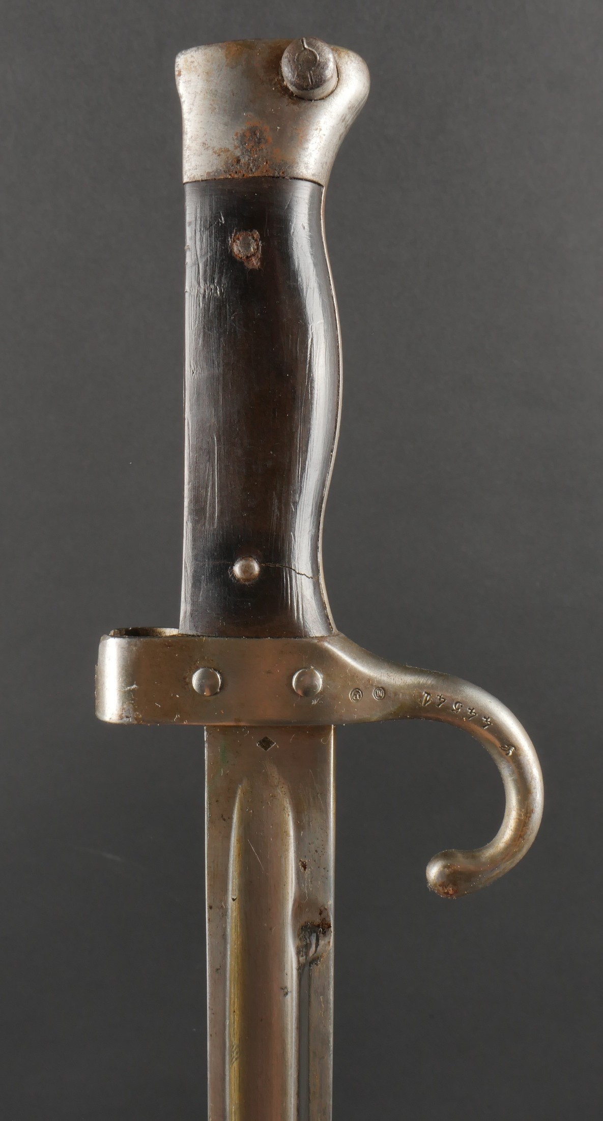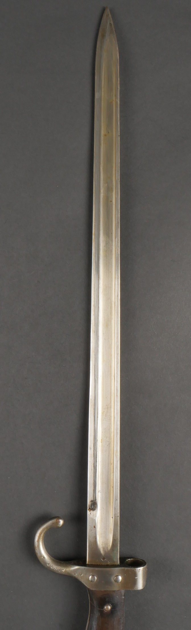 Baïonnette Berthier 1892. Poignée du premier type en corne, quillon long, lame dans sa longueur d’origine, bouton poussoir d’origine. Numéro de la baïonnette 44541, fourreau monté... en savoir plus