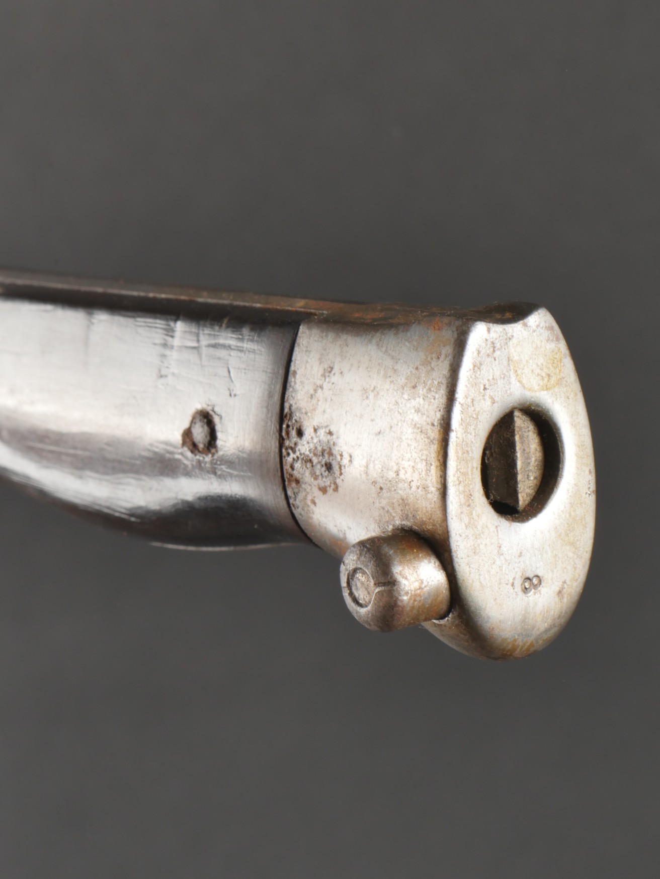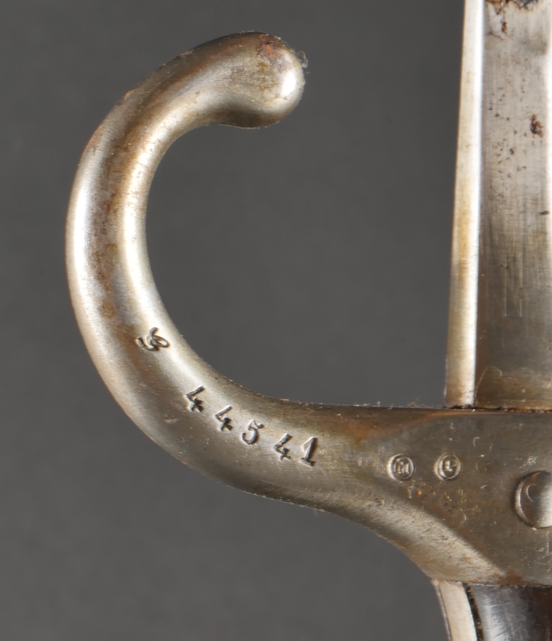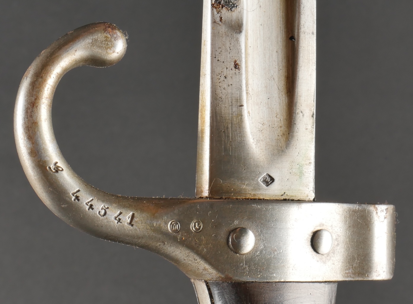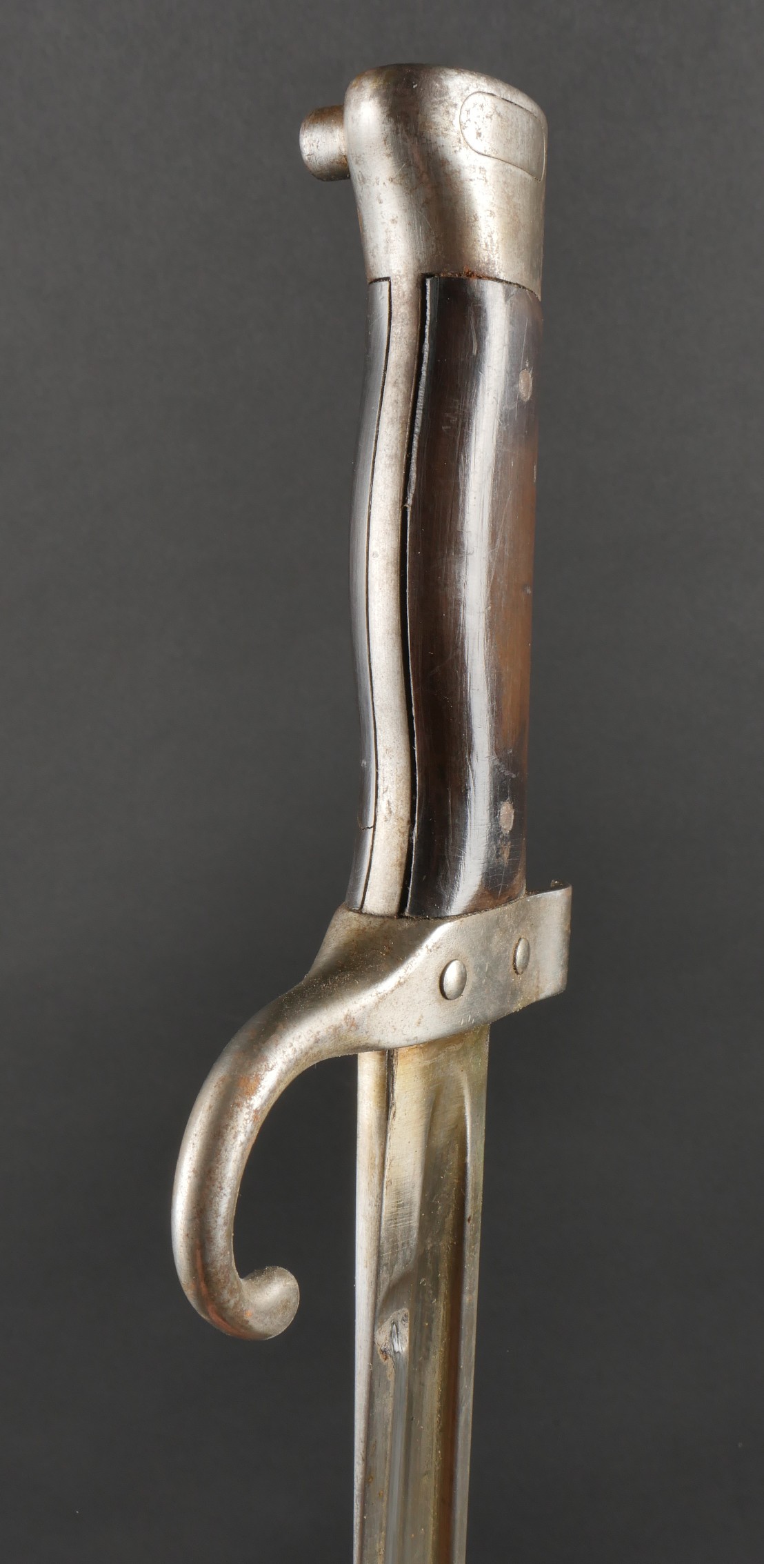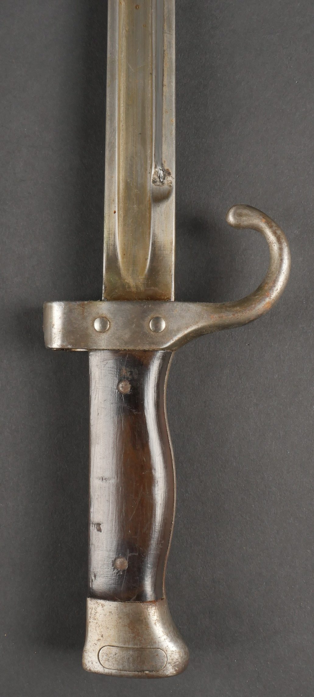Baïonnette Berthier 1892. Poignée du premier type en corne, quillon long, lame dans sa longueur d’origine, bouton poussoir d’origine. Numéro de la baïonnette 44541, fourreau monté... en savoir plus