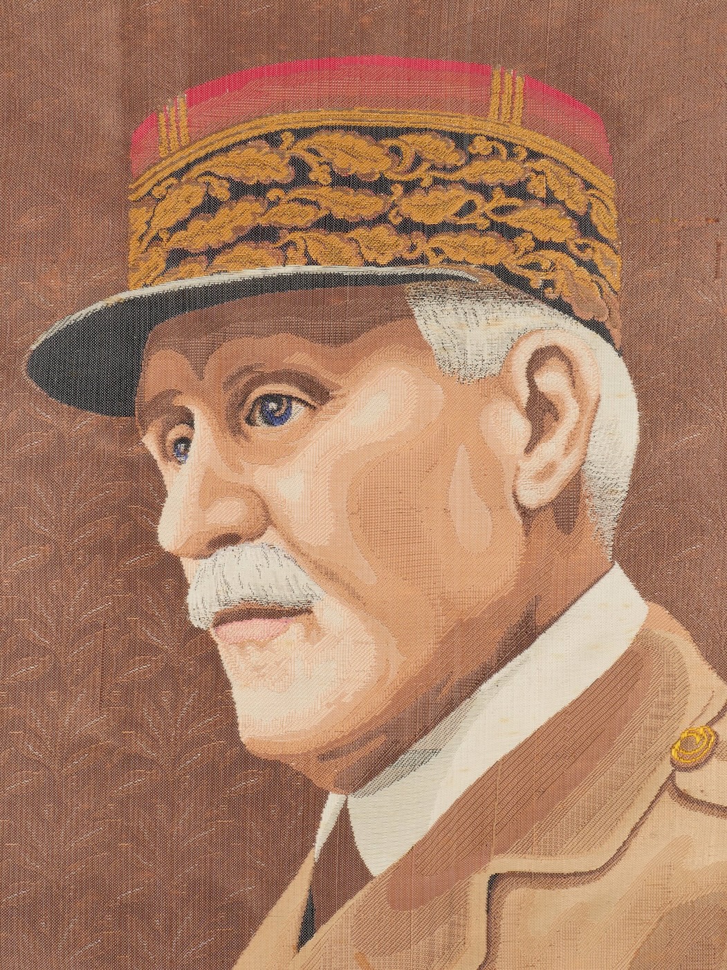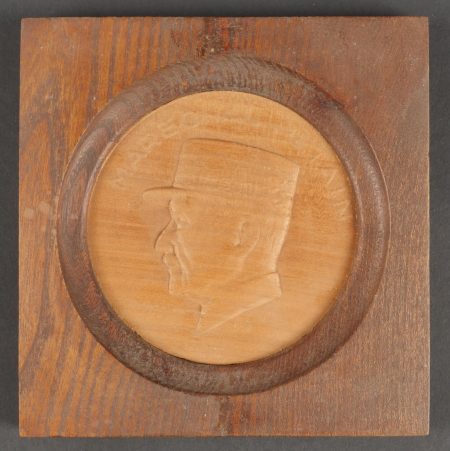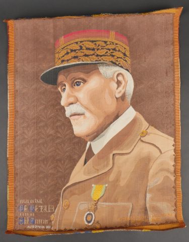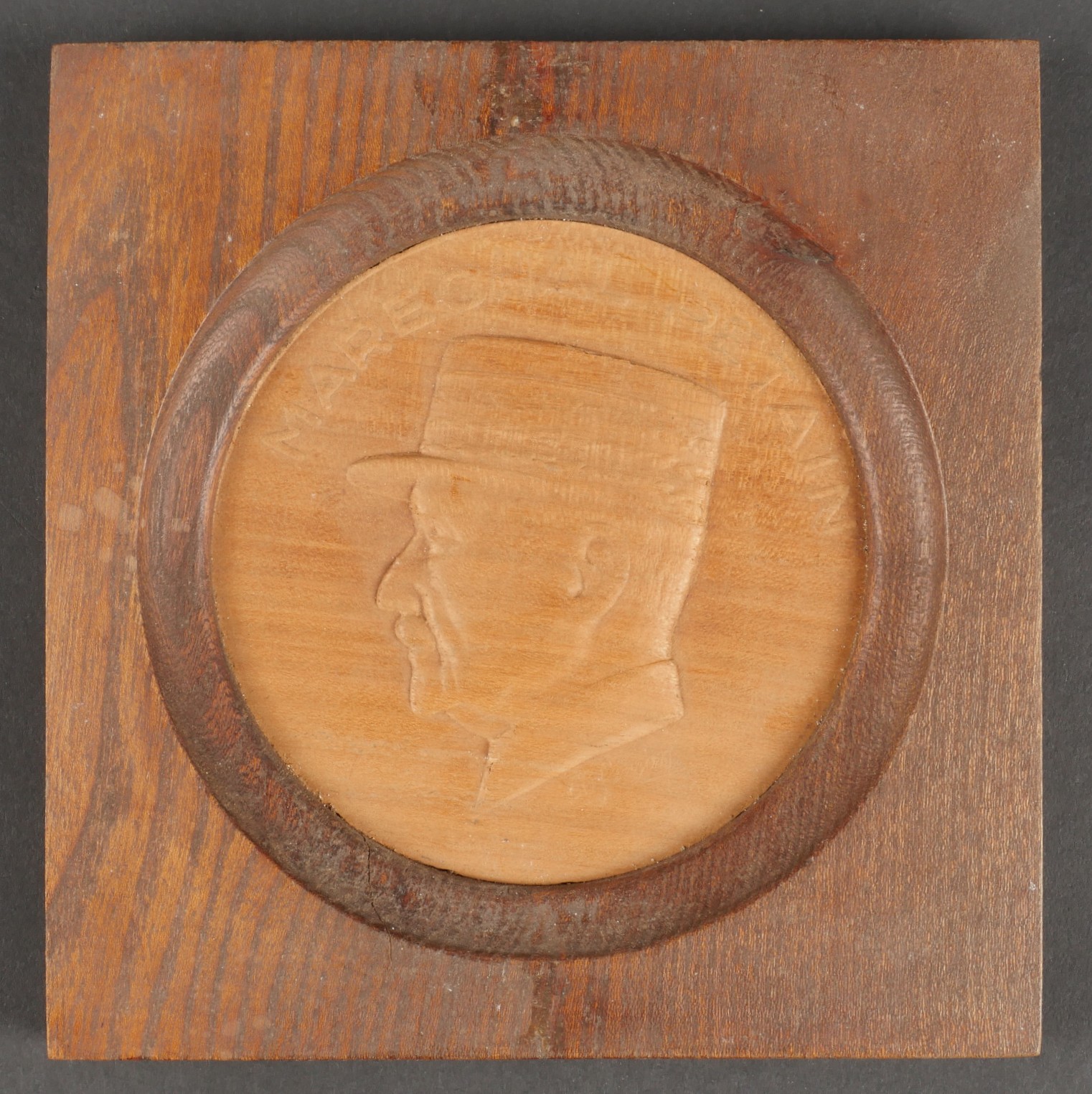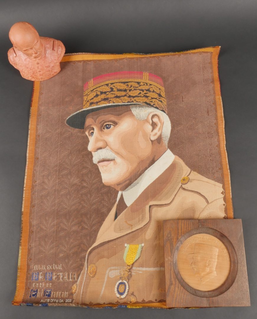 Ensemble à l’effigie du Maréchal. Buste en terre cuite à l’effigie du Maréchal sans képi, sur sa poitrine est gravé Ph Pétain. Signature du sculpteur au dos. Hauteur 13cm. On y joint une petit tapisserie à l’effigie du Maréchal, en couleurs, OA 203. Dimensions 41x53cm. Un médaillon en bois représentant un portrait du Maréchal. Dimensions du cadre 14,5x15cm. Set featuring the Marshal’s effigy. Terracotta bust of the Marshal without cap, chest inscribed “Ph Pétain,” sculptor’s signature on reverse height 13 cm, a small colored tapestry with his portrait OA 203, 41×53 cm, and a wooden medallion portrait frame 14.5×15 cm.
