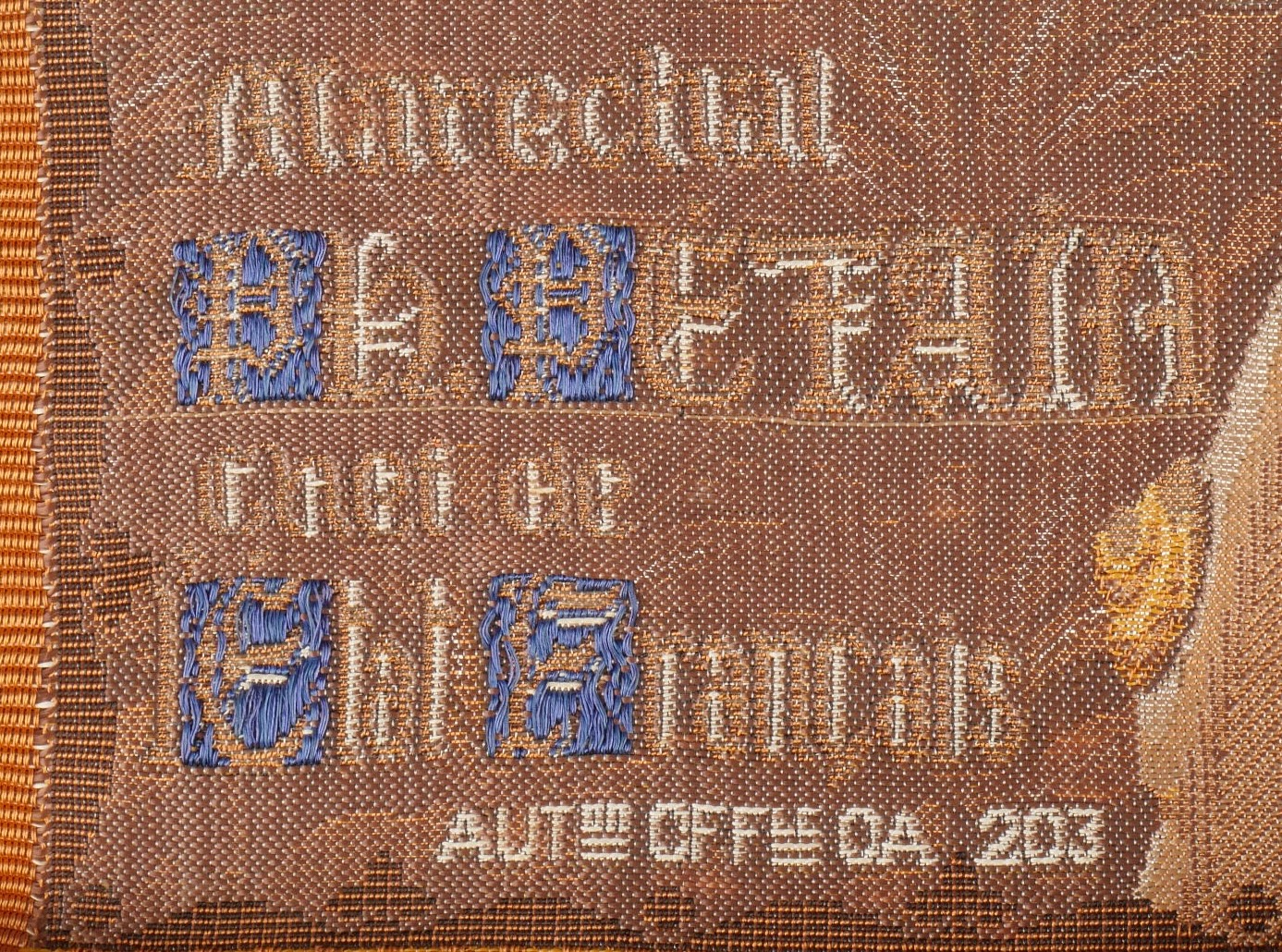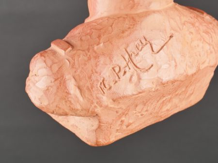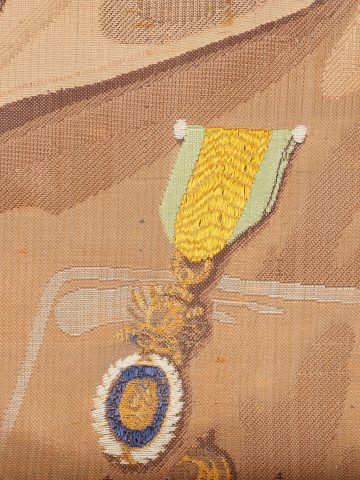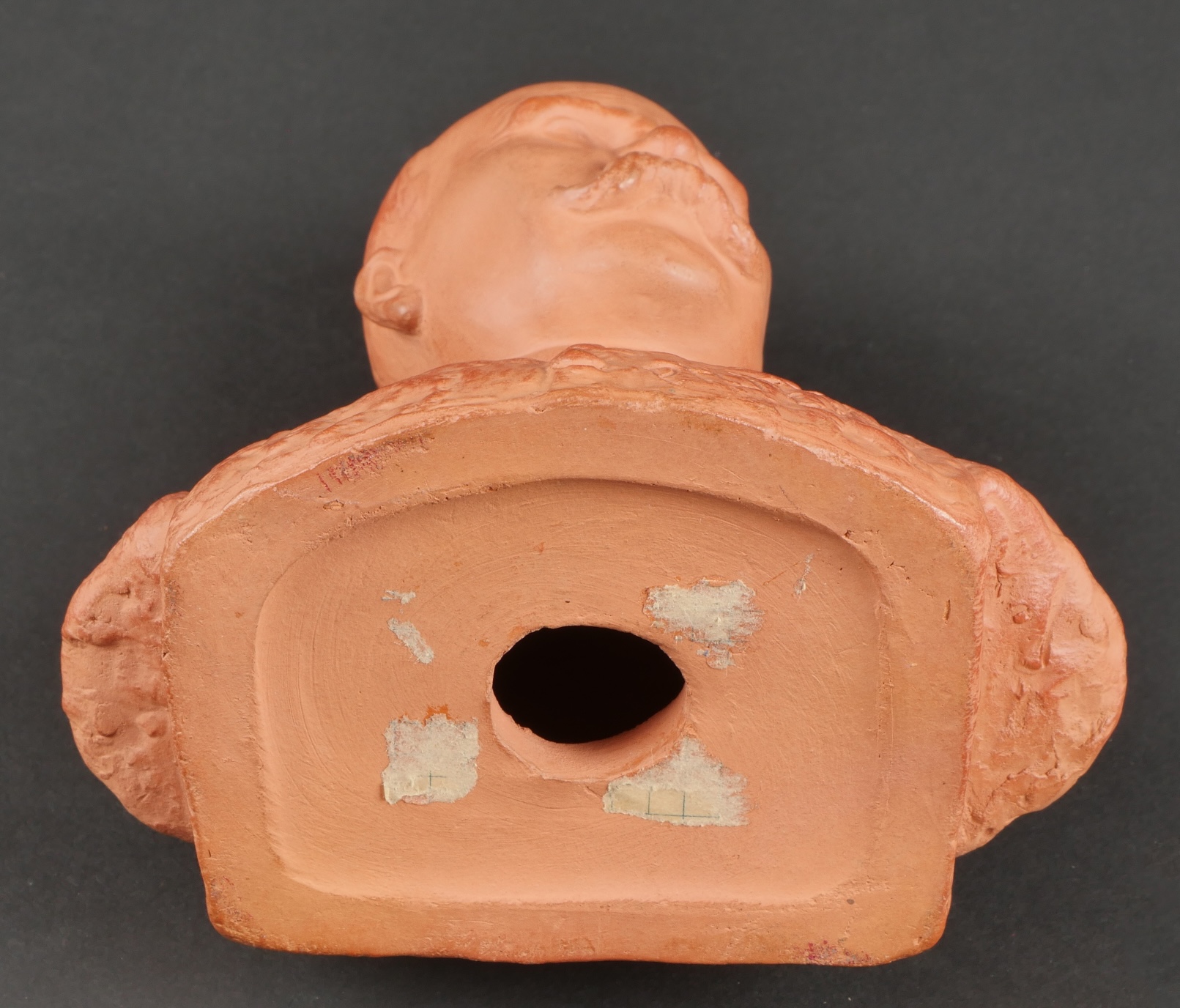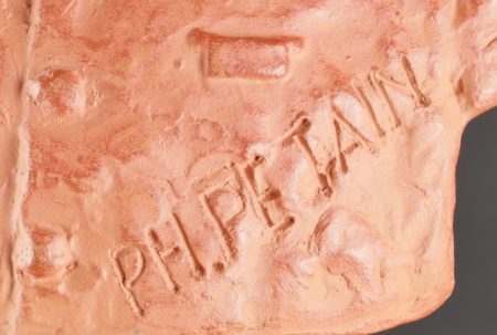 Ensemble à l’effigie du Maréchal. Buste en terre cuite à l’effigie du Maréchal sans képi, sur sa poitrine est gravé Ph Pétain. Signature du sculpteur au dos. Hauteur 13cm. On y joint une petit tapisserie à l’effigie du Maréchal, en couleurs, OA 203. Dimensions 41x53cm. Un médaillon en bois représentant un portrait du Maréchal. Dimensions du cadre 14,5x15cm. Set featuring the Marshal’s effigy. Terracotta bust of the Marshal without cap, chest inscribed “Ph Pétain,” sculptor’s signature on reverse height 13 cm, a small colored tapestry with his portrait OA 203, 41×53 cm, and a wooden medallion portrait frame 14.5×15 cm.