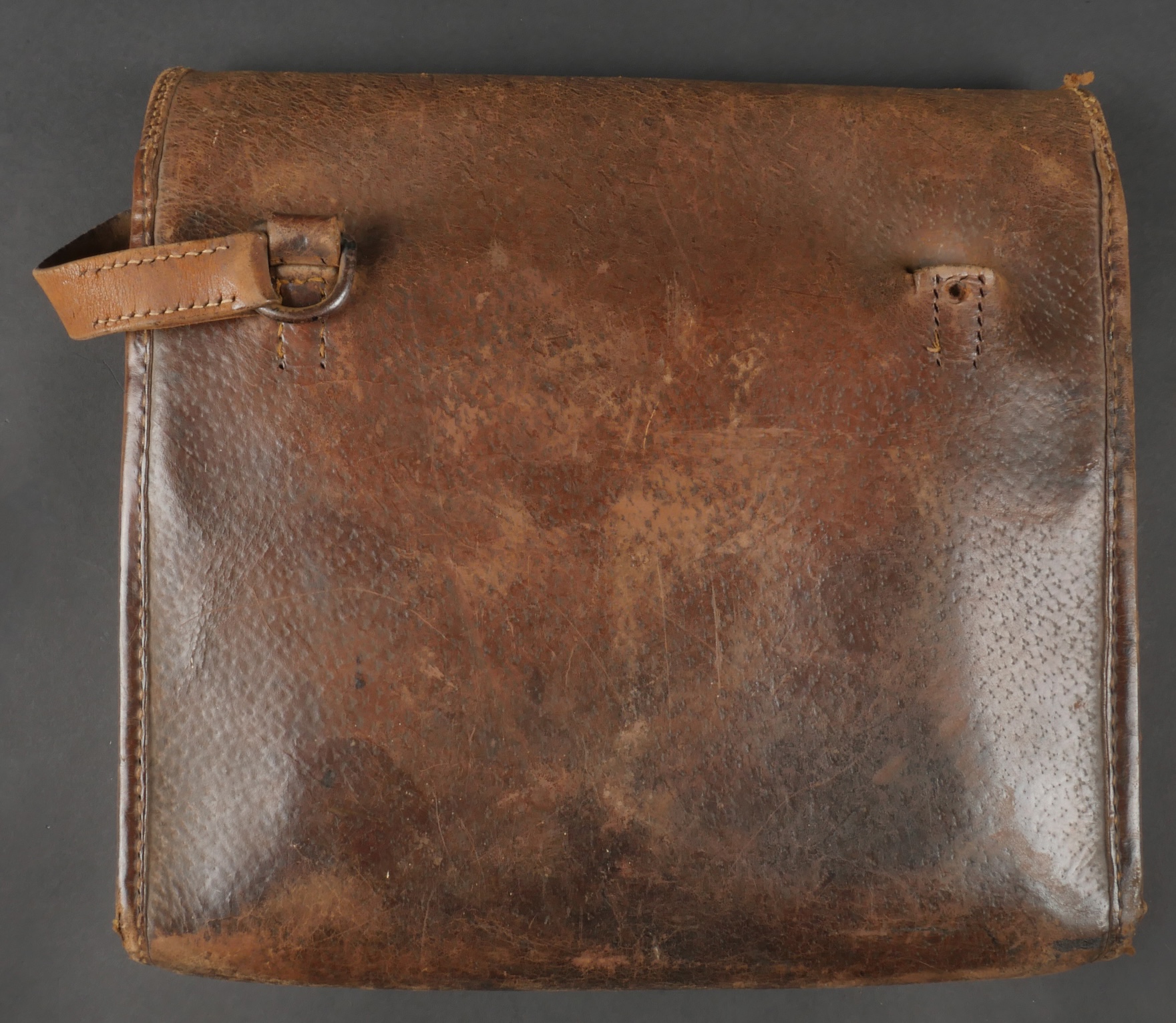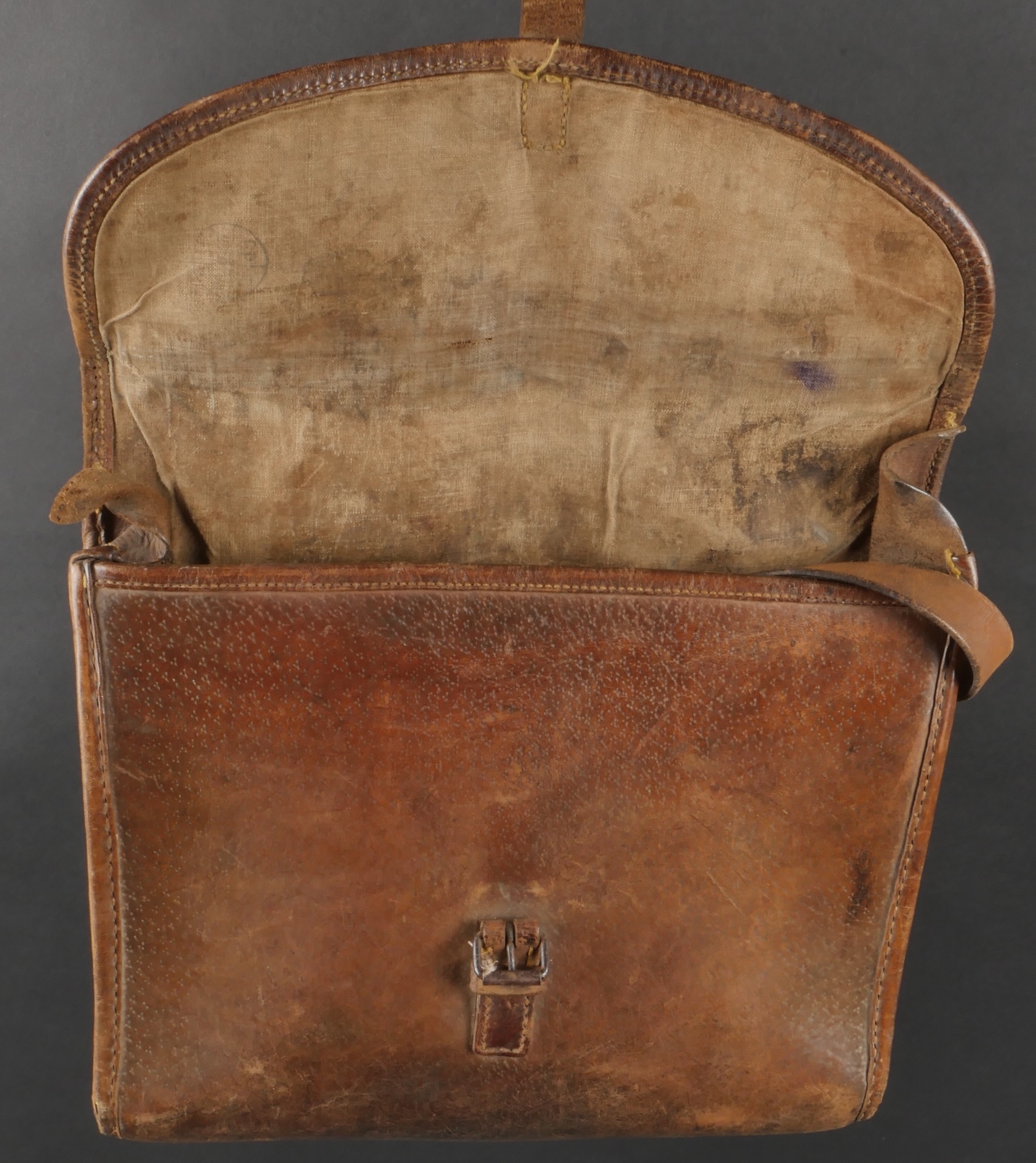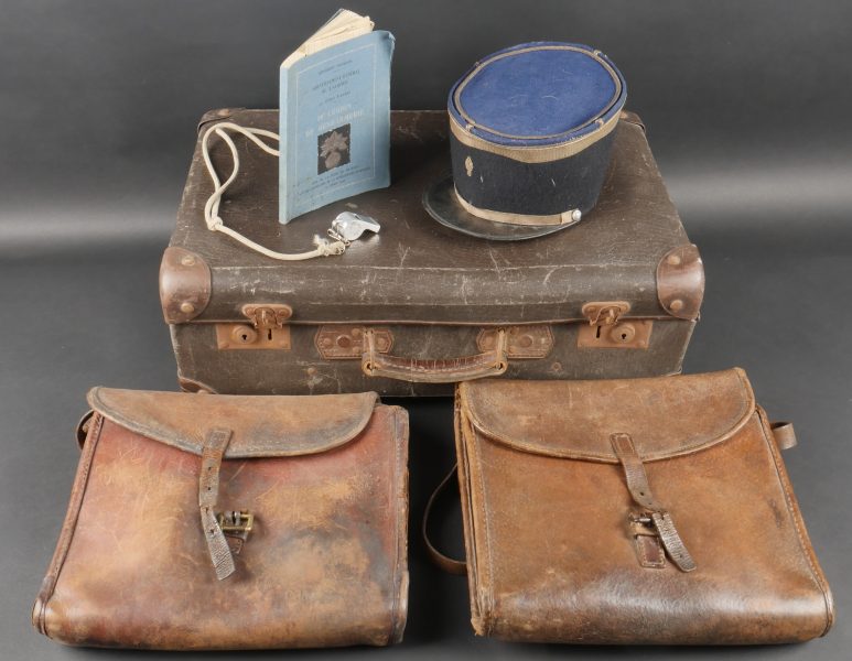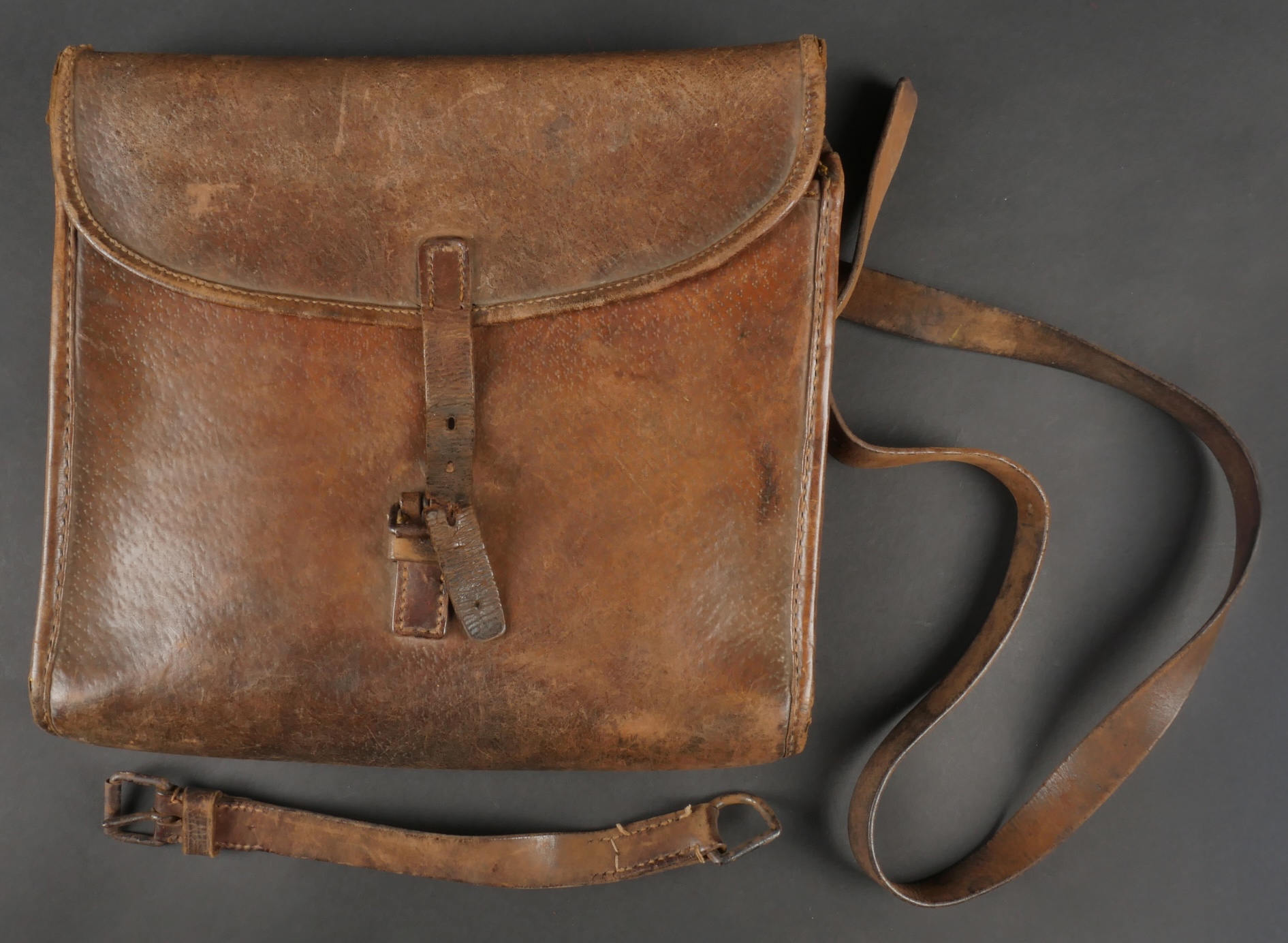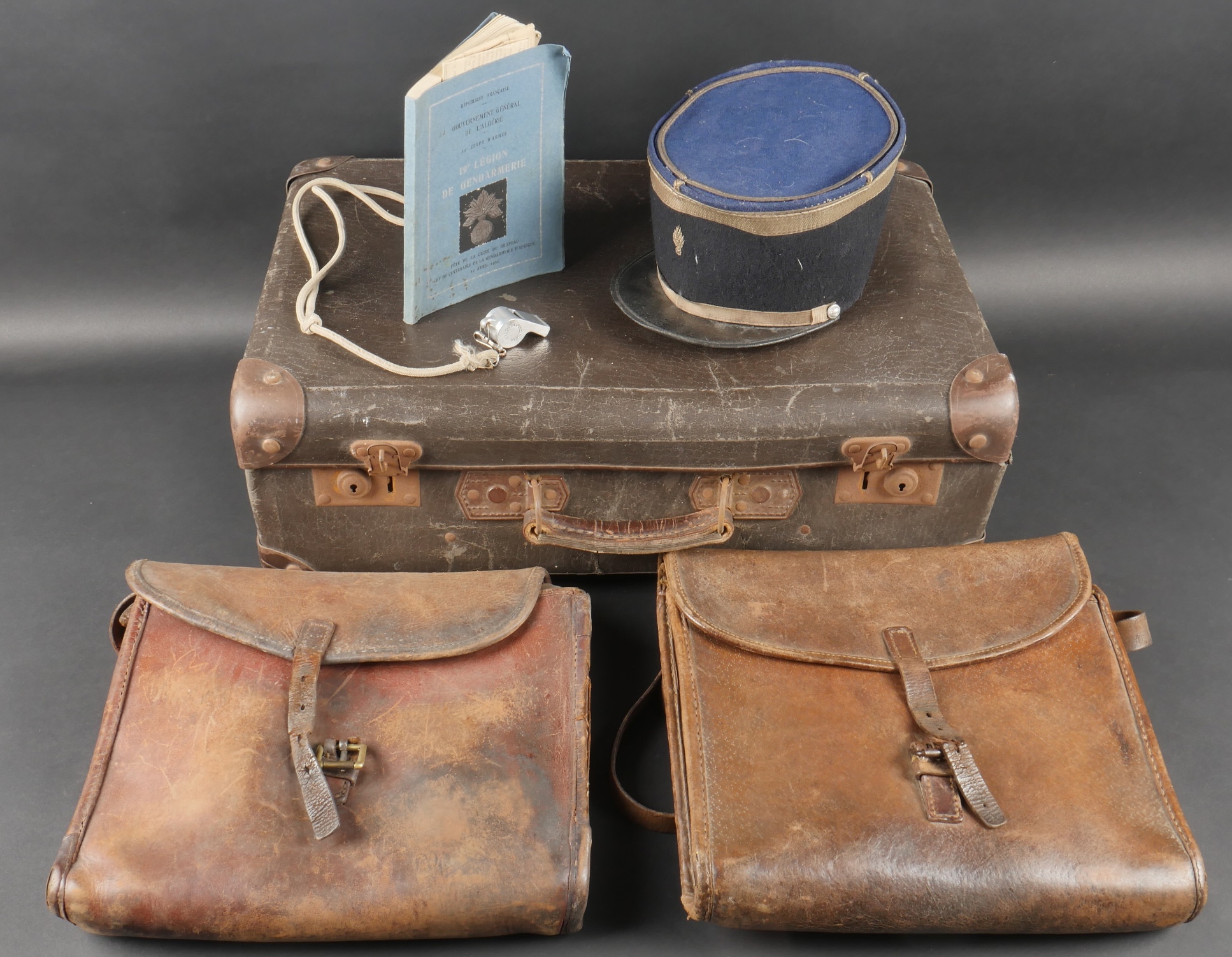 Lot Gendarme GMA VosgesFFI. Comprenant une sacoche réglementaire de gendarme en cuir brun doublé de toile écrue, sangle de fermeture accidentée contenant un manuel daté 1939 de la 19ème... en savoir plus