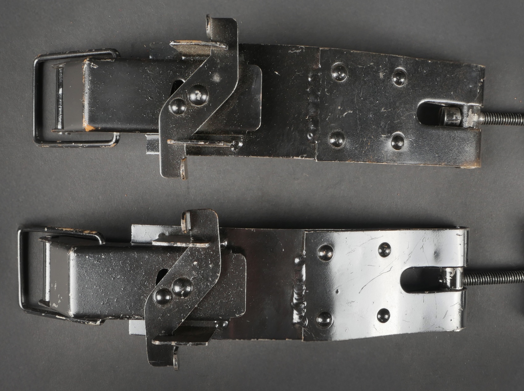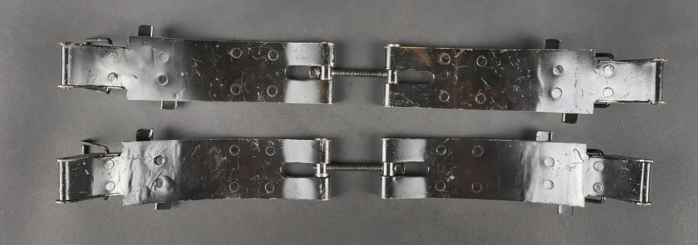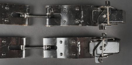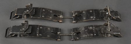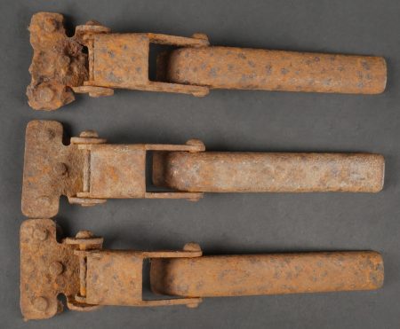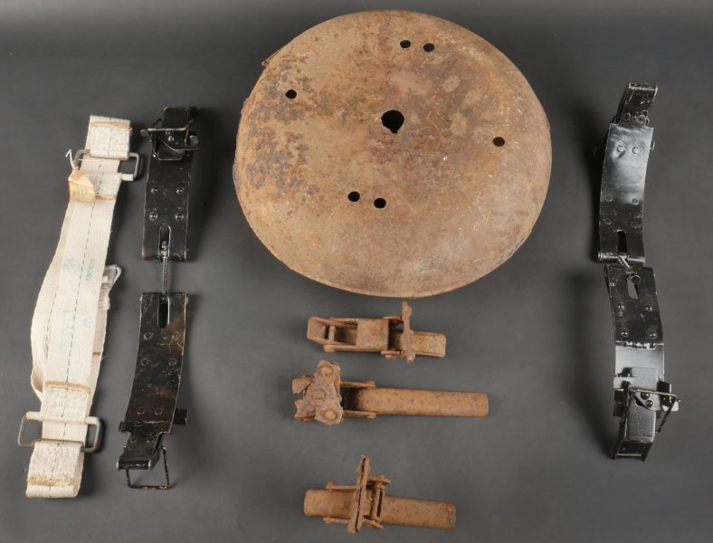 Accessoires de container type C. Comprenant trois crochets de container fortement oxydés mais fonctionnels. Un tampon amortisseur de container fortement oxydé et présentant quelques manques.... en savoir plus