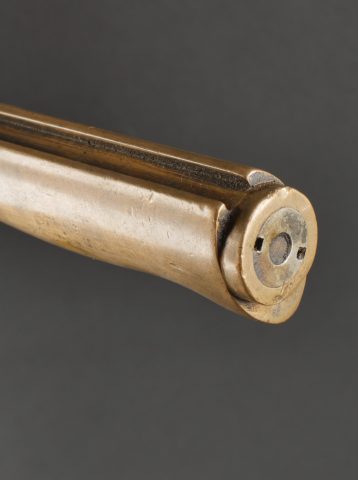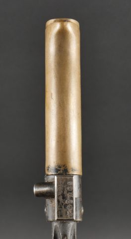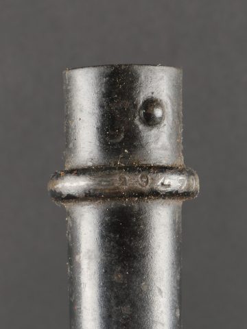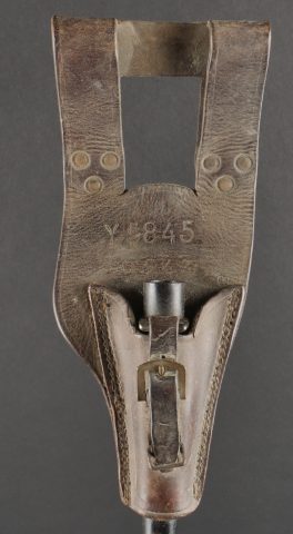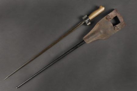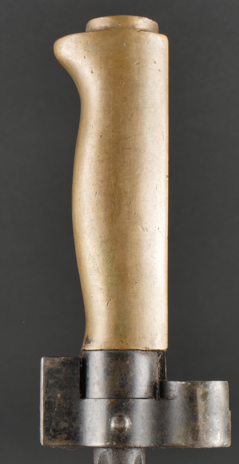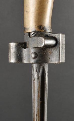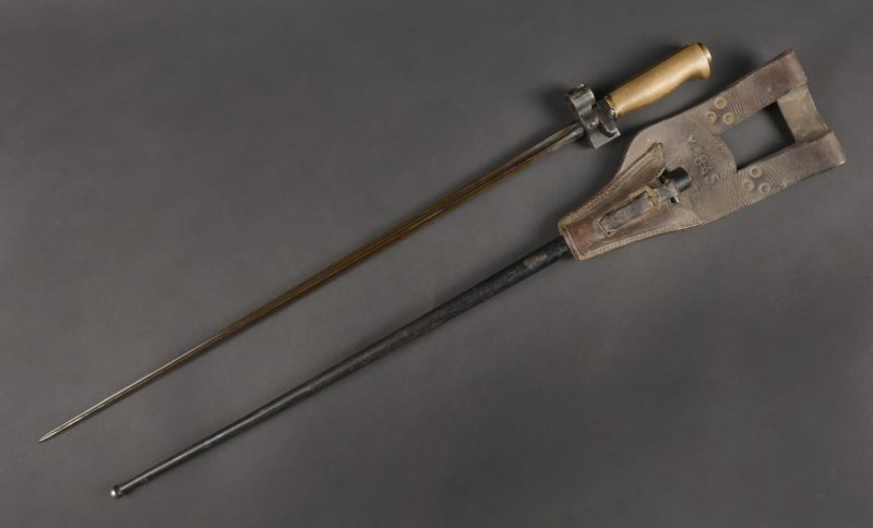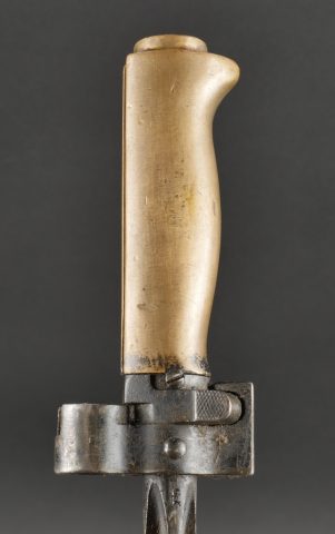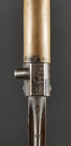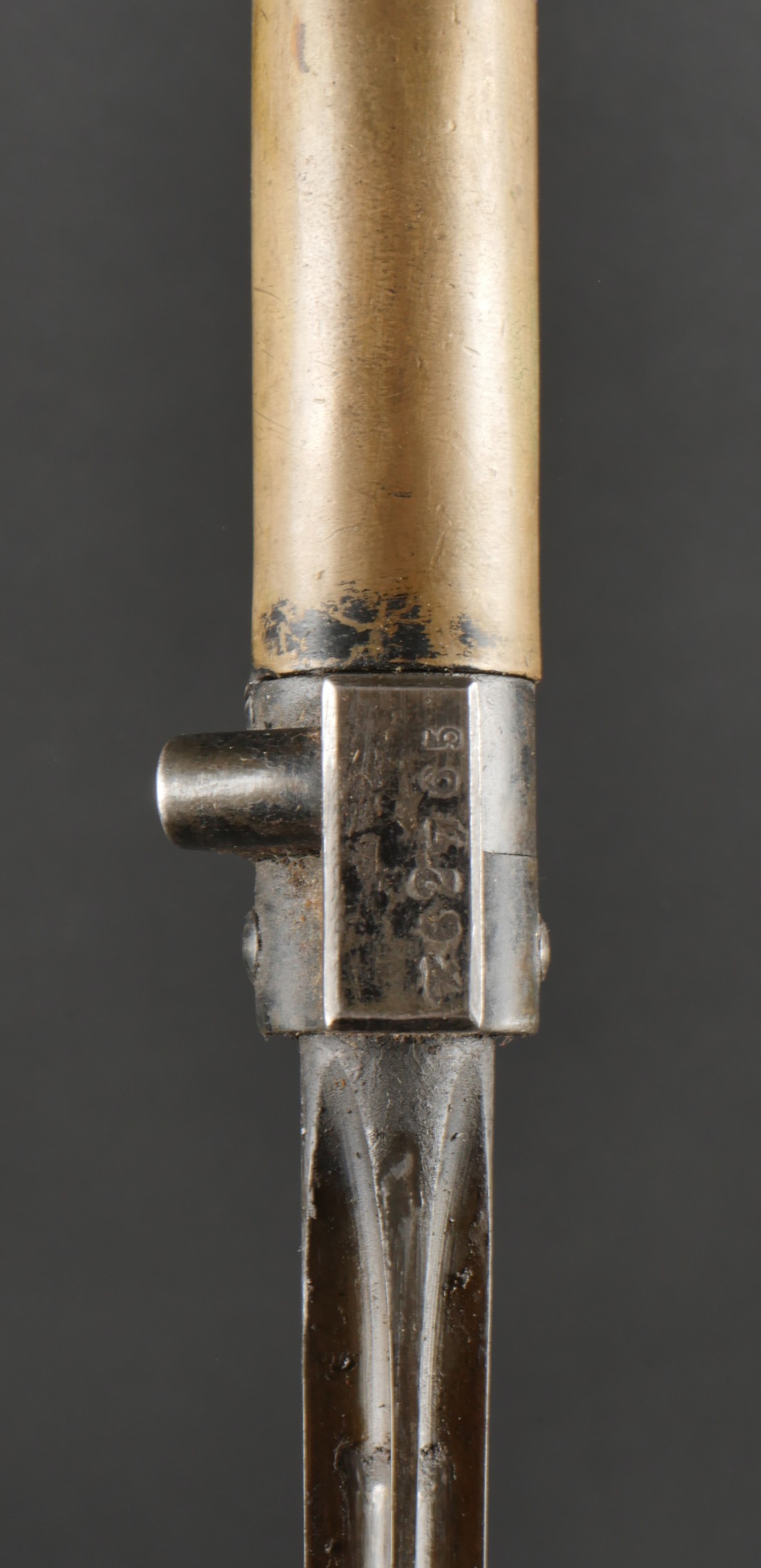 Baïonnette Lebel 1886. Modèle simplifié, poignée en laiton, lame dans sa longueur d’origine et dans son bronzage. Numéro 62765, bouton poussoir fonctionnel. Fourreau en peinture noir... en savoir plus